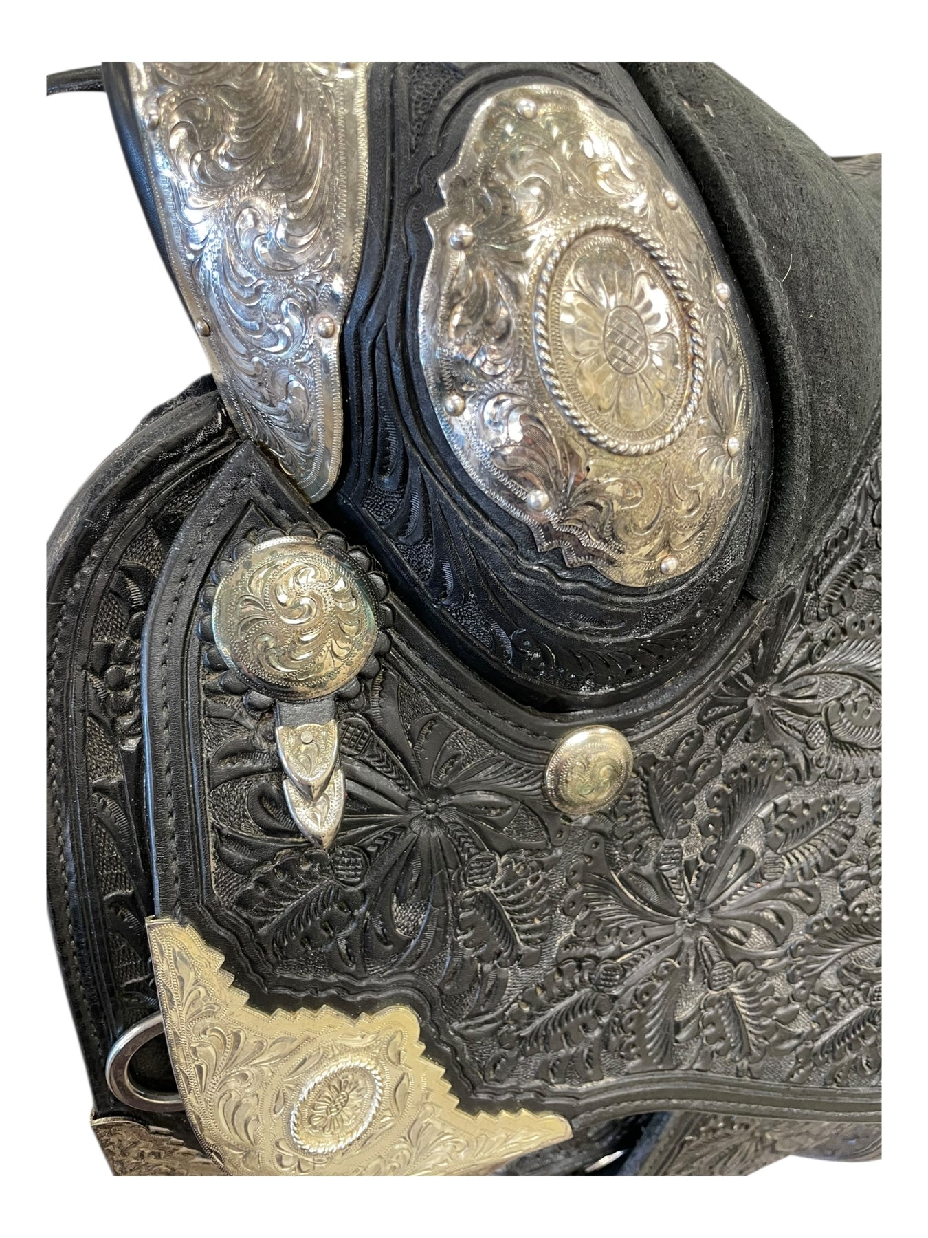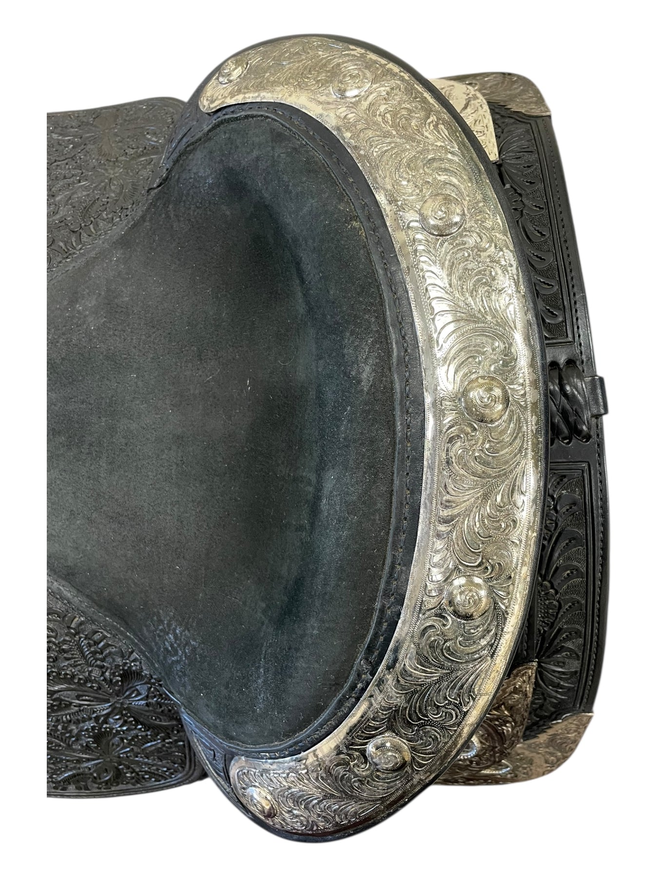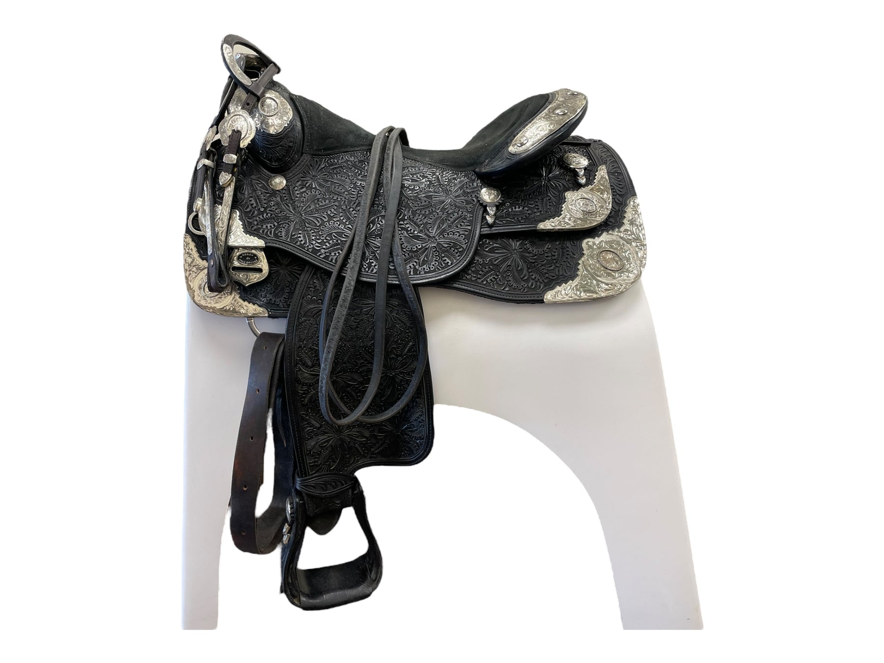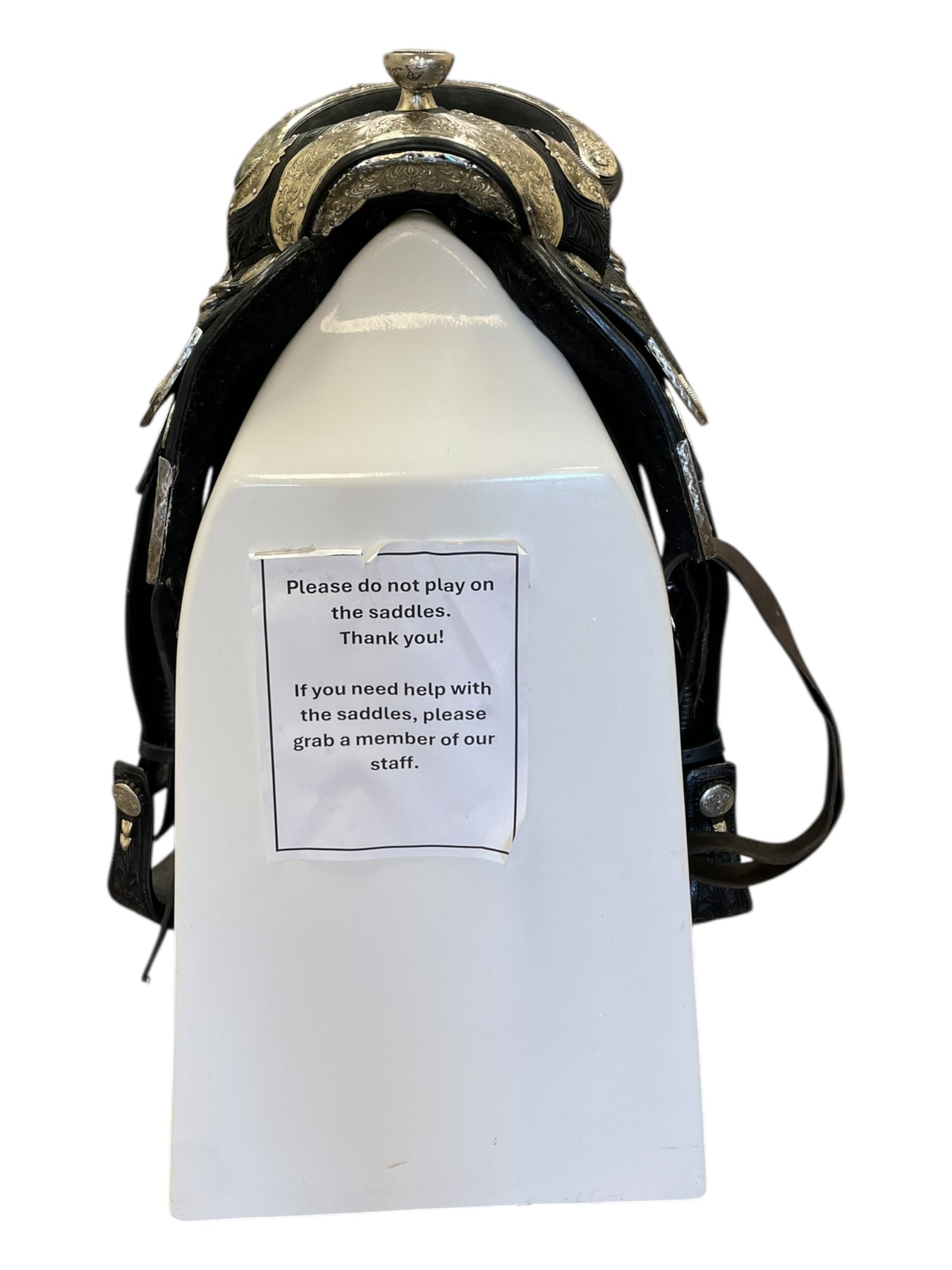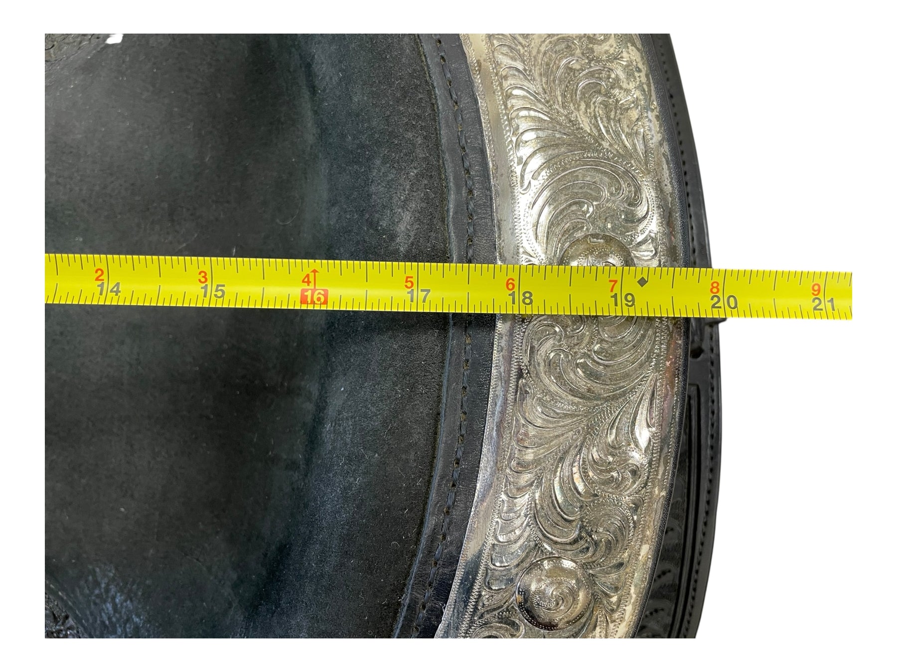 Pre-owned saddle for sale. This saddle is in good condition overall and shows light to regular wear. The seat shows some lightening in color, and has smoothed out in areas. Silver is moderately tarnished. The saddle case has a small hole in it.