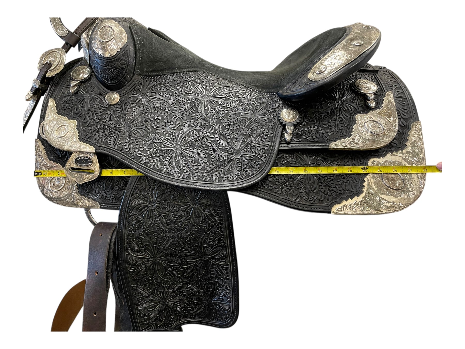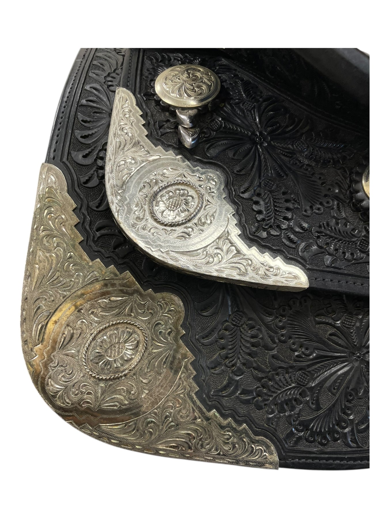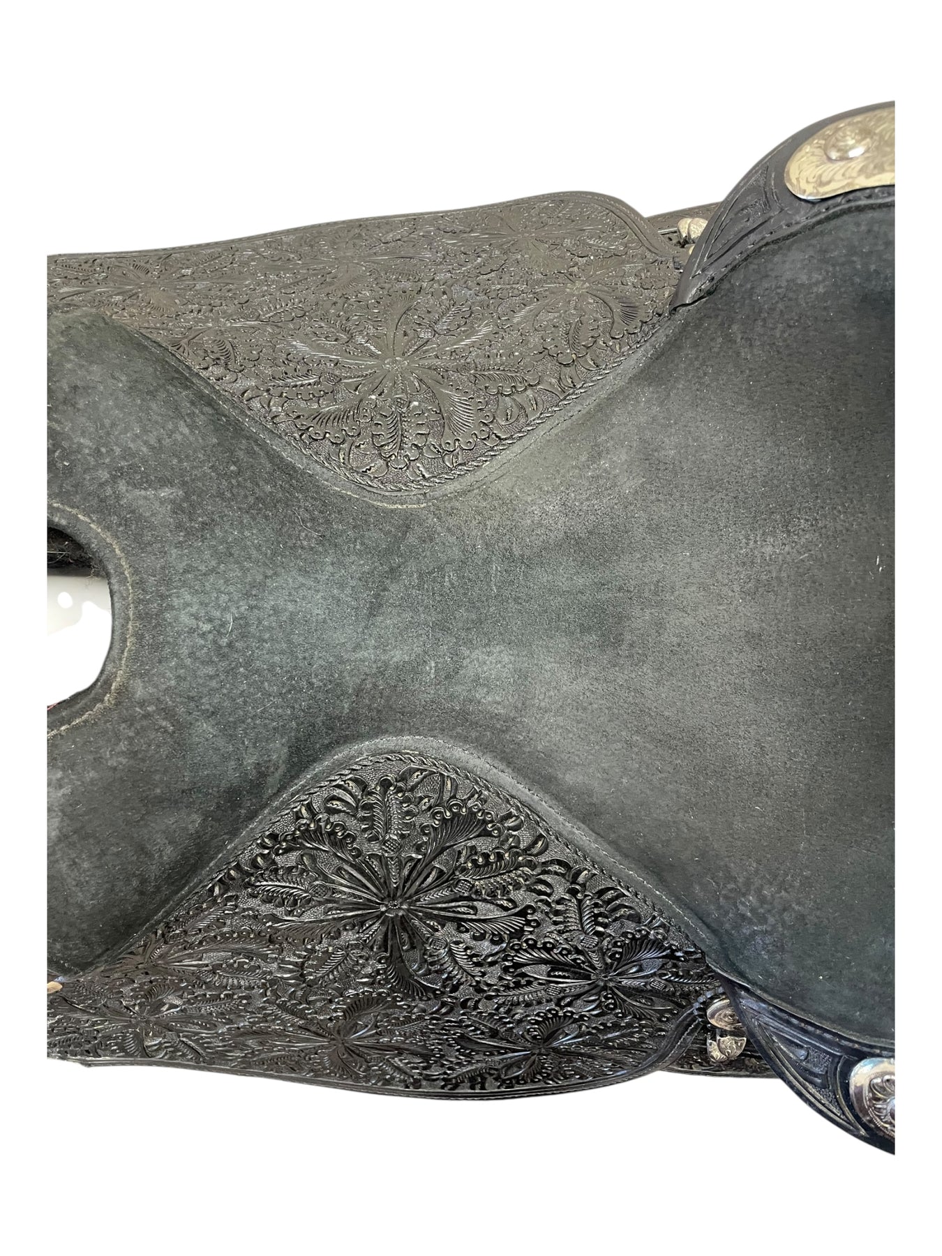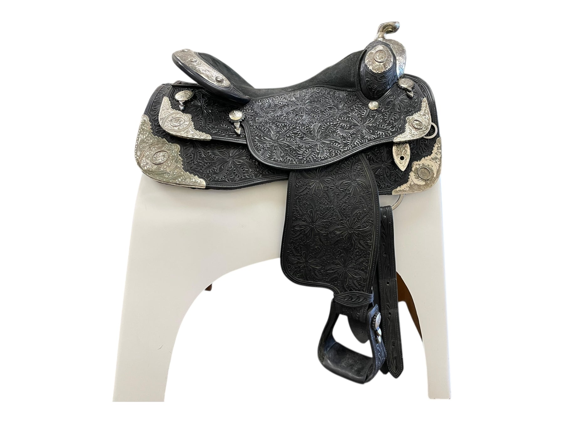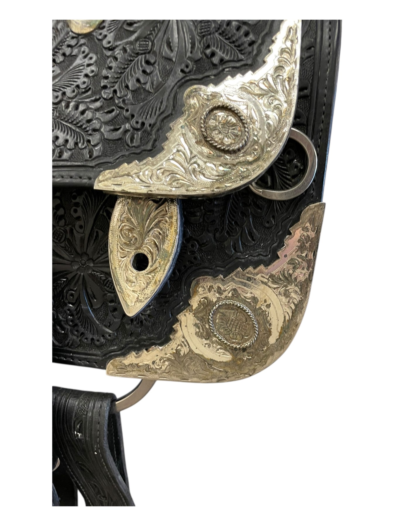 Pre-owned saddle for sale. This saddle is in good condition overall and shows light to regular wear. The seat shows some lightening in color, and has smoothed out in areas. Silver is moderately tarnished. The saddle case has a small hole in it.