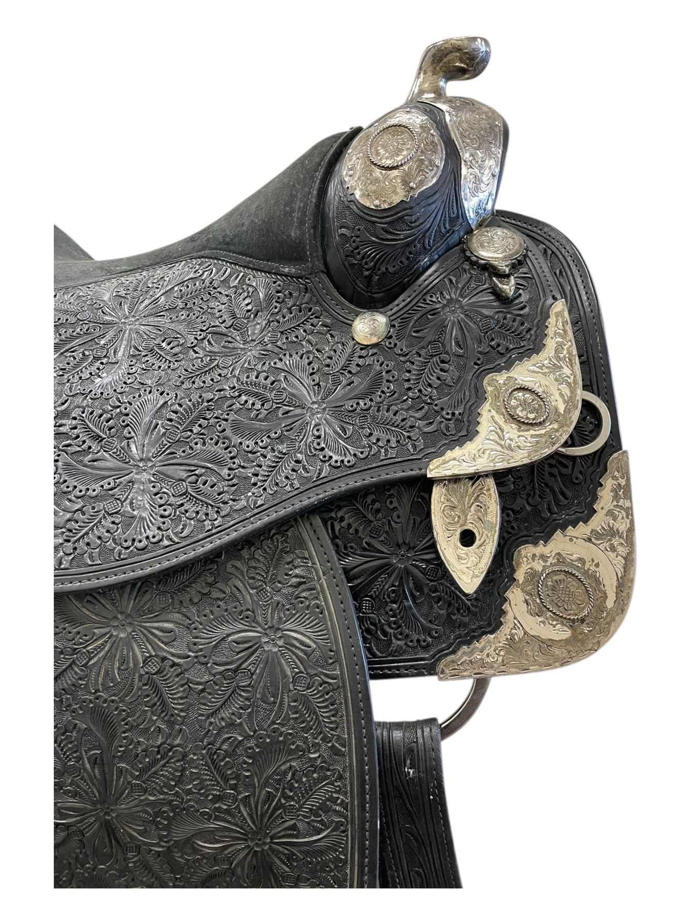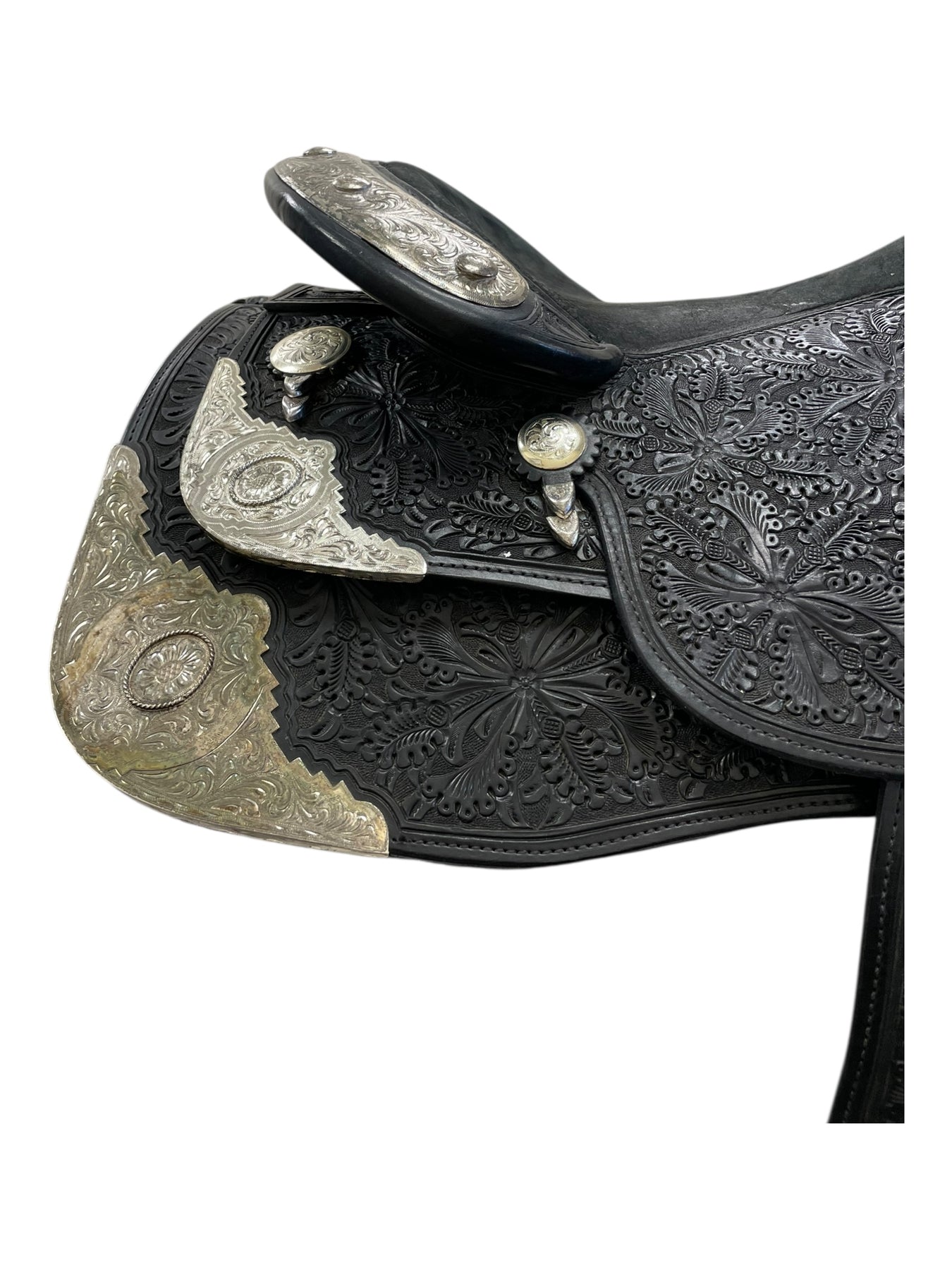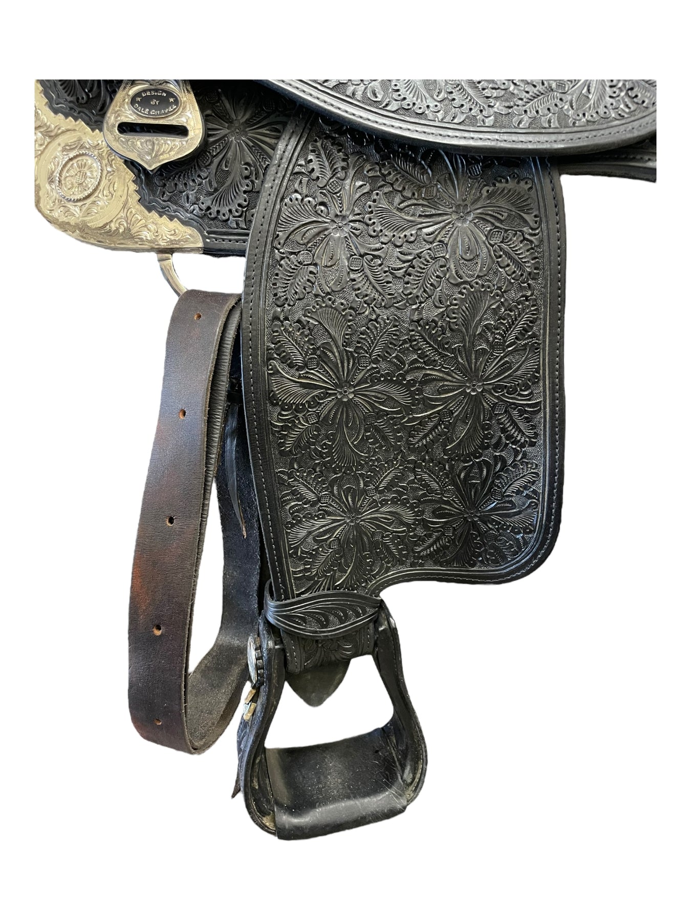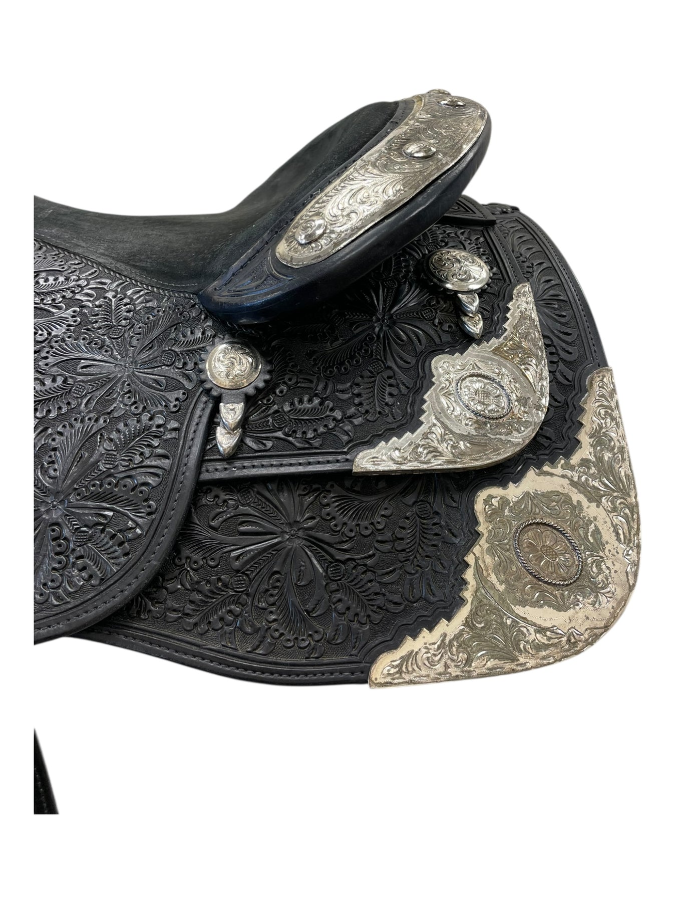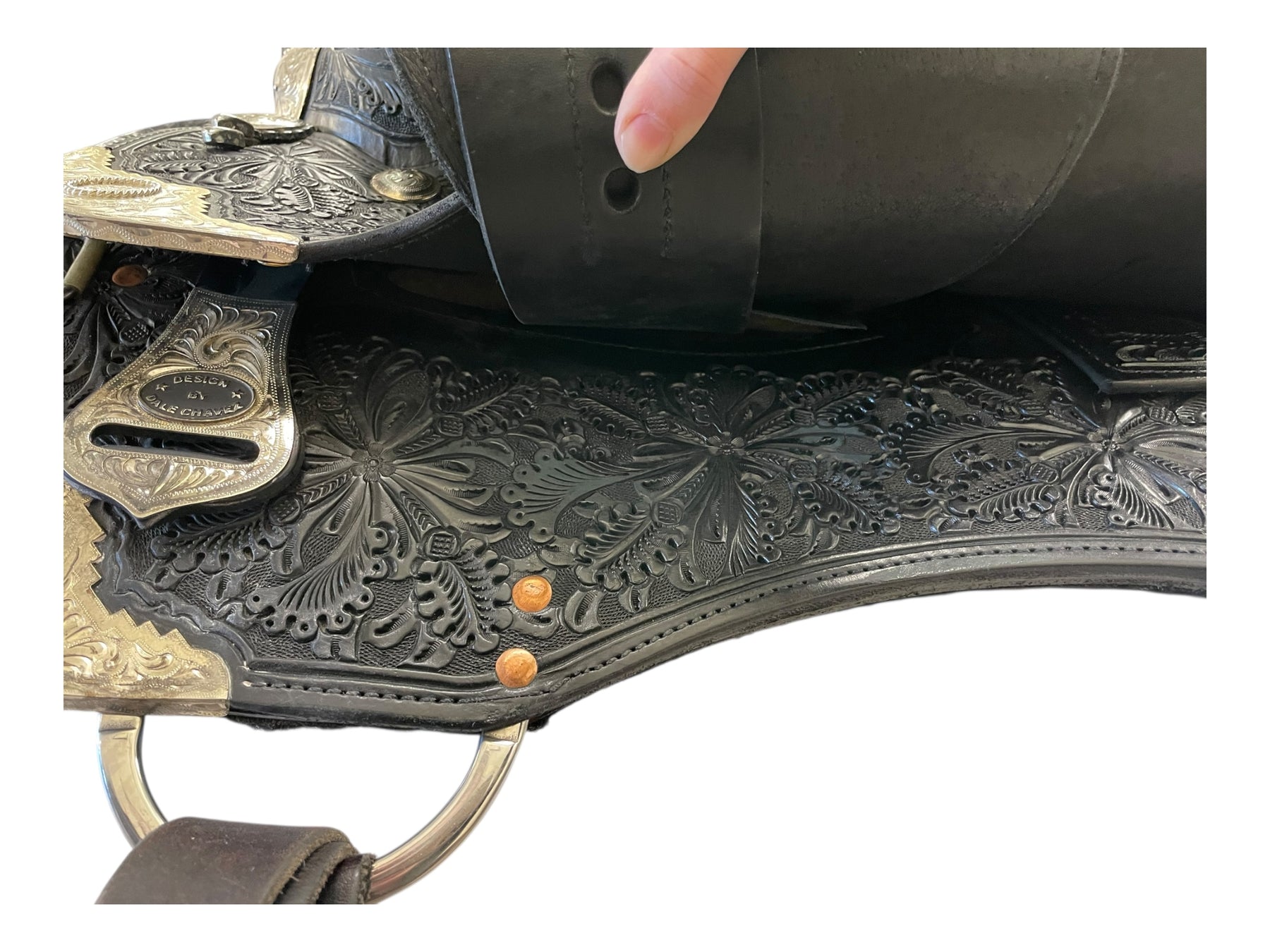 Pre-owned saddle for sale. This saddle is in good condition overall and shows light to regular wear. The seat shows some lightening in color, and has smoothed out in areas. Silver is moderately tarnished. The saddle case has a small hole in it.