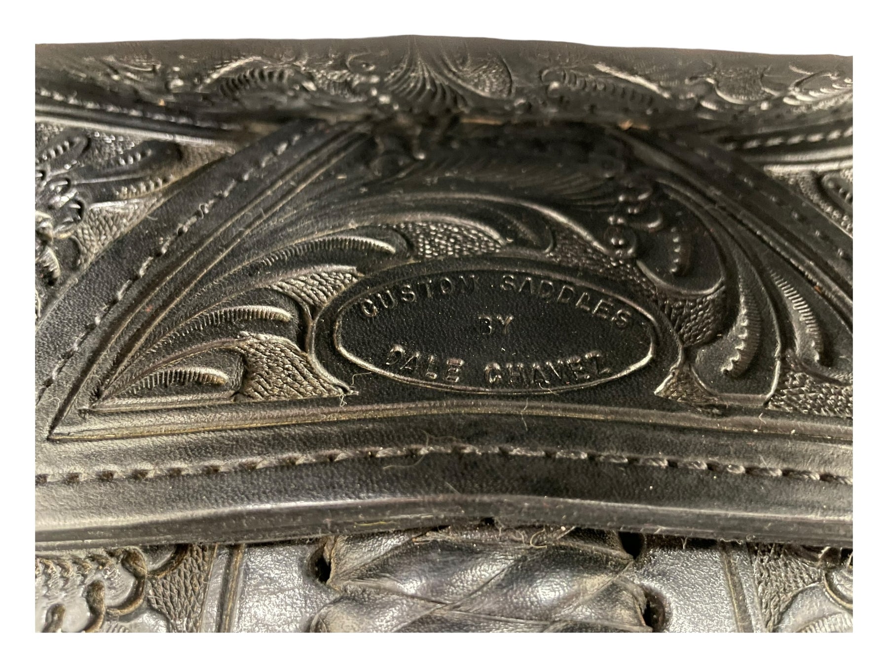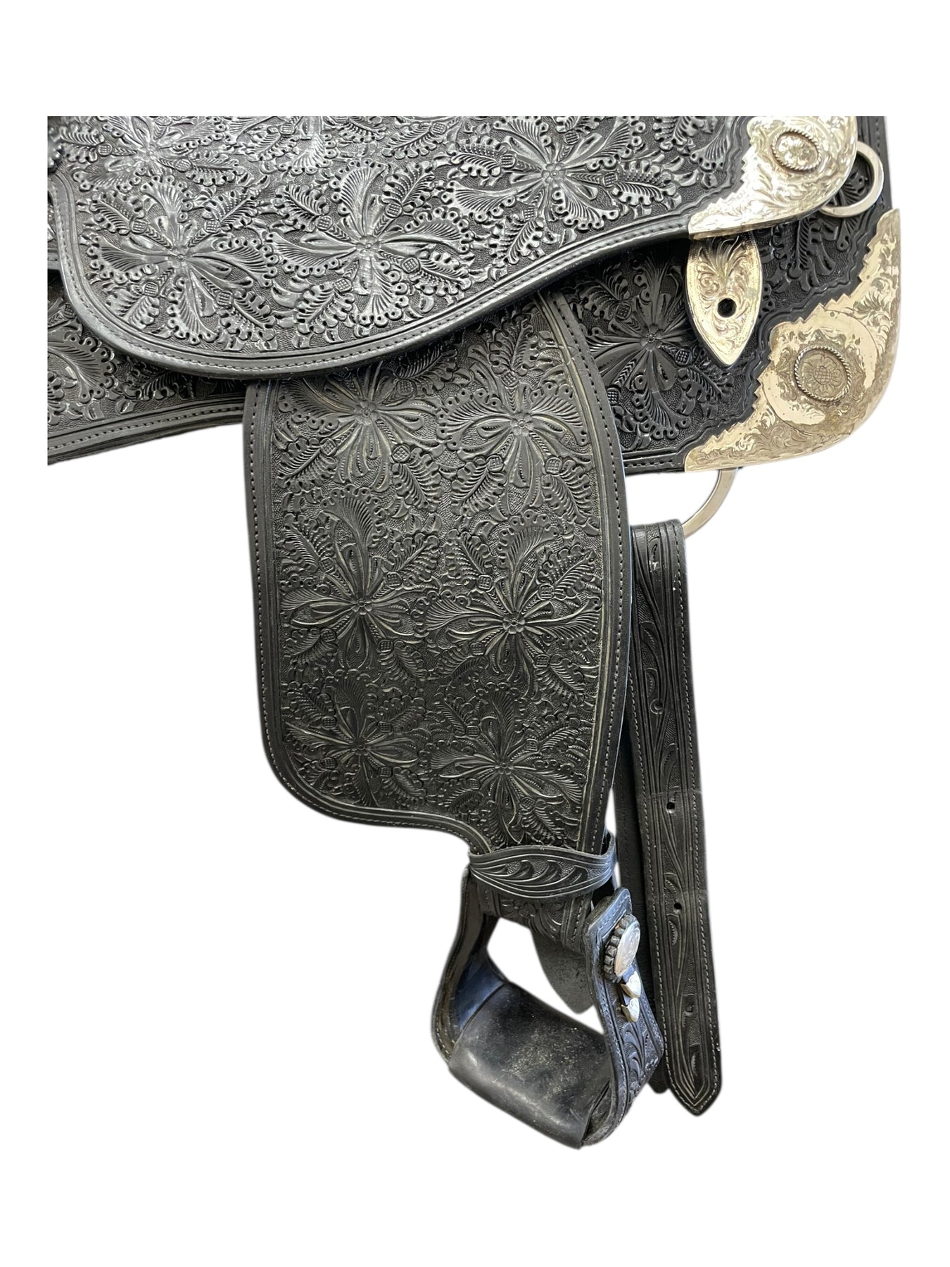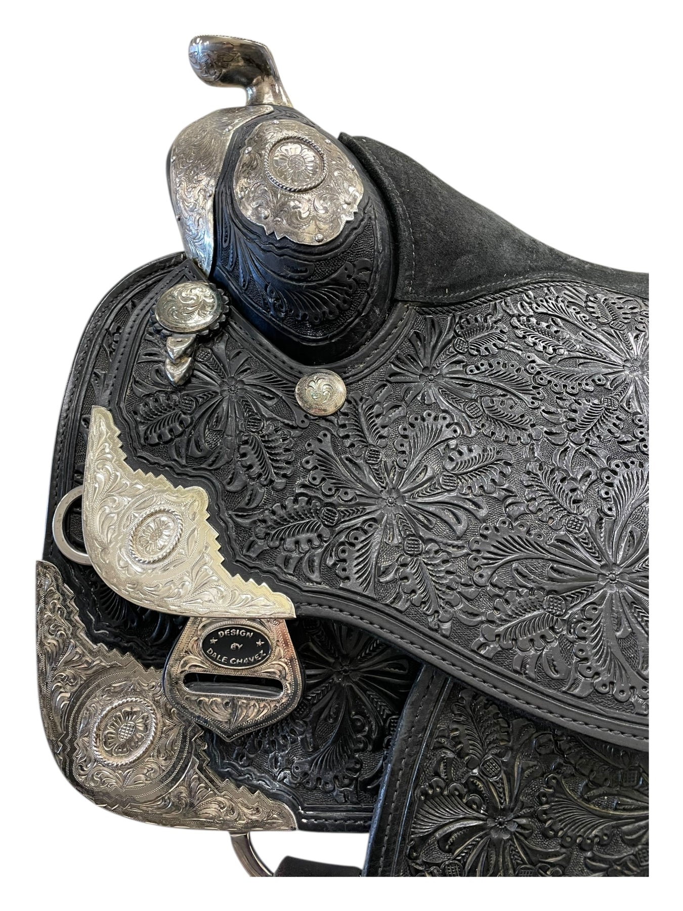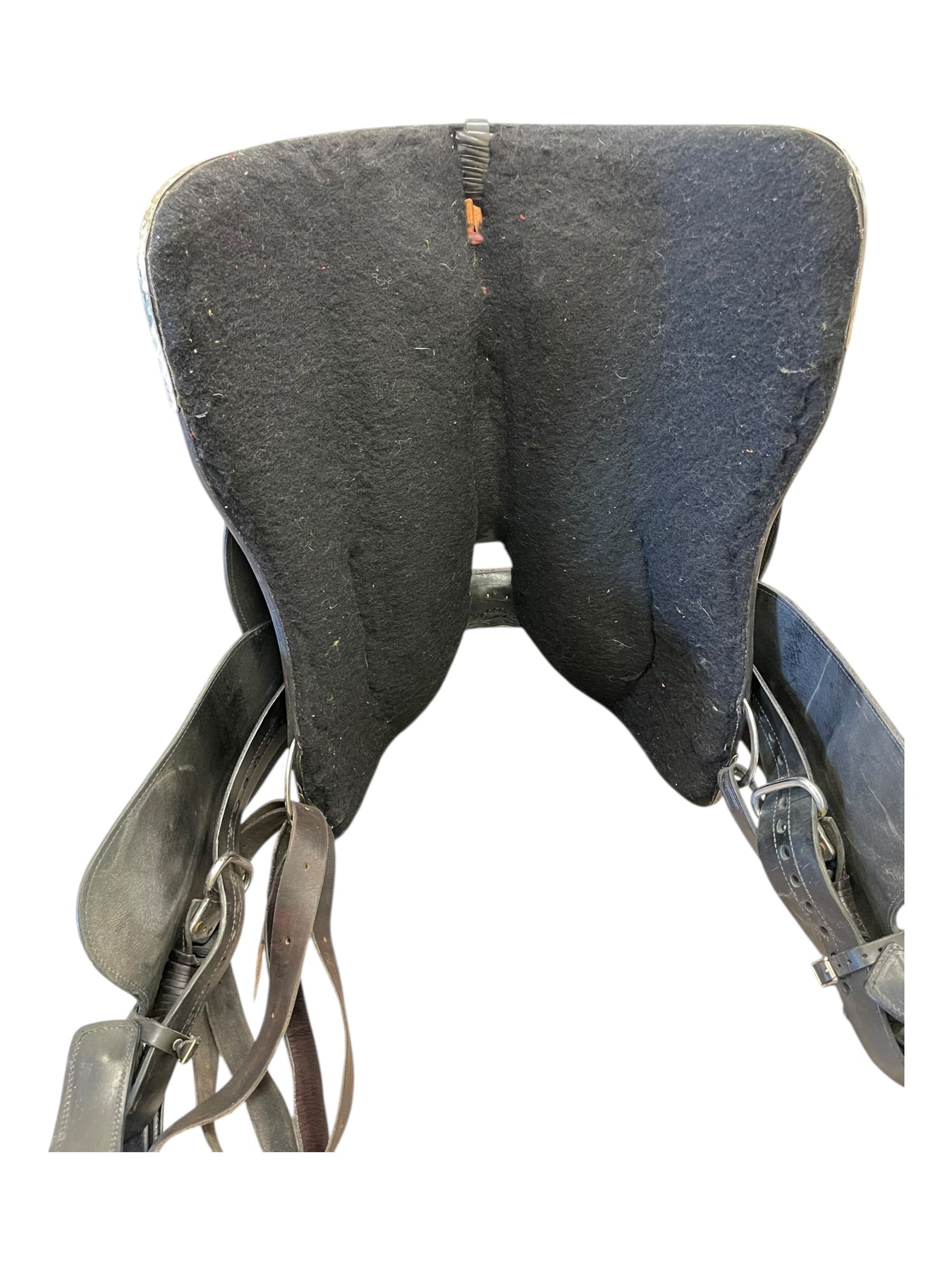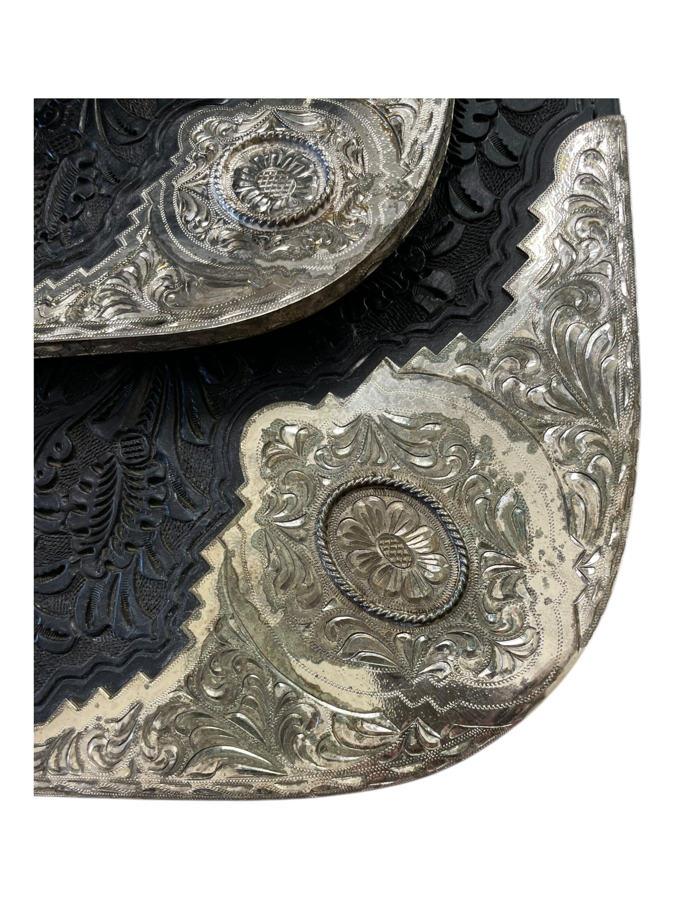 Pre-owned saddle for sale. This saddle is in good condition overall and shows light to regular wear. The seat shows some lightening in color, and has smoothed out in areas. Silver is moderately tarnished. The saddle case has a small hole in it.