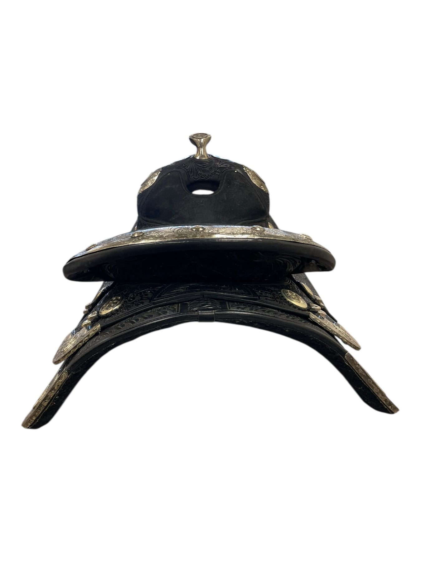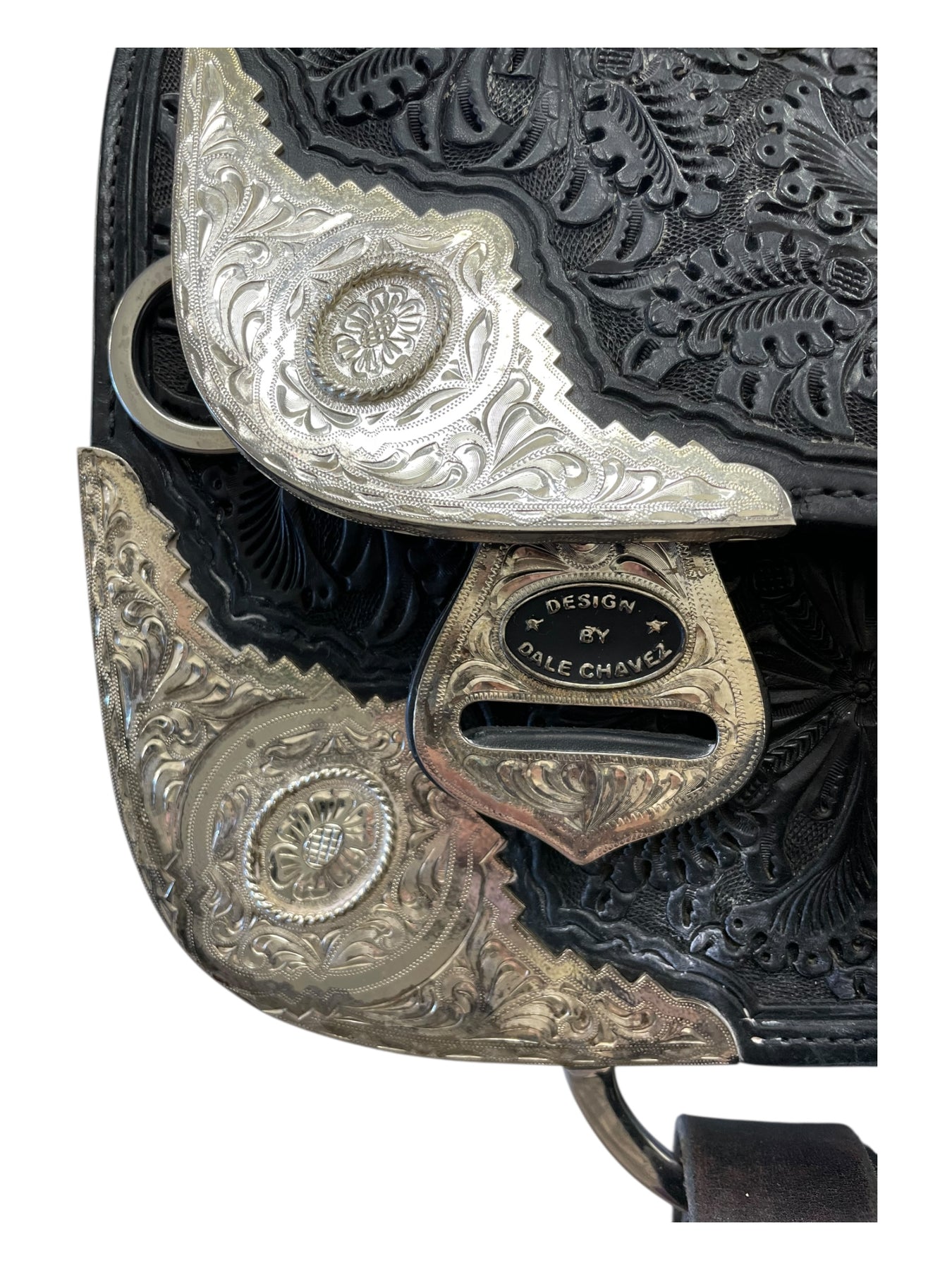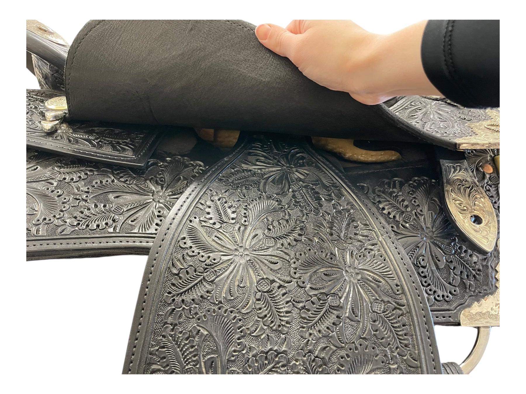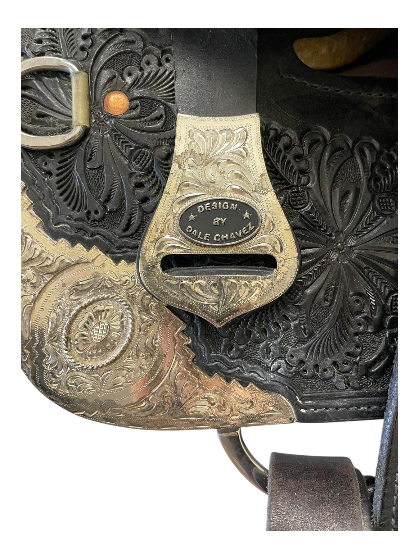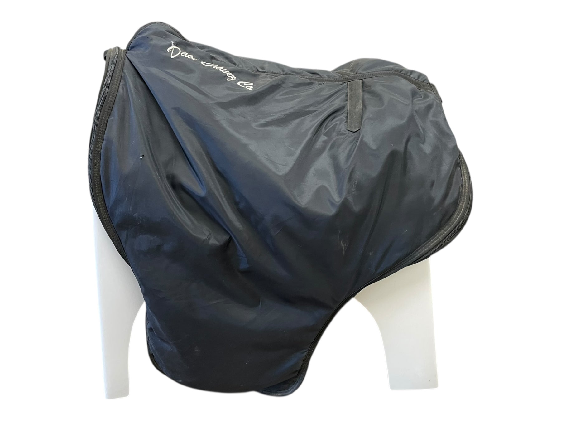Pre-owned saddle for sale. This saddle is in good condition overall and shows light to regular wear. The seat shows some lightening in color, and has smoothed out in areas. Silver is moderately tarnished. The saddle case has a small hole in it.