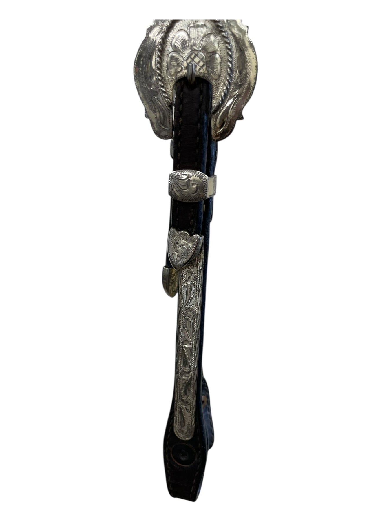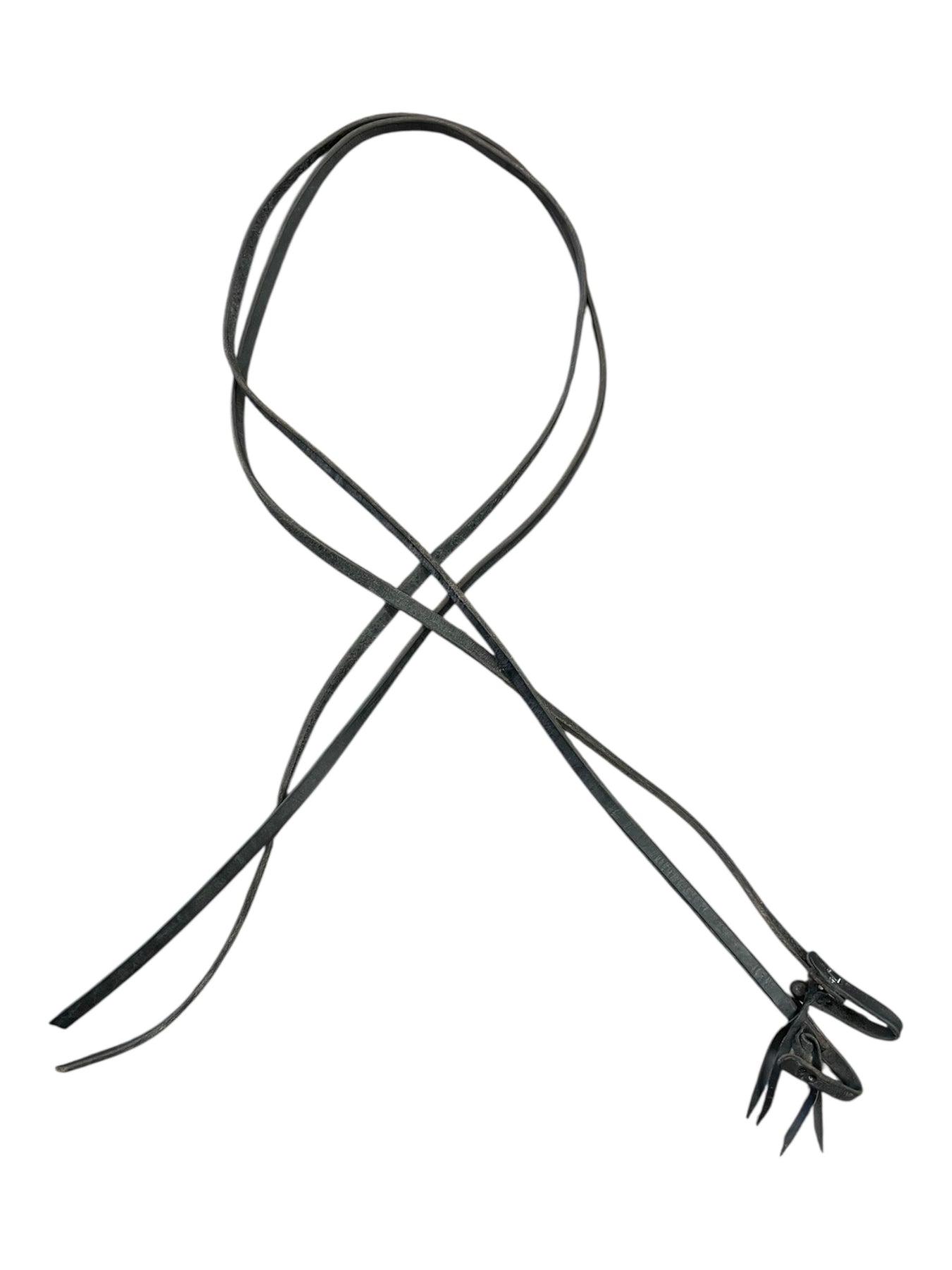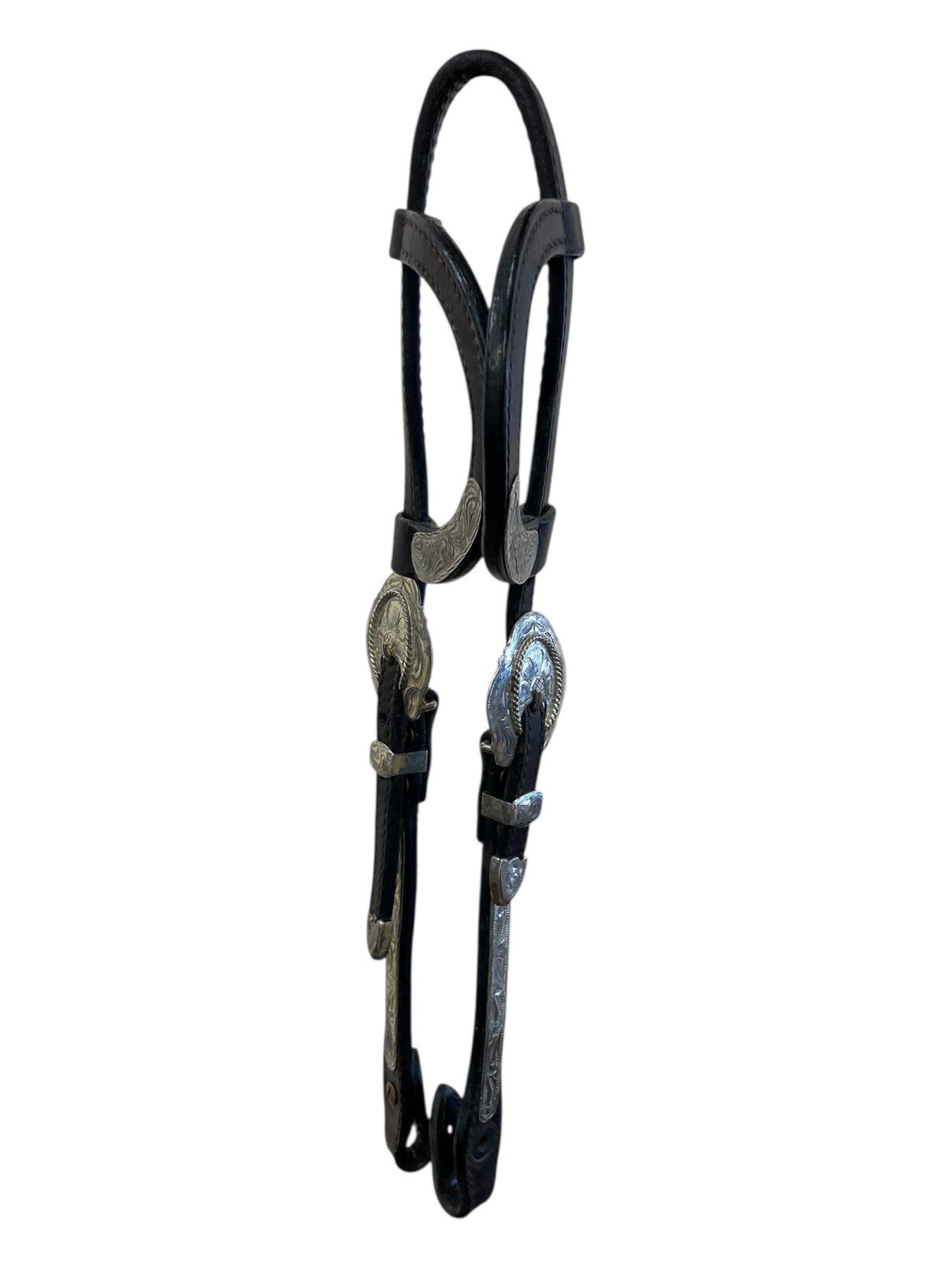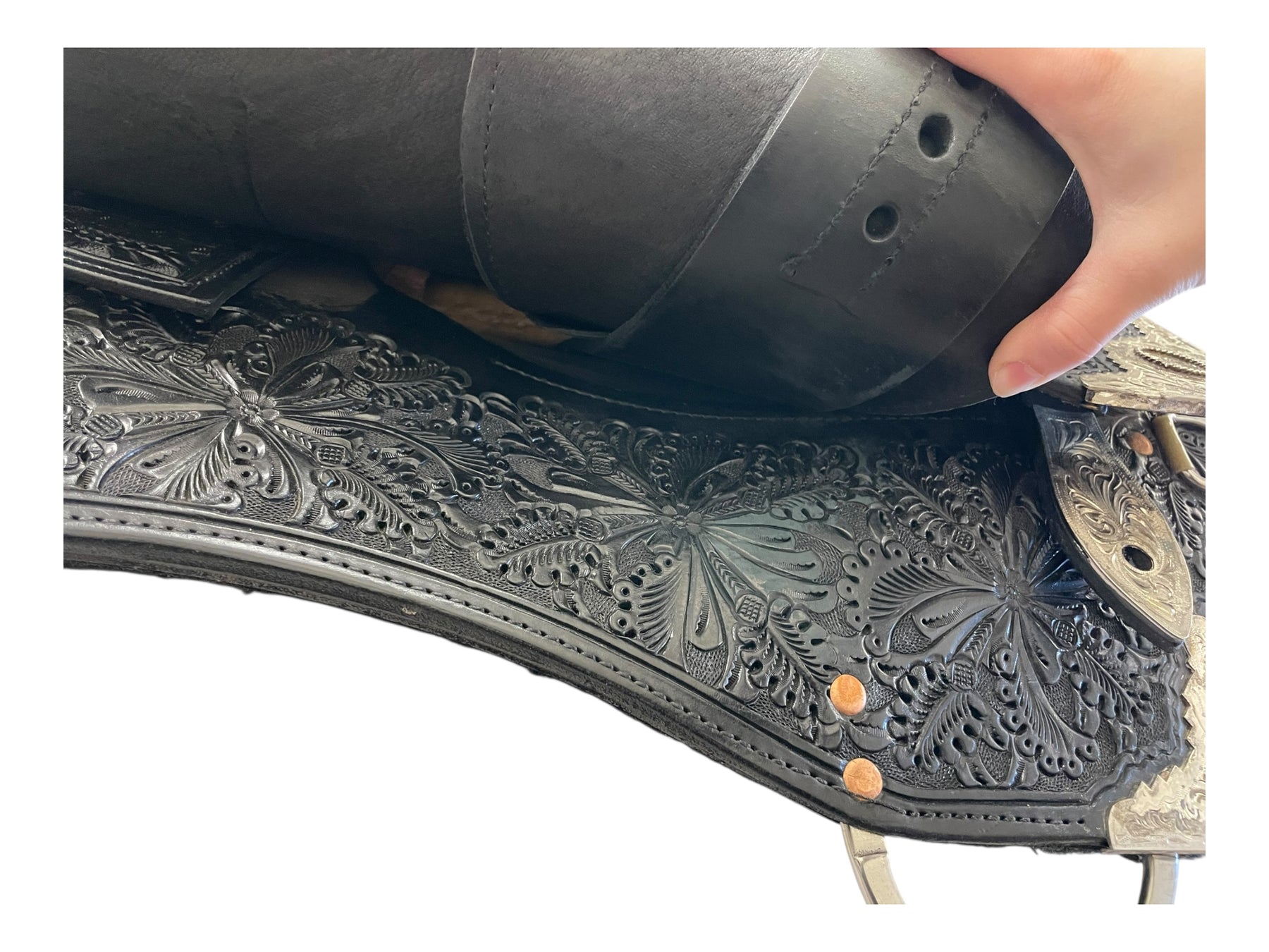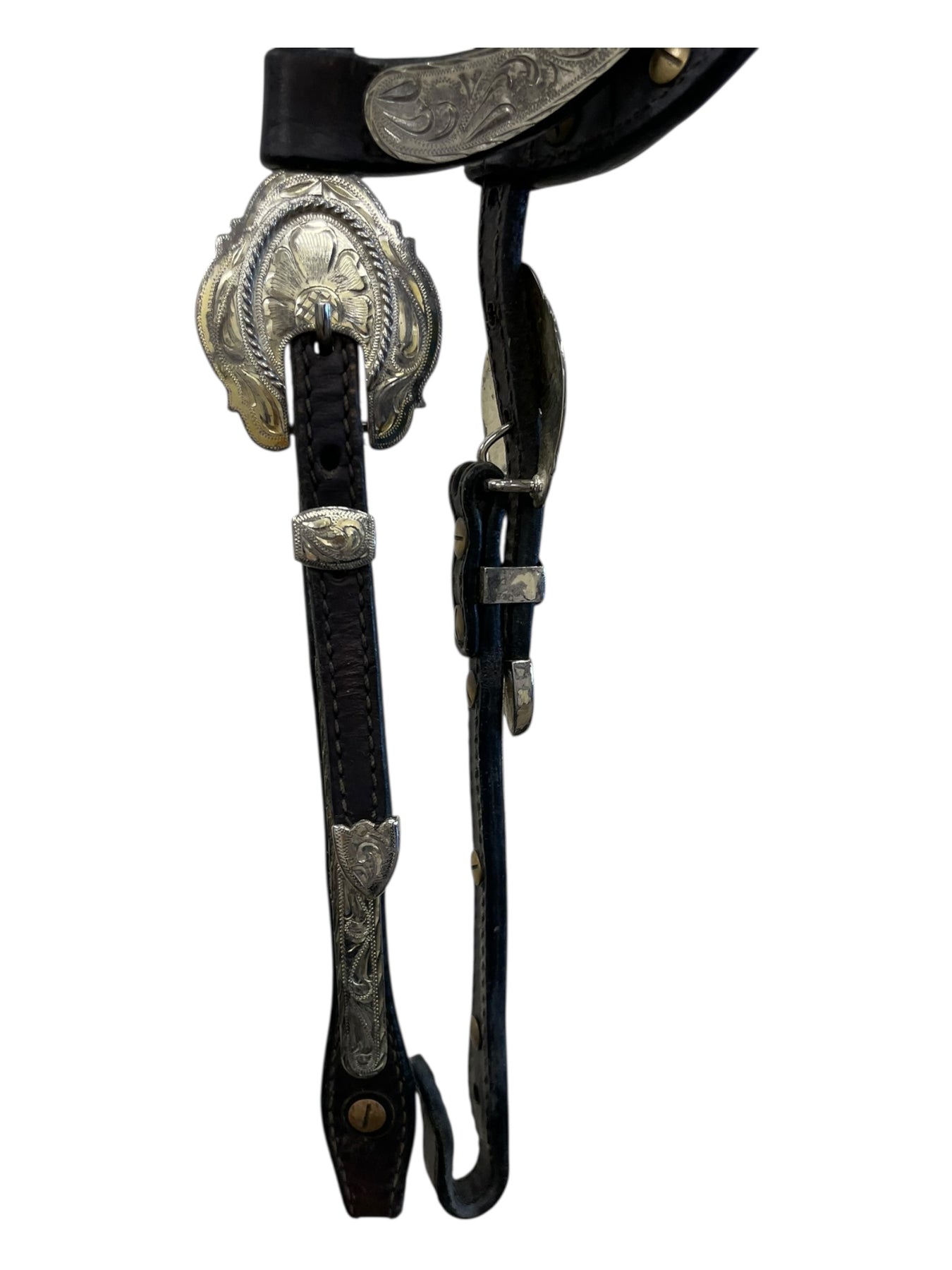 Headstall and reins appear to be a very dark brown when compared to black saddle.