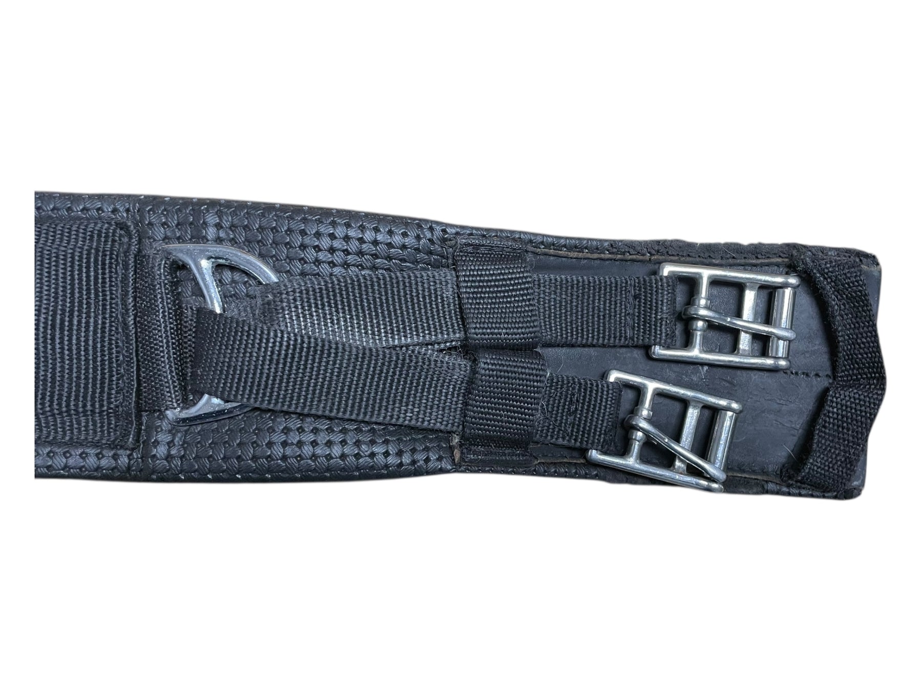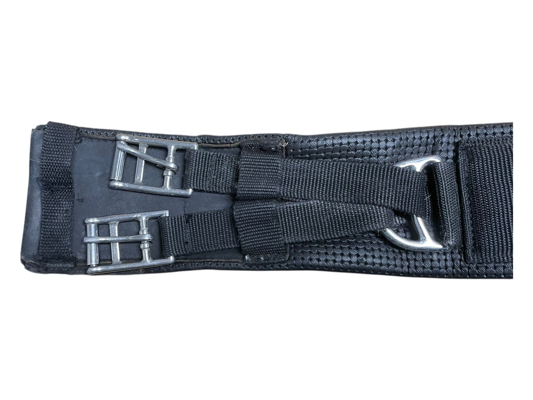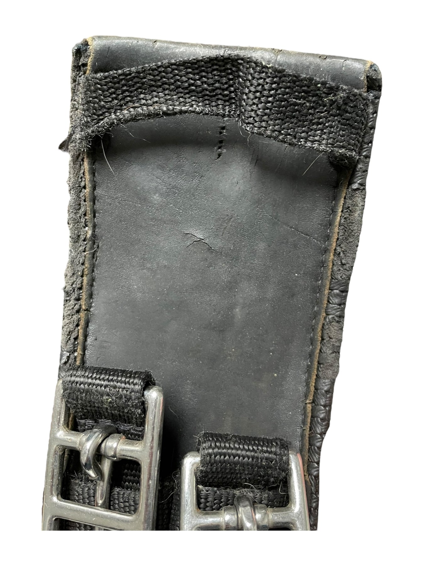 Condition: In moderate condition, shows much use. Much wear can be seen along edges of girth. Some cracking in synthetic material underneath buckles.