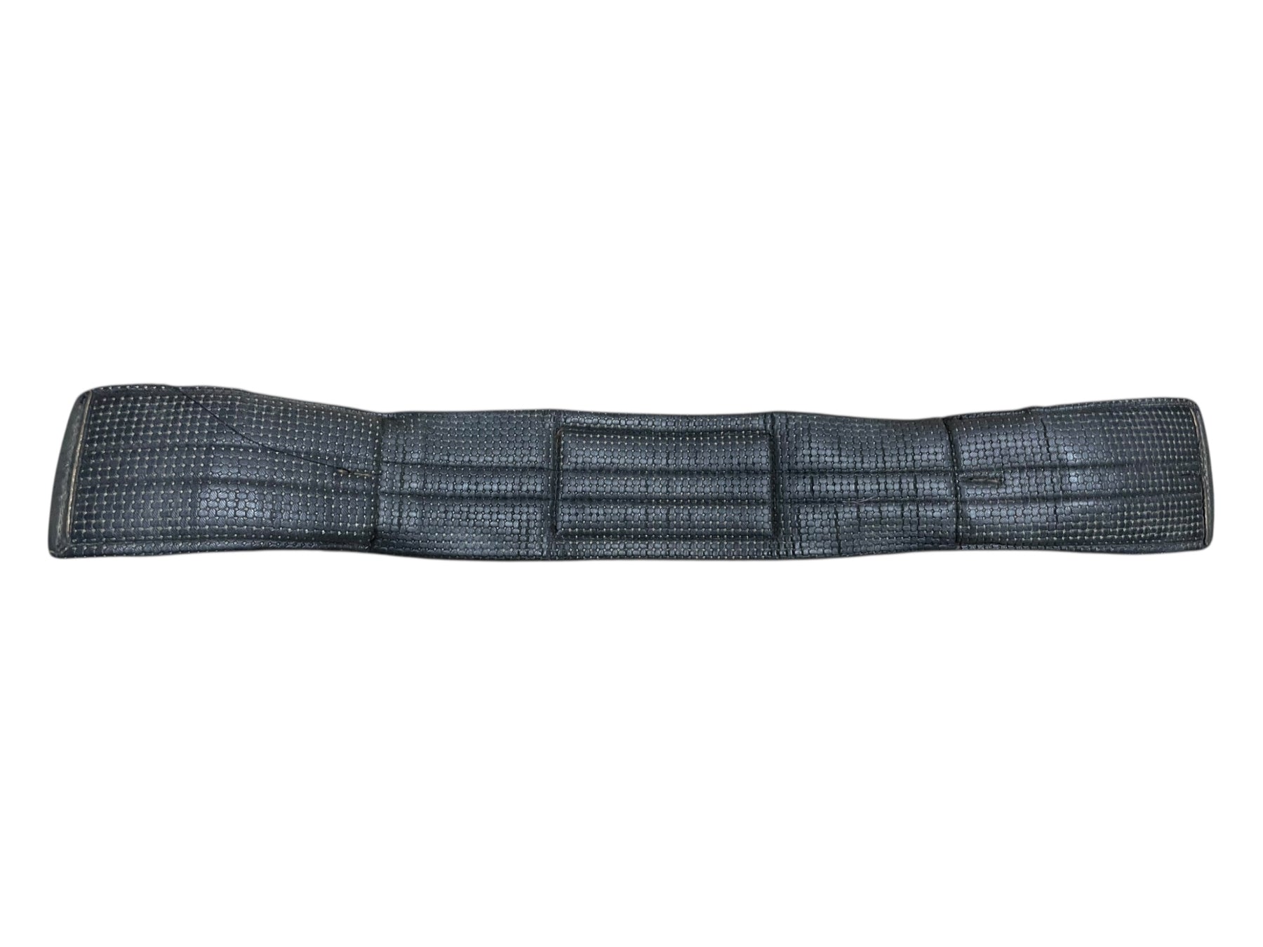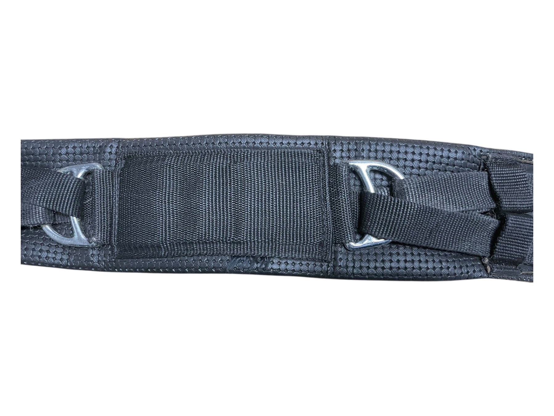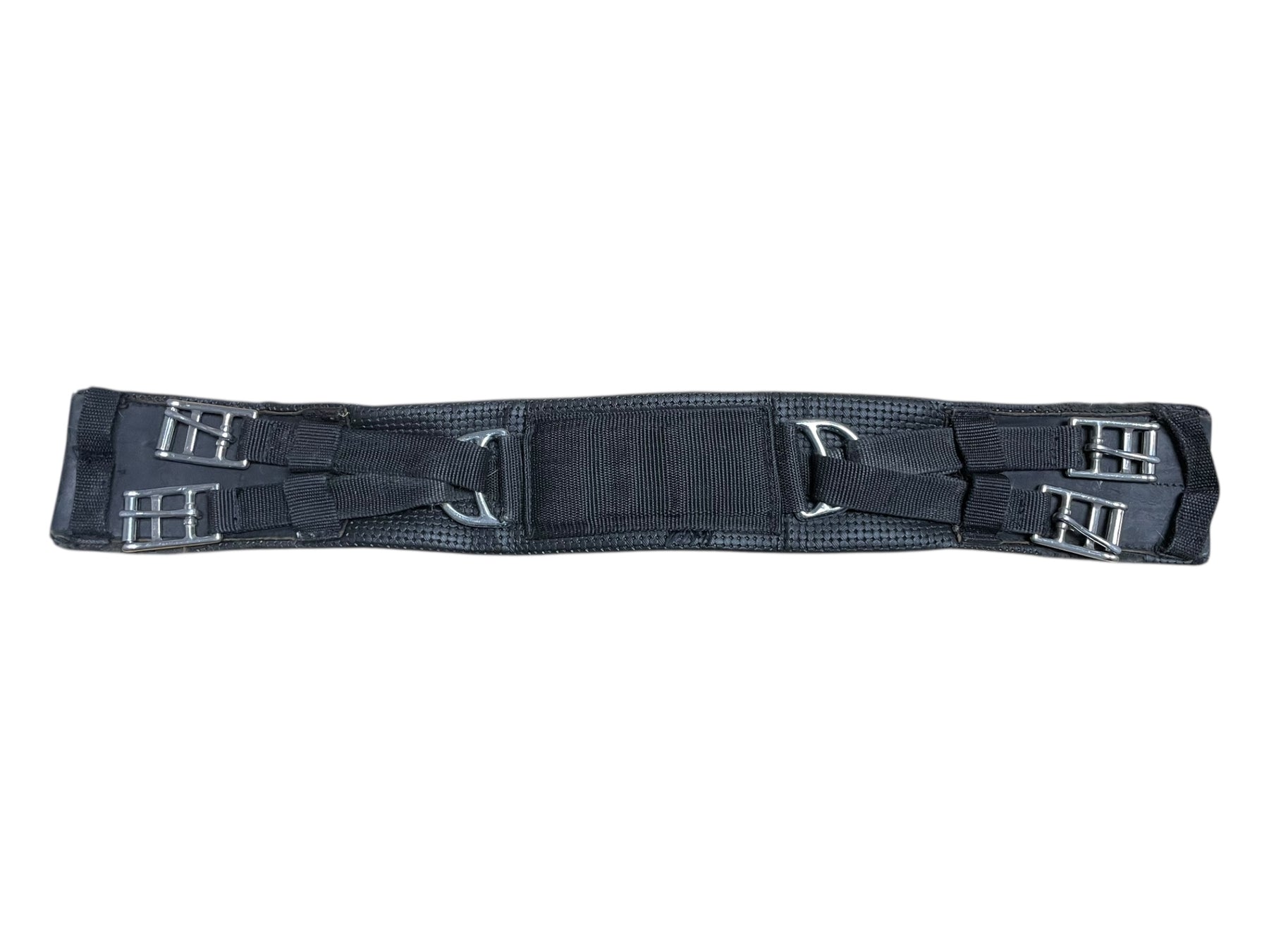 Condition: In moderate condition, shows much use. Much wear can be seen along edges of girth. Some cracking in synthetic material underneath buckles.