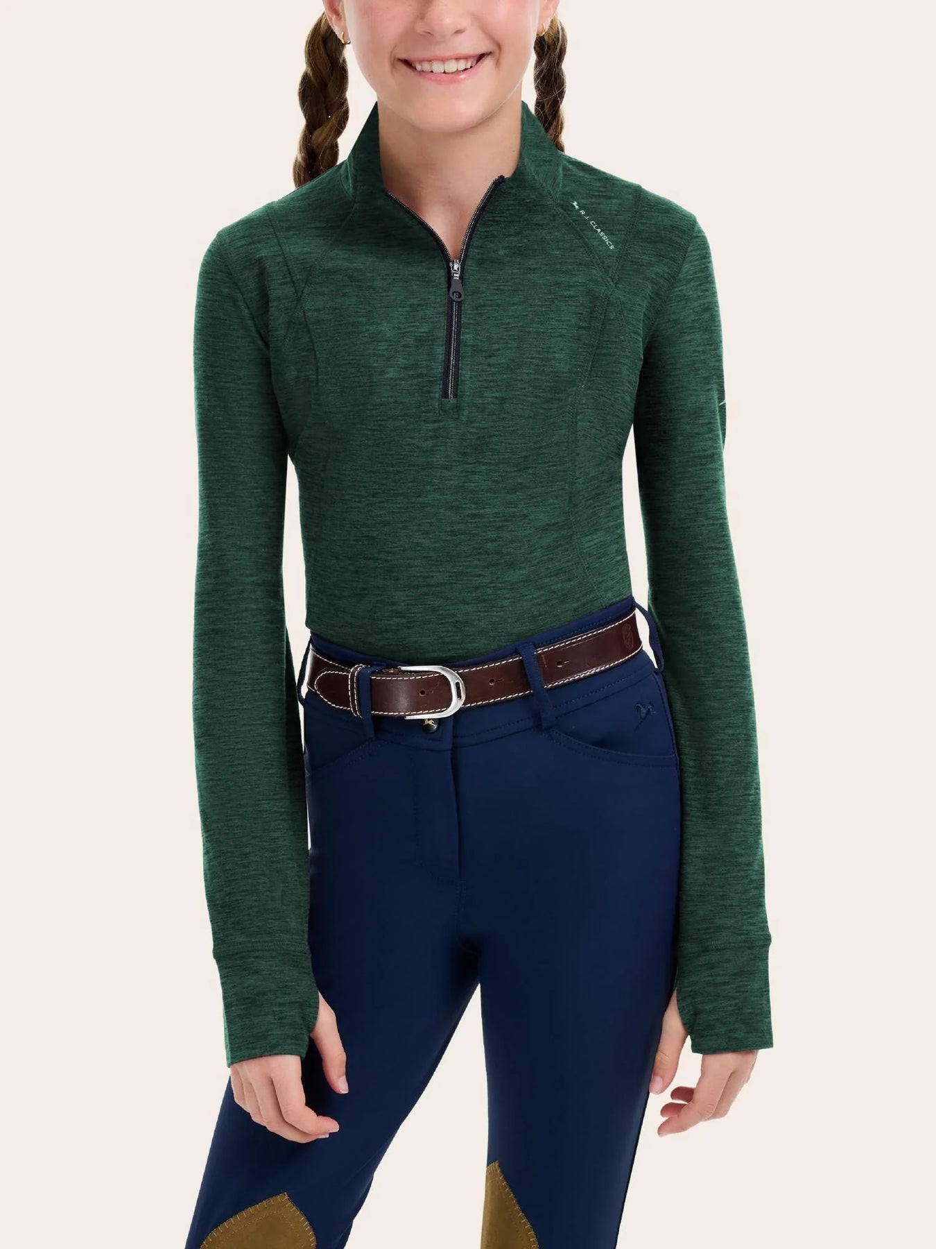 The Logan Jr. training shirt will be your new staple for those cooler mornings and transitions into the fall and winter seasons. The heathered fabric offers a soft hand feel that keeps you comfortable in the saddle, while the thumbhole sleeves add extra coziness when you're out of the saddle! Sporty seam lines and ¼ zip styling ensure you'll look as great as you feel.