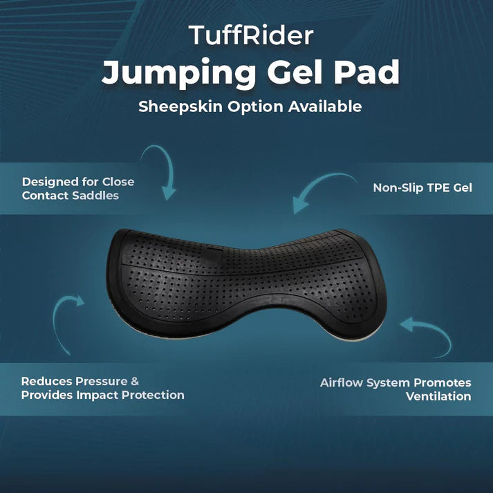 Tuffrider Jumping Gel Pads are injection molded from high-quality Thermoplastic TPE Gel with thoughtfully engineered ventilation holes. These non-slip gel pads offer a unique airflow system for breathability and have the required thickness to reduce pressure and provide impaction protection. The shape of the pads provides safe protection to the wither and back. These pads can be used directly on the horse's back or over a saddle pad. Machine washability makes these pads easy care and maintenance free.