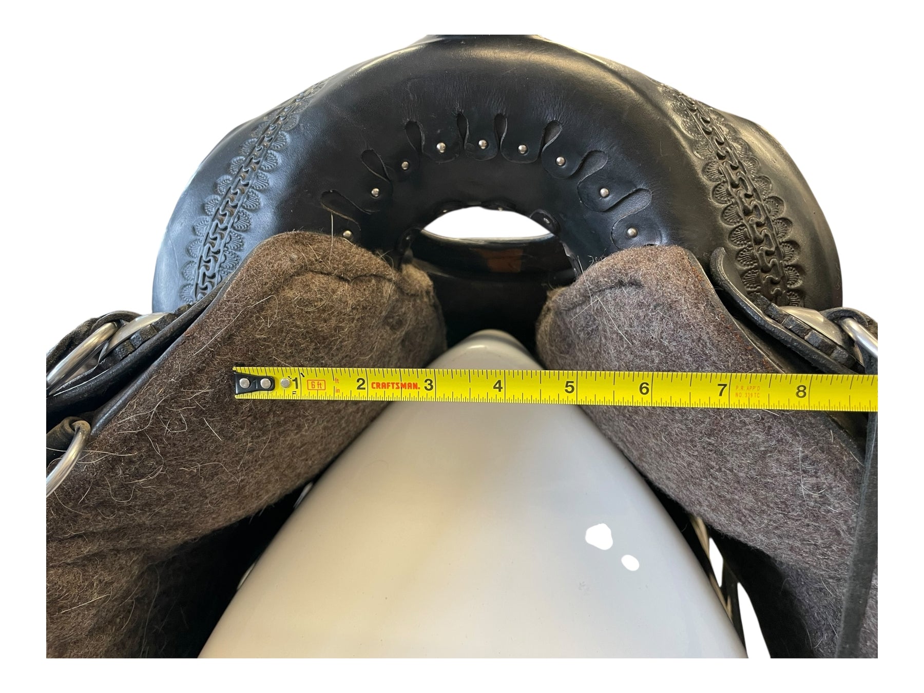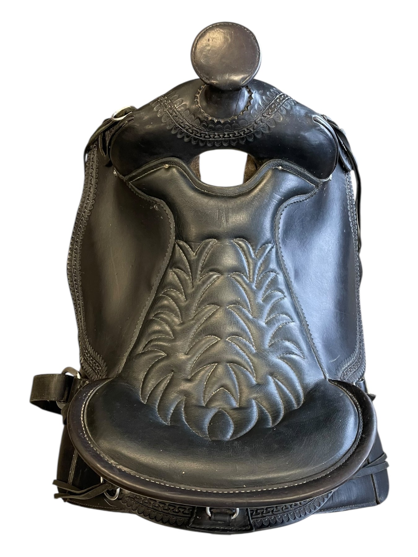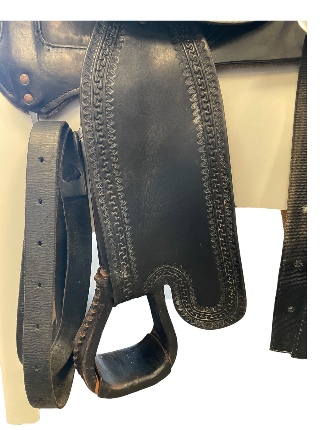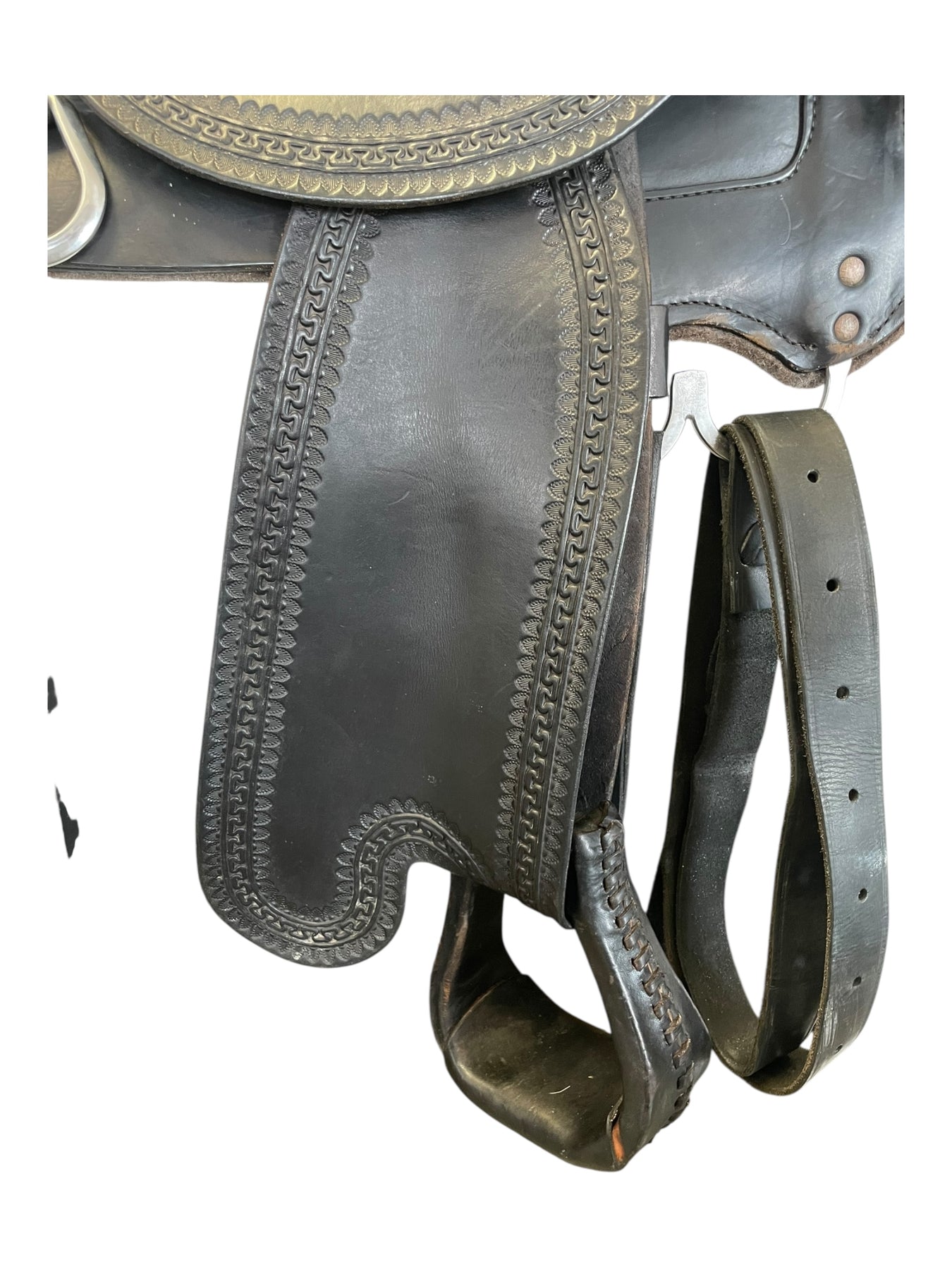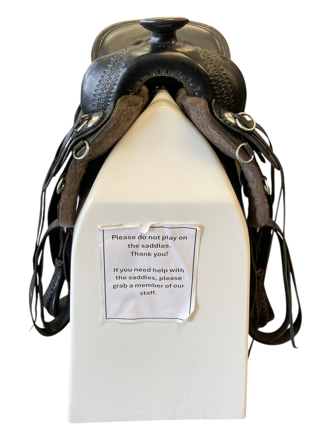 Pre-owned saddle for sale. This saddle is in good condition and shows regular wear. There are a few scuffs and scrapes here and there, with the most noticeable being on right side skirt (pictured). Some wear on seat can be seen.