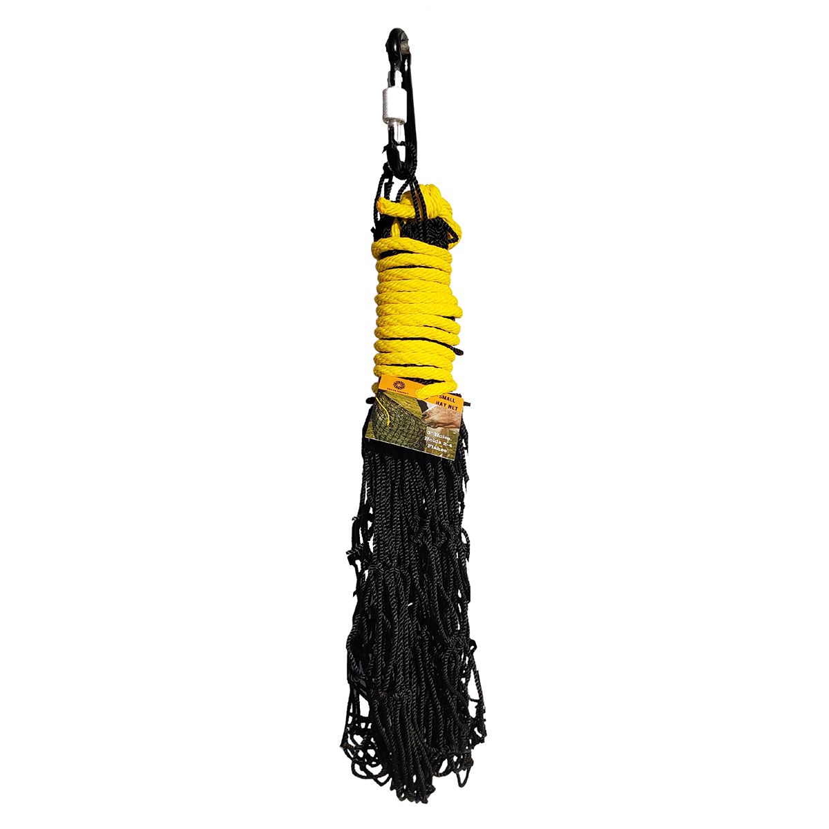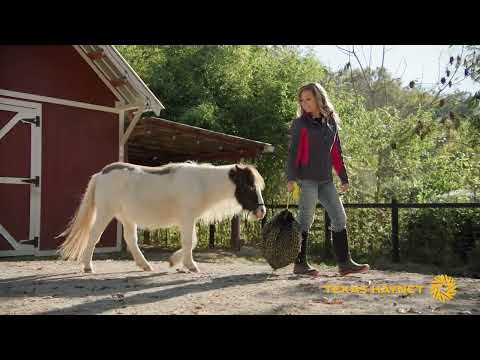 Small hay net is perfect for horses, cattle, llamas/alpacas and goats/sheep. Great for a snack, small meal in the stall or easy access feeding station in the pasture. Fits muck tub for easy filling. Best for 2-4 flakes. Hole sizes measure 1.5" or 3". Includes 1 knotted nylon mesh net and 1 heavy-duty carabiner clip.