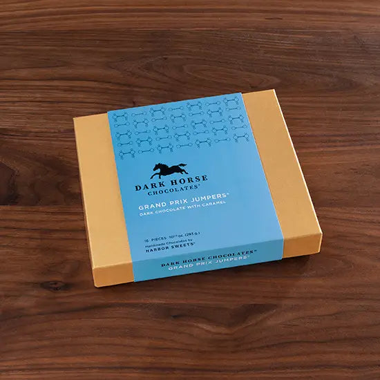 The thrill of Grand Prix jumping depicted in rich, dark chocolate covering creamy butter caramel. 10 1/3 oz.