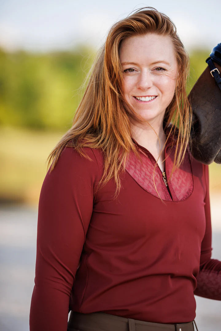 The Sarah Zip Mock is the perfect mock-neck training top that you can wear to the barn and beyond with confidence and style. The zip mock neck makes this top uniquely versatile.