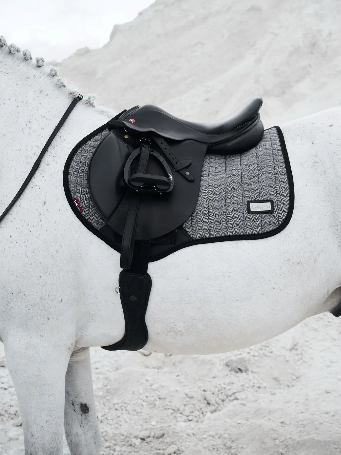 Express your style with this luxe saddle pad from the Aspen Collection. Crafted in a premium herringbone fabric, it has a sporty chevron quilting pattern with an athletic and elevated feel. Patent PU piping catches the light, and a gunmetal LeMieux badge matches back to the rest of the Aspen Collection.