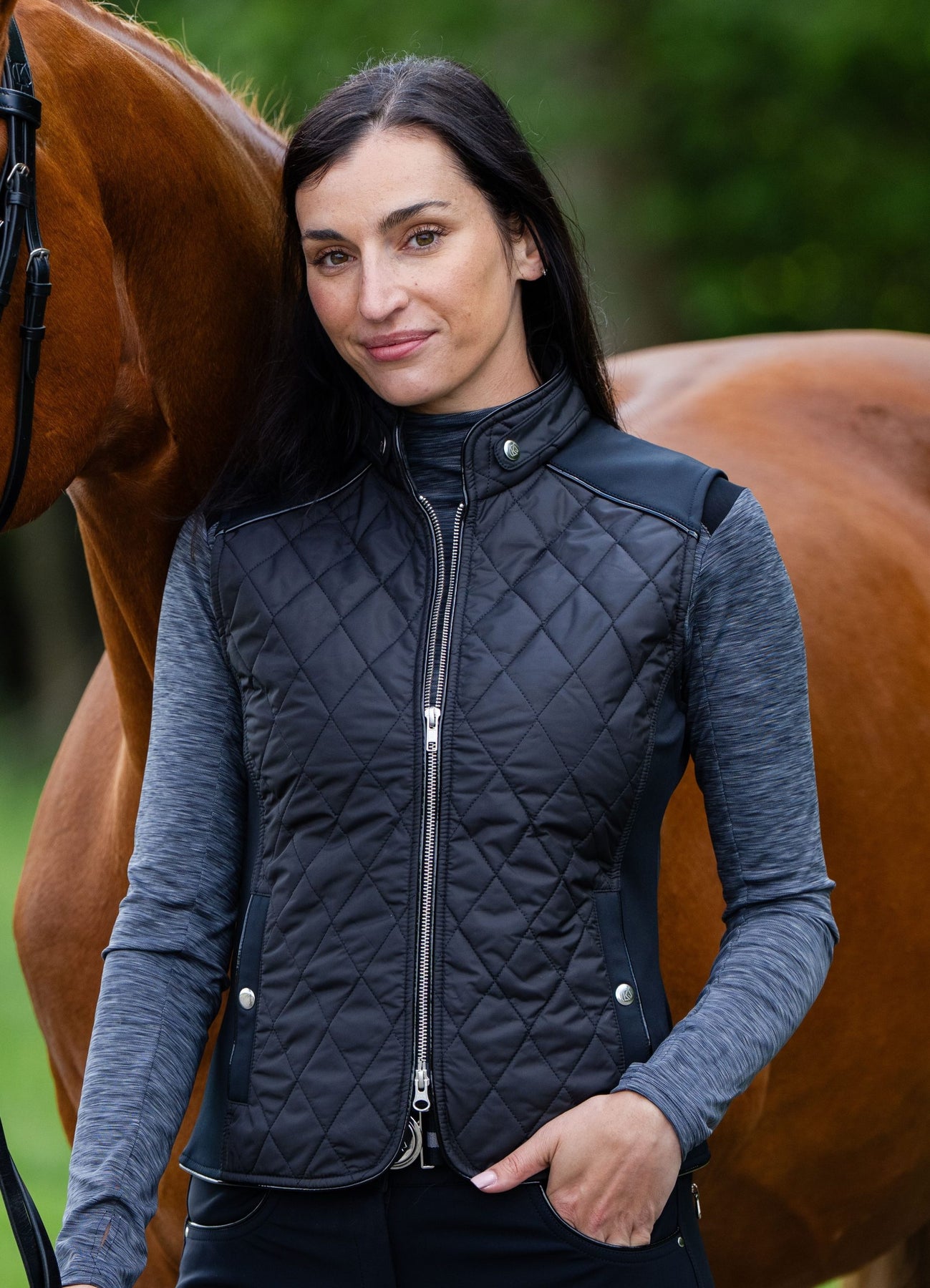 New!  Elevate your style with the KL Select Taylor women’s riding vest. An ideal layer for multiple seasons, this essential piece combines modern design and elegance with practicality, making it a must-have for any wardrobe.  The sleek, tailored fit accentuates your figure while allowing for freedom of movement – in and out of the saddle.  The Taylor vest features diamond shape quilting, contrasting faux leather piping, and 4-way-stretch side panels.  Available inBlack with Black Patent piping, this vest pairs perfectly with our KL Select Gabrielle breeches.  Sizes X-Small – X-Large.