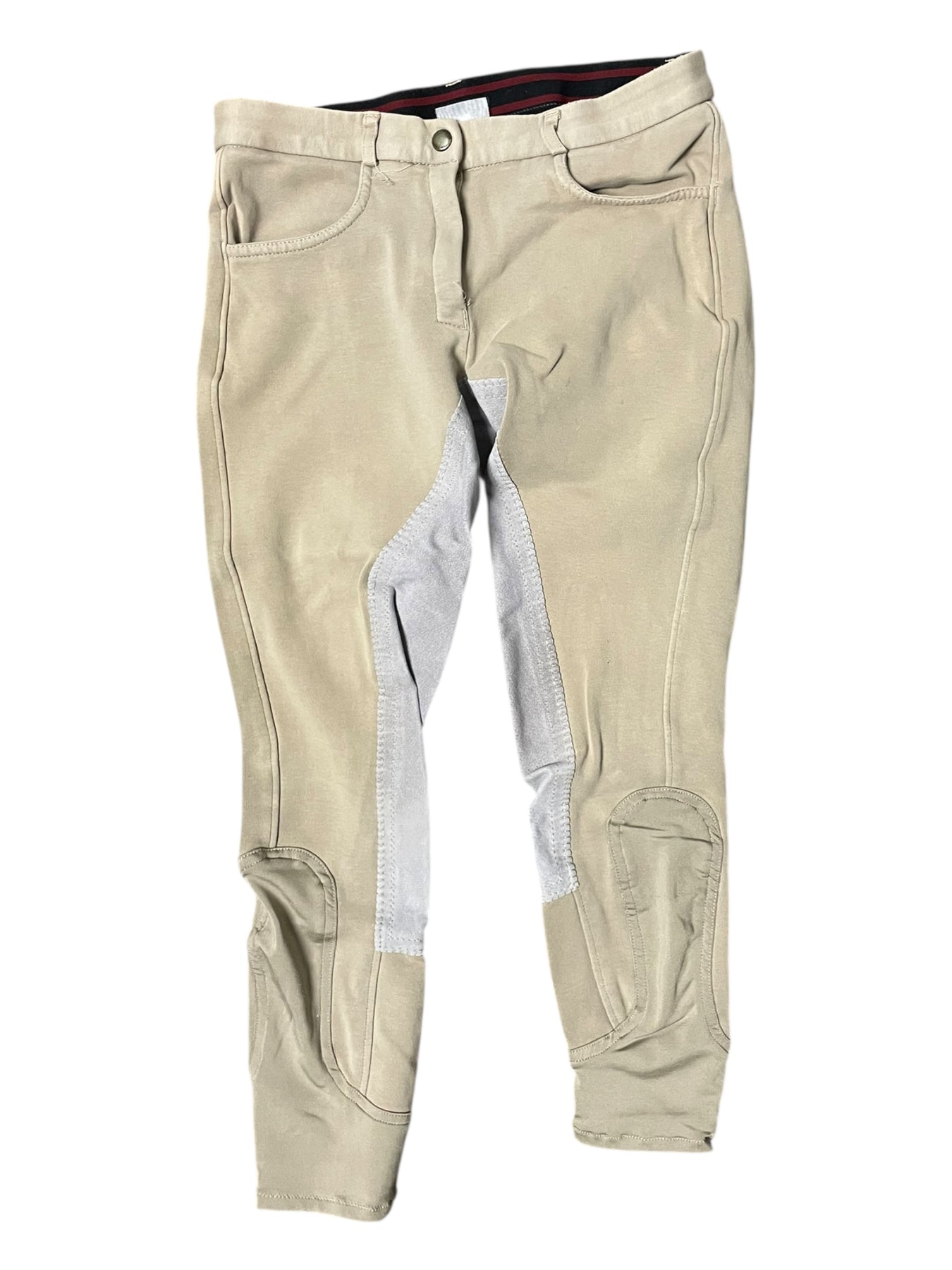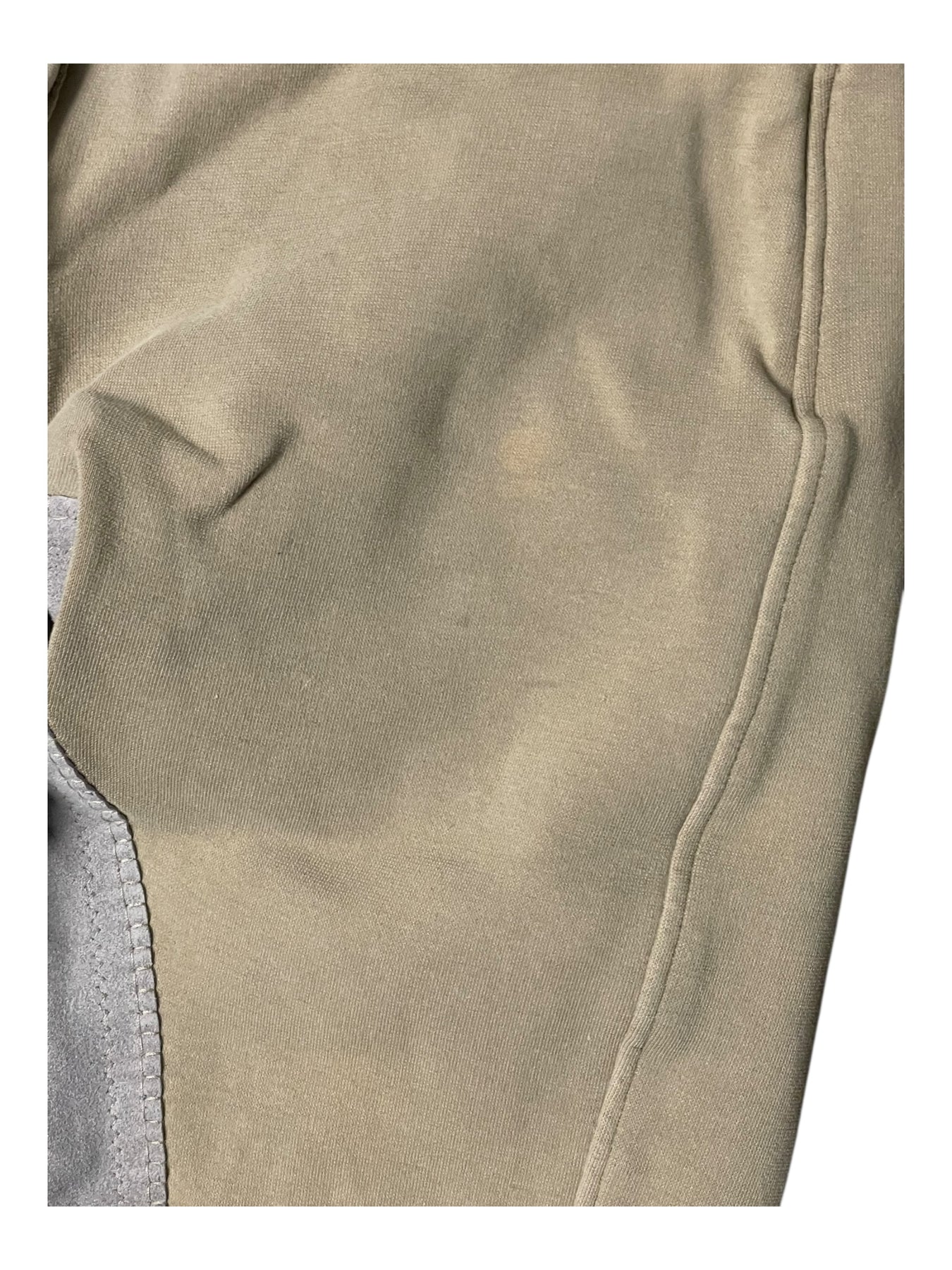 Condition: In moderate condition. Some minor stains/discoloration on front, and much staining on seat and inner leg area. Some popped threads. Some very tiny holes here and there. Pilling in some areas.