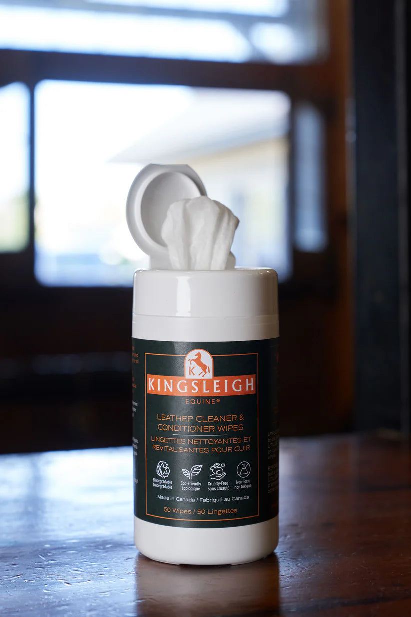 Clean, condition, and protect your saddles, bridles, boots, car interior, etc. effortlessly with Kingsleigh Equine’s biodegradable Leather Cleaner & Conditioner Wipes—gentle on leather, tough on dirt.