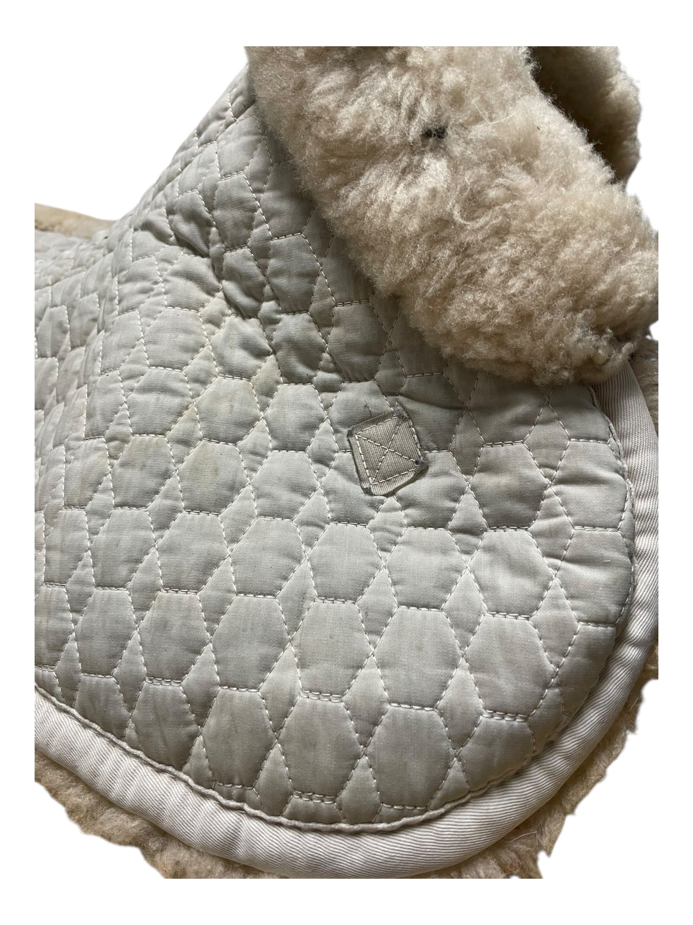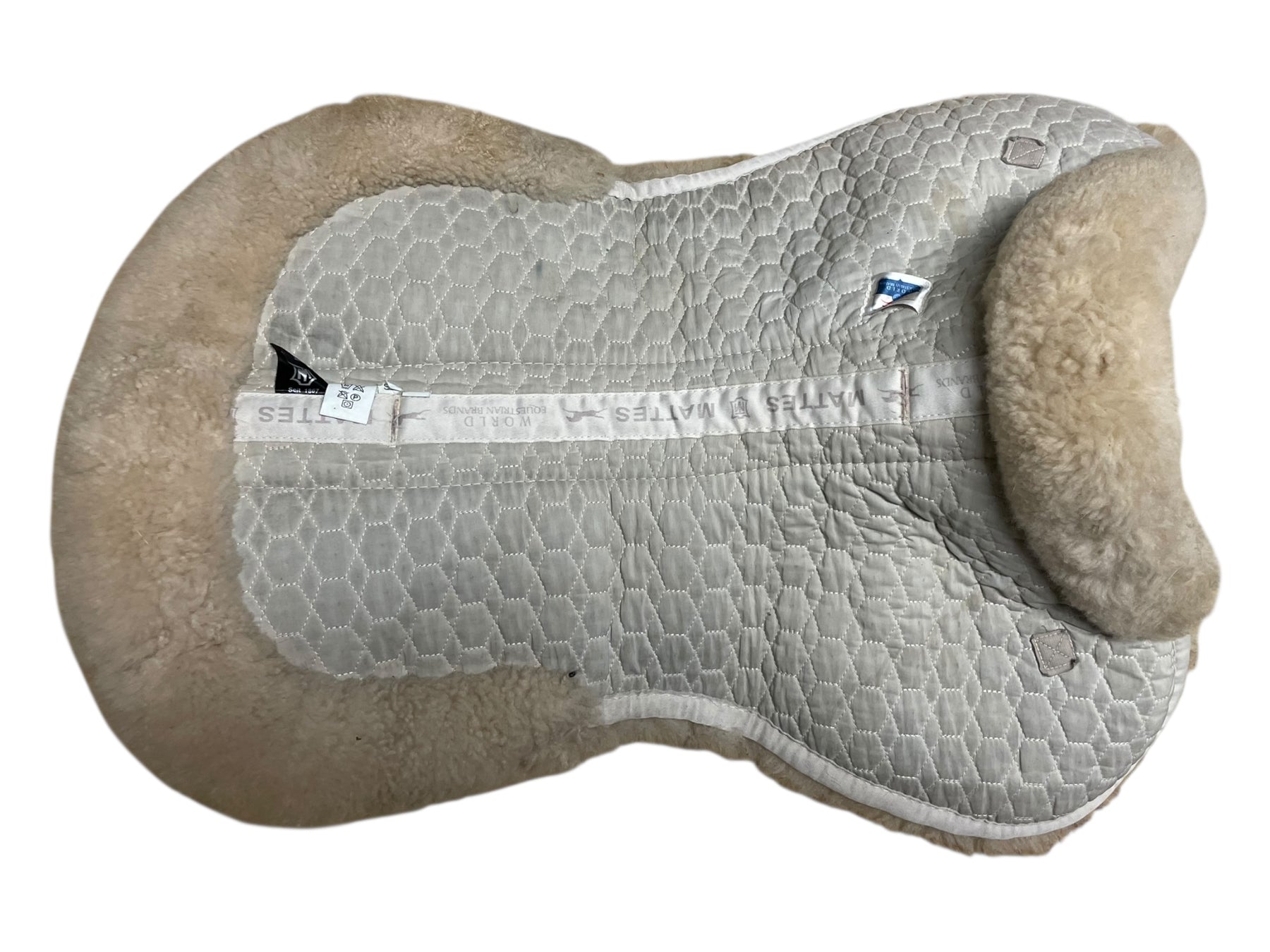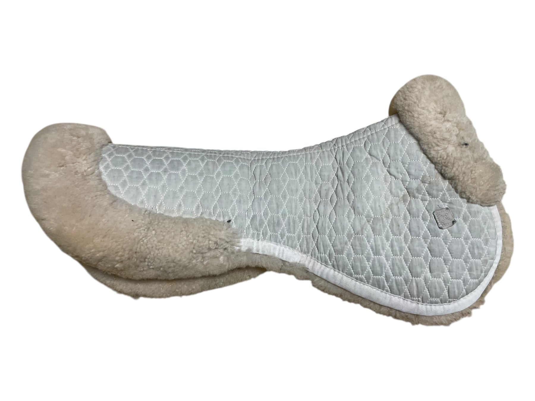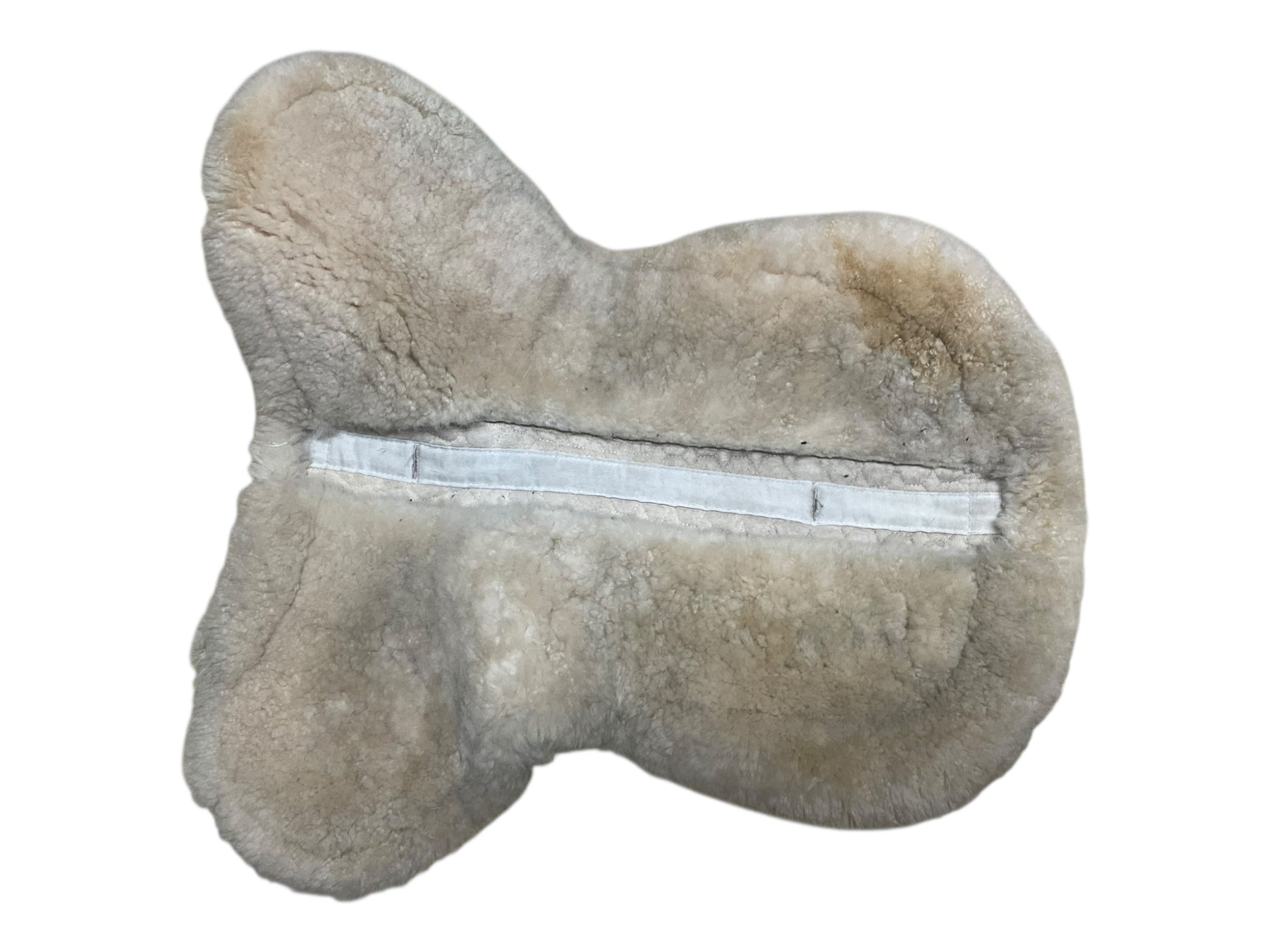 Condition: In fair condition overall. The white body of the half pad is stained/discolored, making it appear somewhat gray. Some subtle discoloration and matting can be seen on outer sheepskin trim. On the underside, there is some staining on sheepskin. Straps have been cut off.