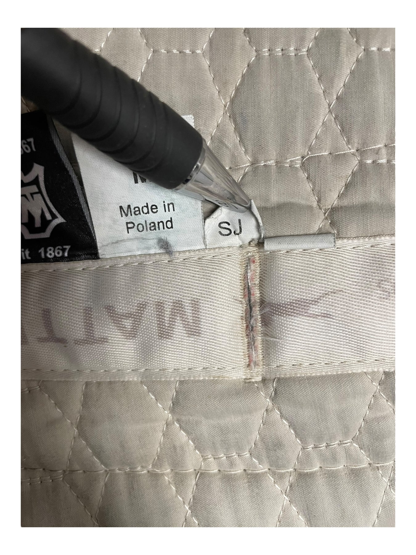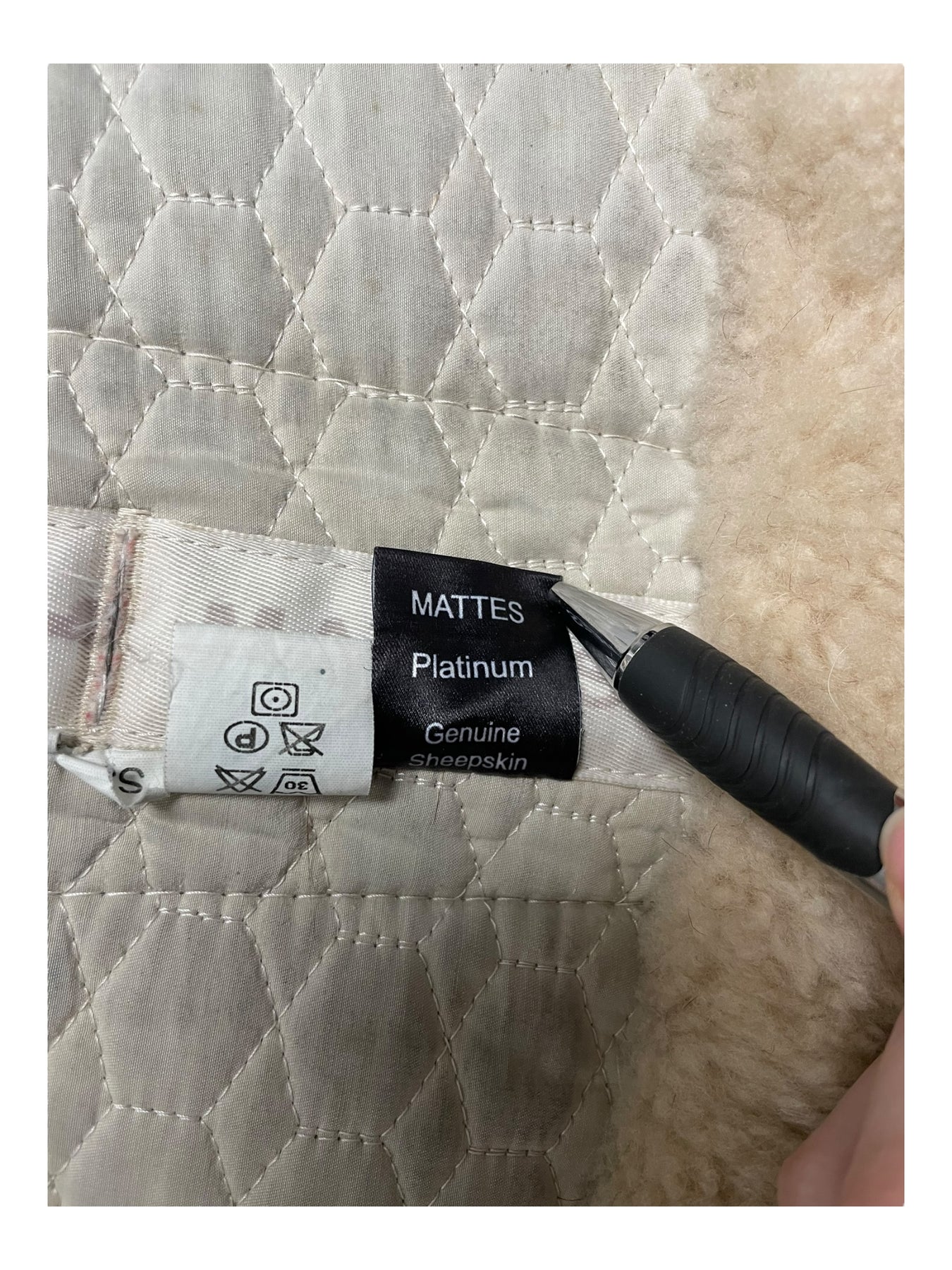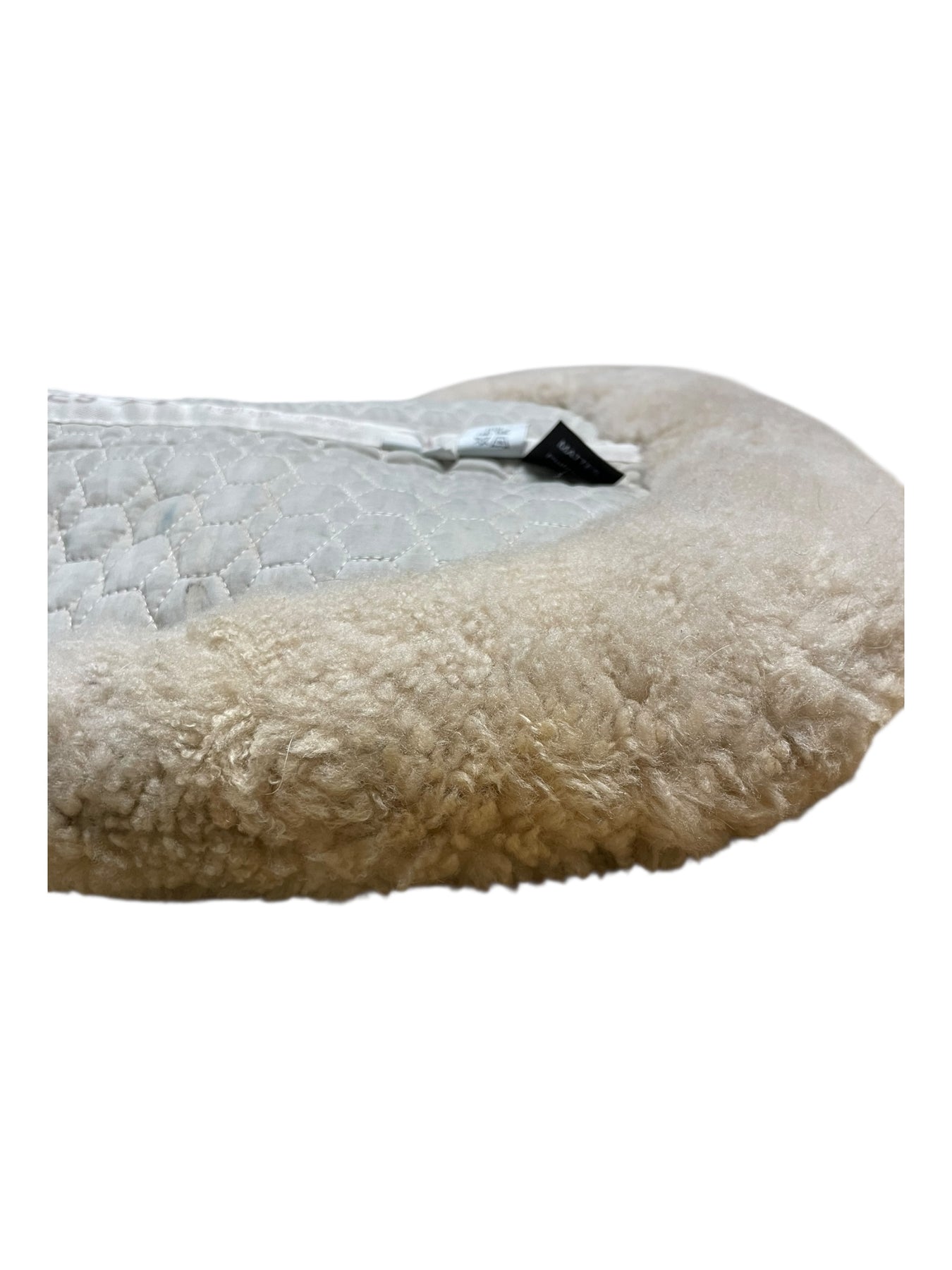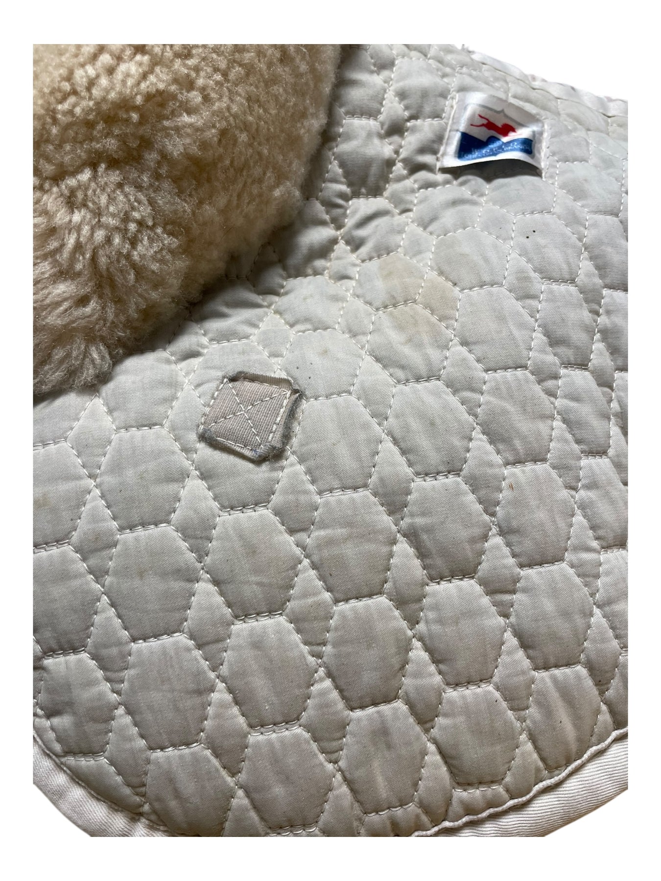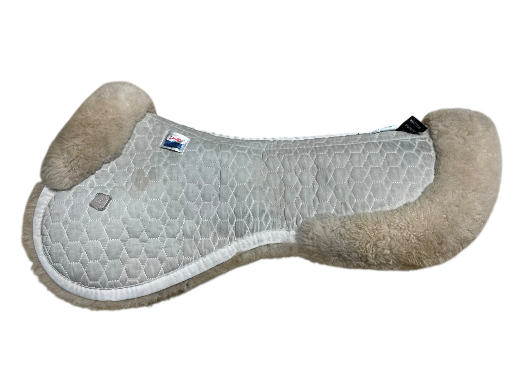 Condition: In fair condition overall. The white body of the half pad is stained/discolored, making it appear somewhat gray. Some subtle discoloration and matting can be seen on outer sheepskin trim. On the underside, there is some staining on sheepskin. Straps have been cut off.