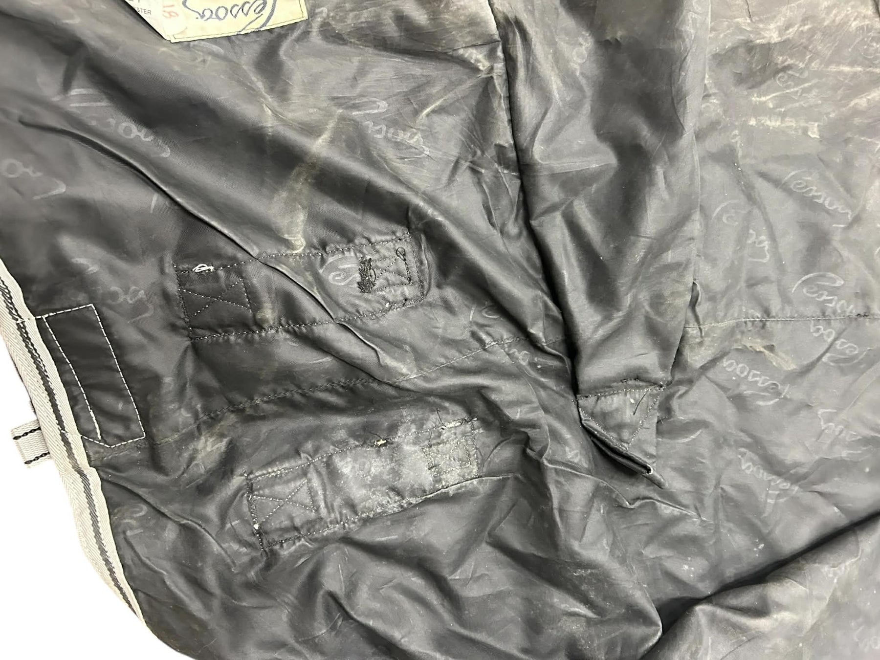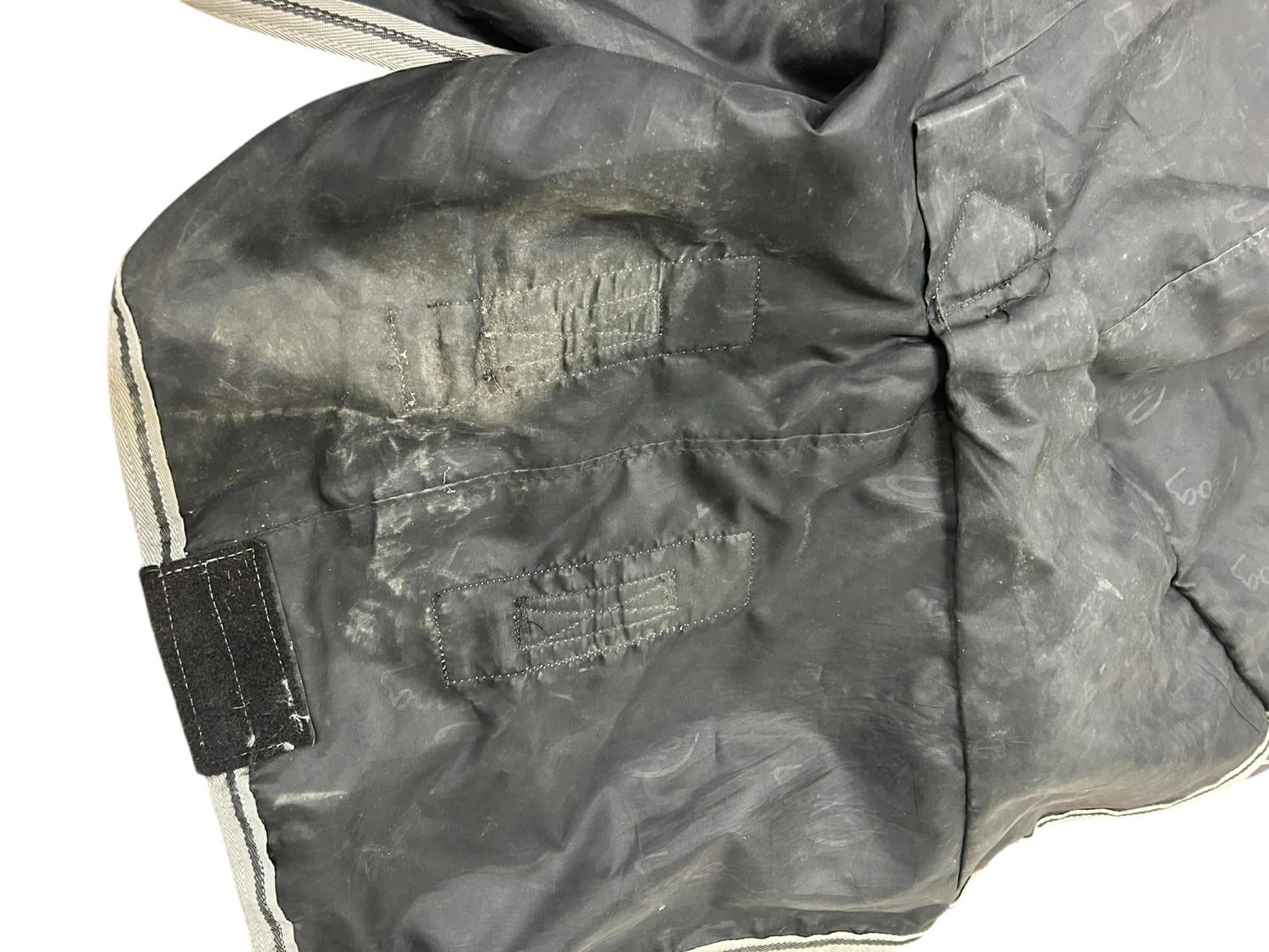 Condition: In good condition. Shows regular wear. Some dirt on lining and outside of sheet. Some staining. Some wear on fabric near rump (pictured). Some rust on buckles.