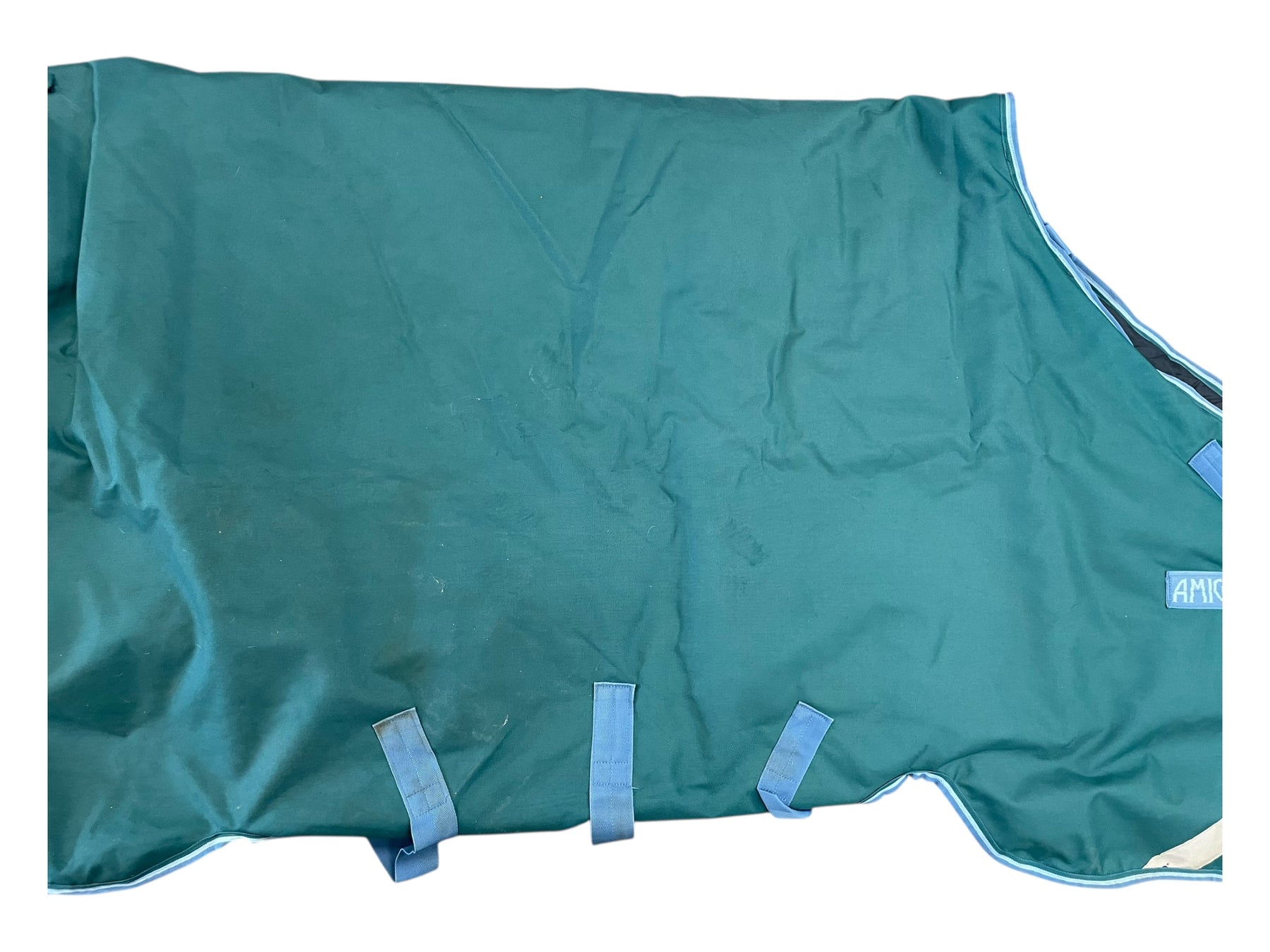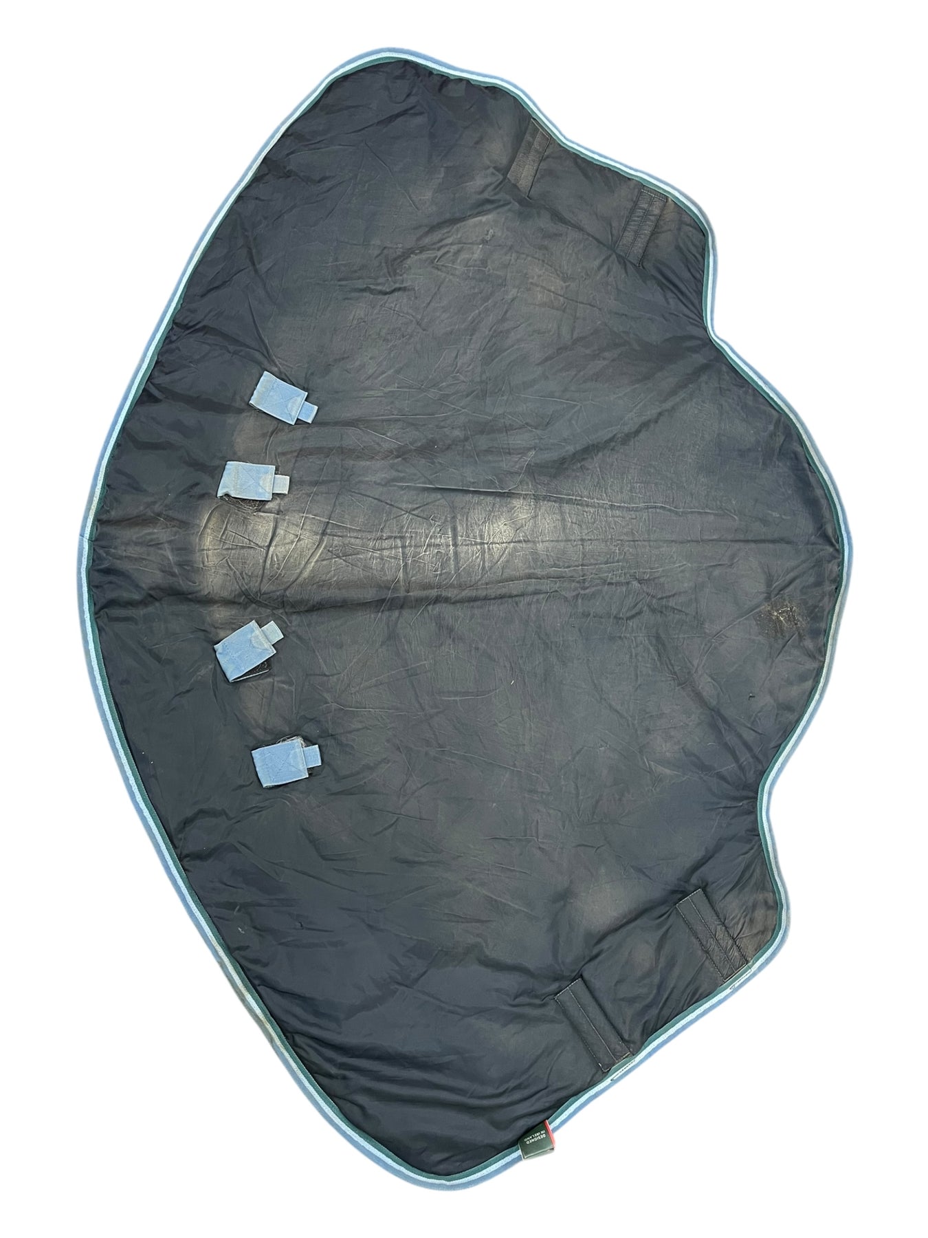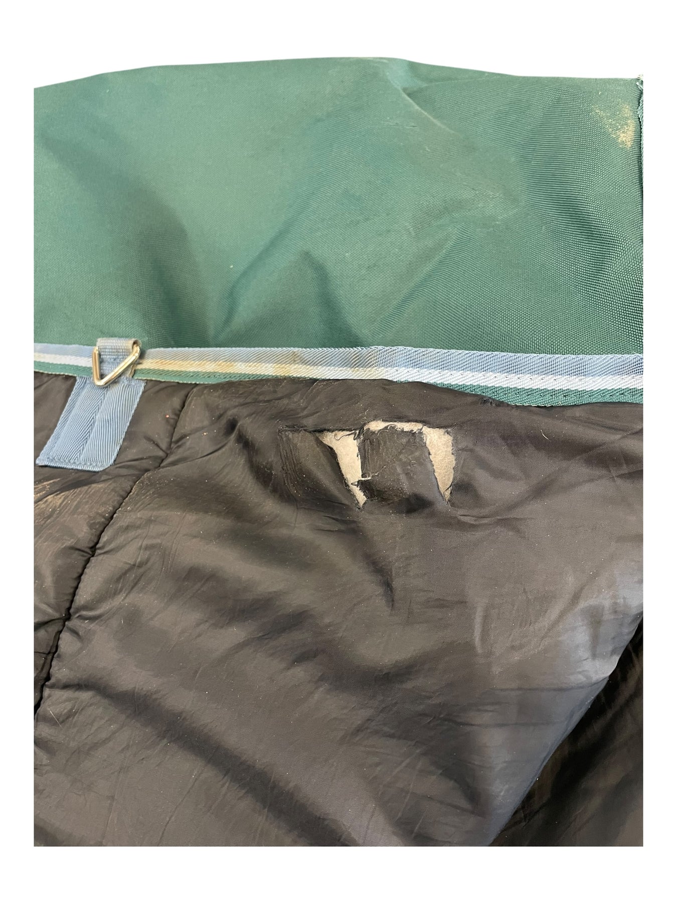 Condition: Fair condition overall. Hood has tiny hole on inner liner. Blanket has a tear on inner liner near tail area, and tear on outer shell in croup area. Both appear to be easy to patch up if desired (not currently patched).
