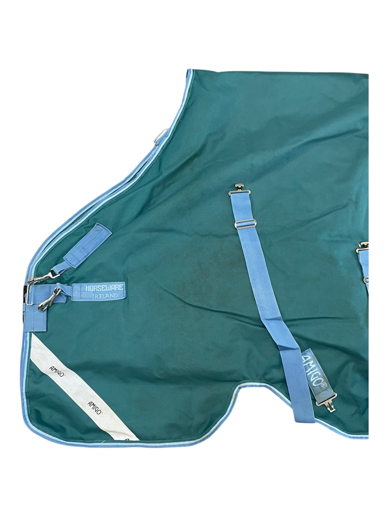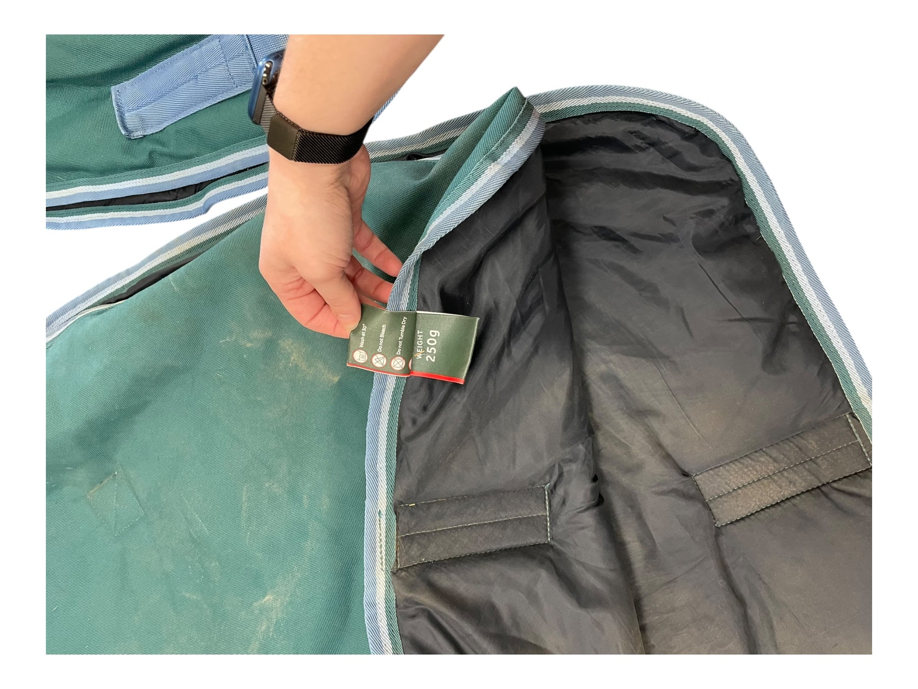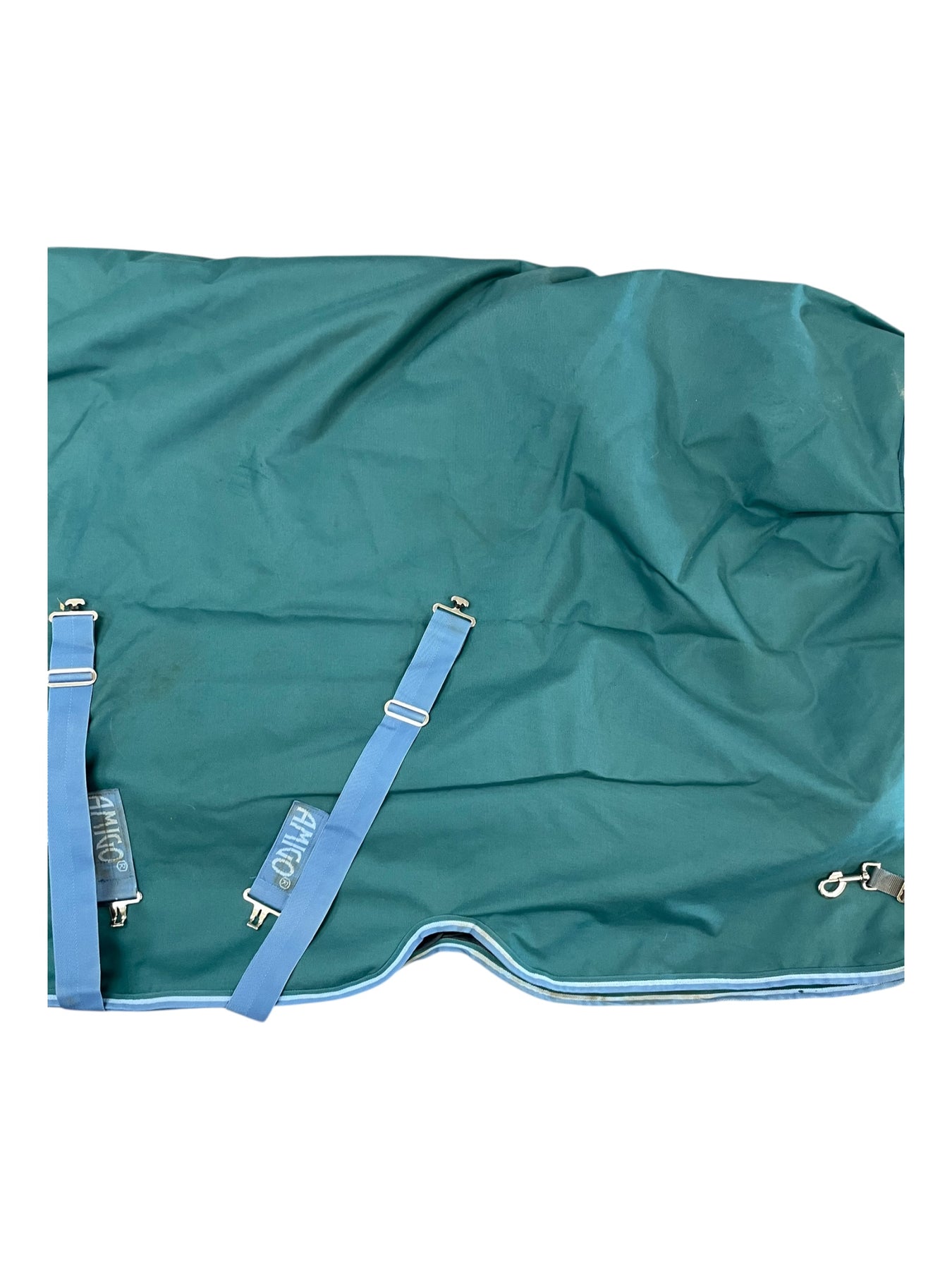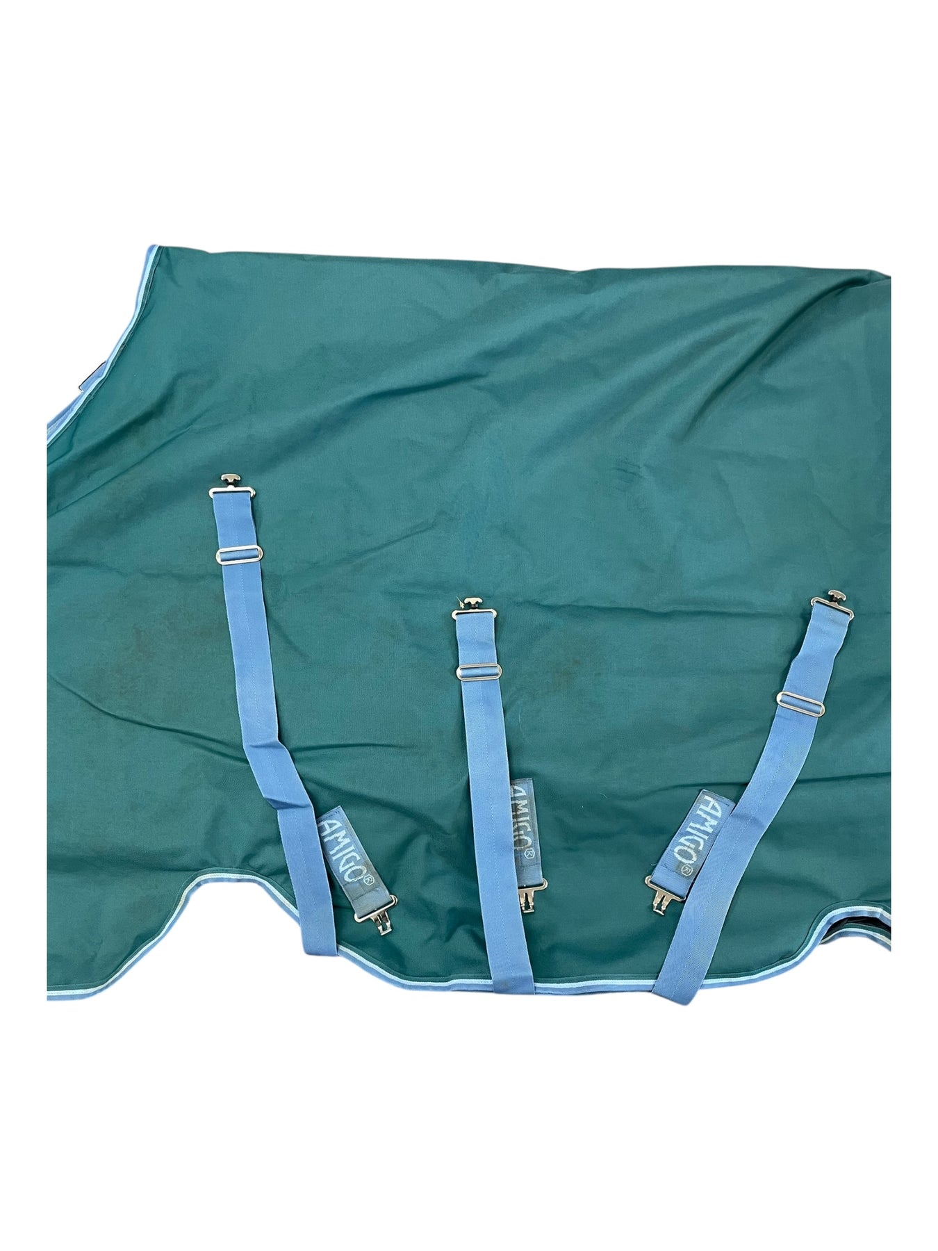 Condition: Fair condition overall. Hood has tiny hole on inner liner. Blanket has a tear on inner liner near tail area, and tear on outer shell in croup area. Both appear to be easy to patch up if desired (not currently patched).