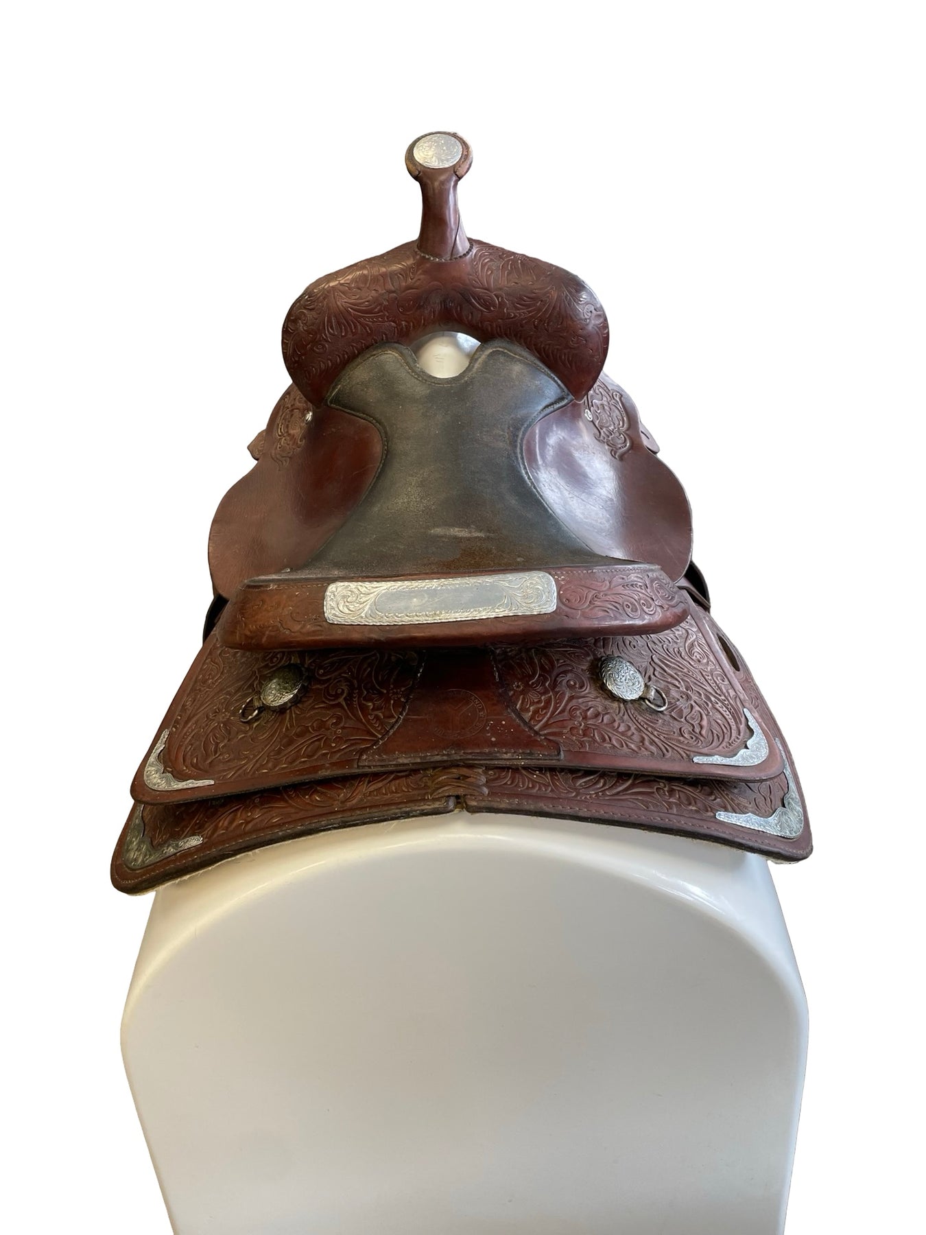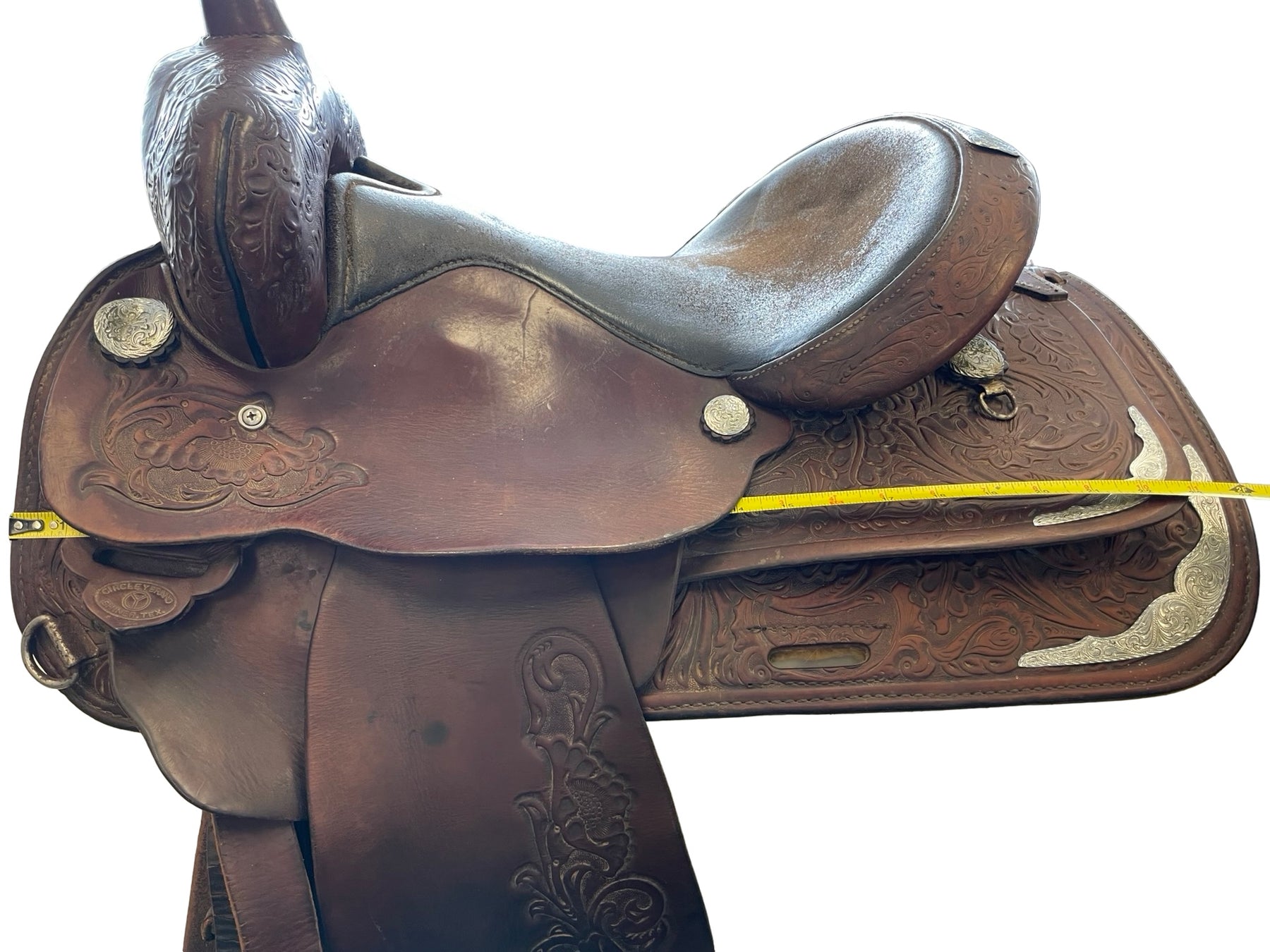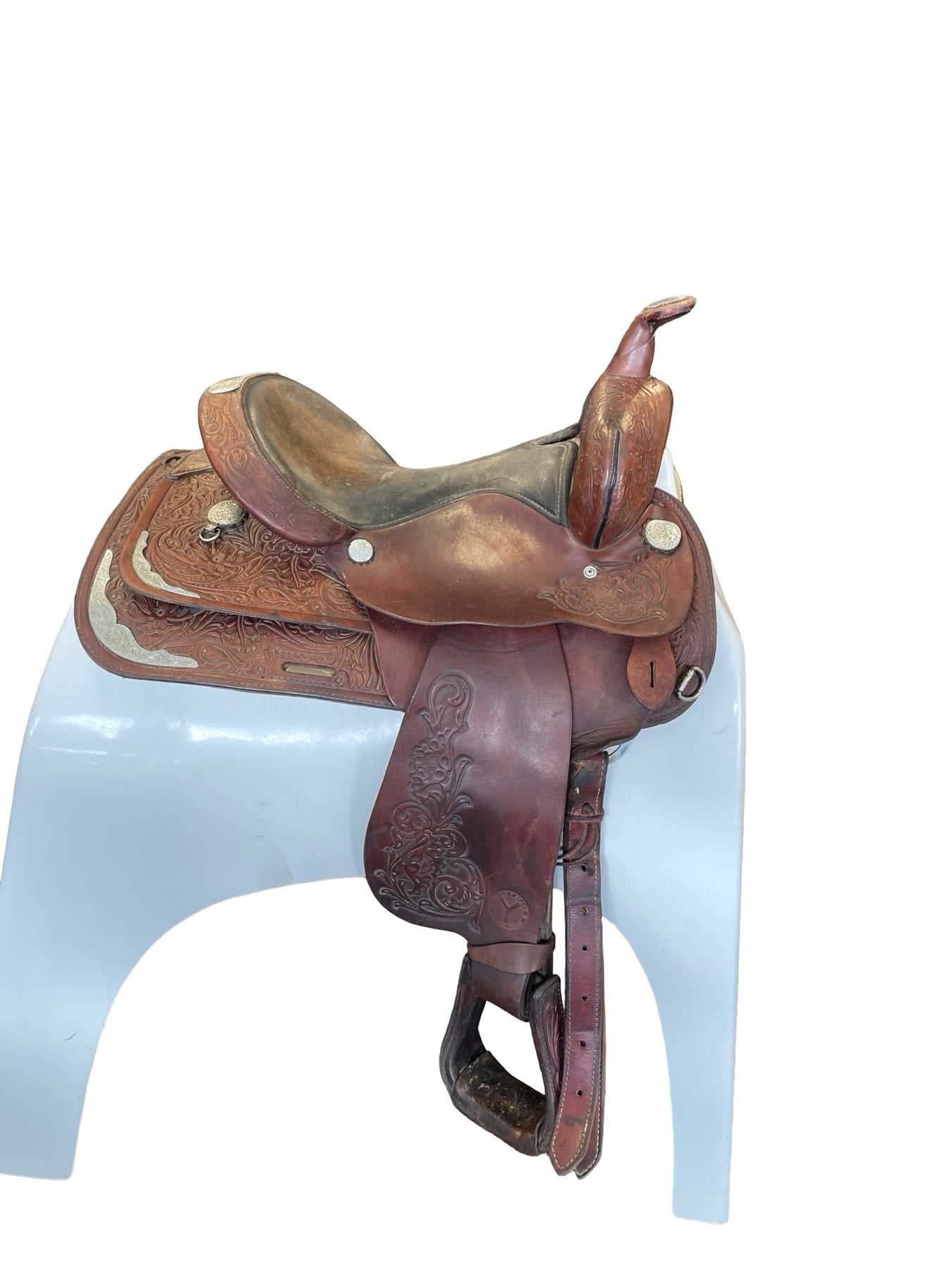 Pre-owned saddle for sale. This saddle is in fair condition. There are scuffs throughout. Seat shows much wear. Metal is rusted. Much wear around cap of the horn.