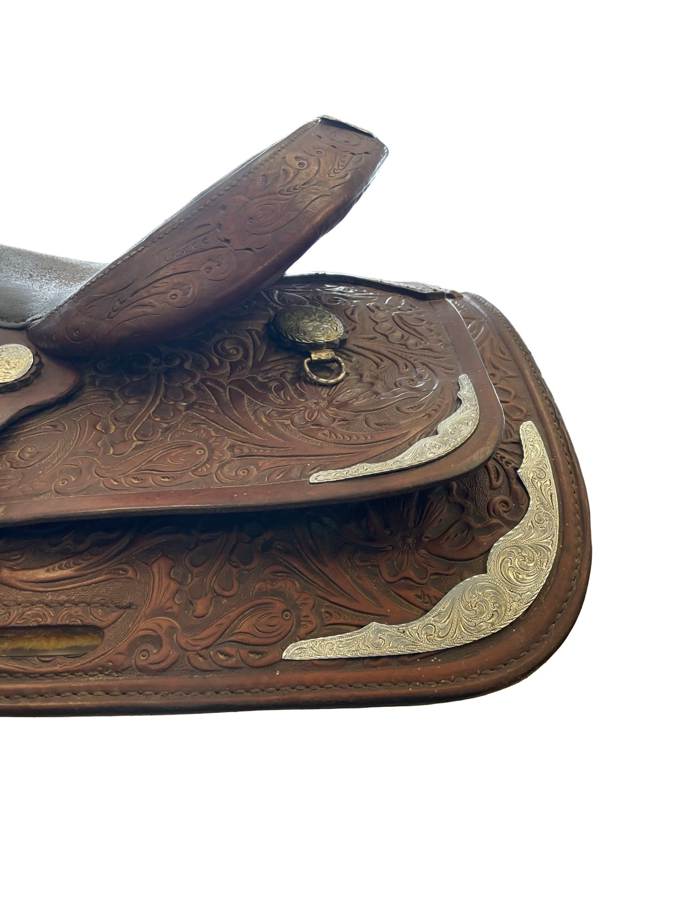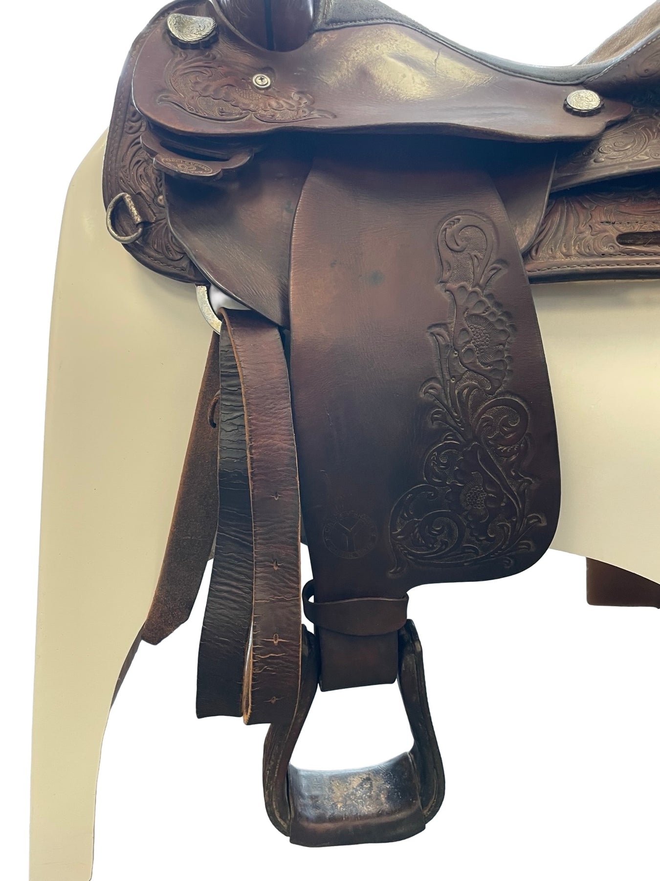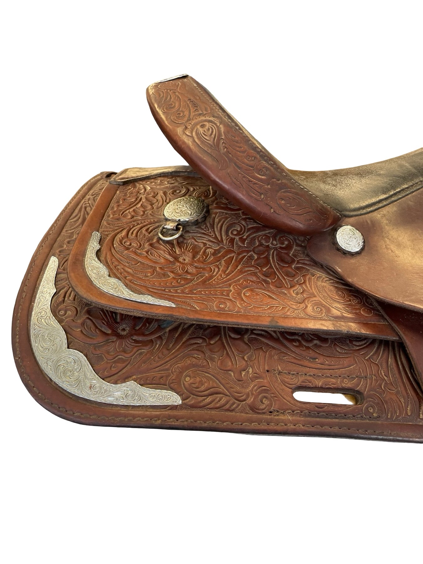 Pre-owned saddle for sale. This saddle is in fair condition. There are scuffs throughout. Seat shows much wear. Metal is rusted. Much wear around cap of the horn.