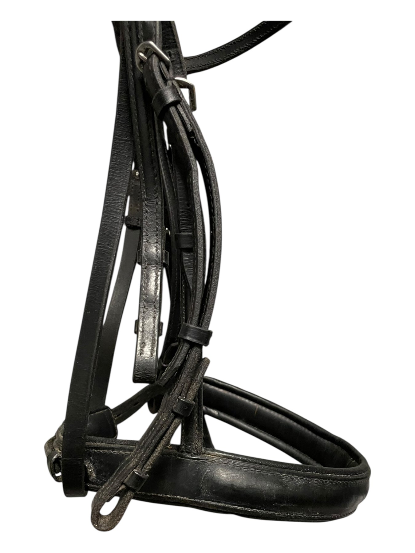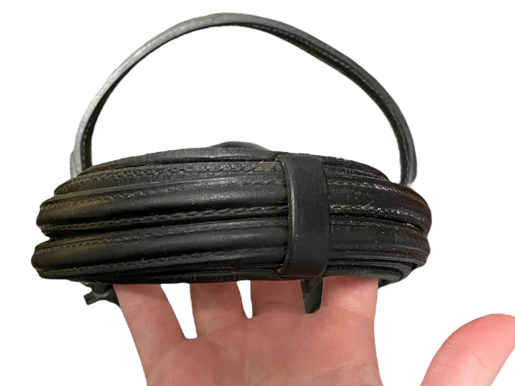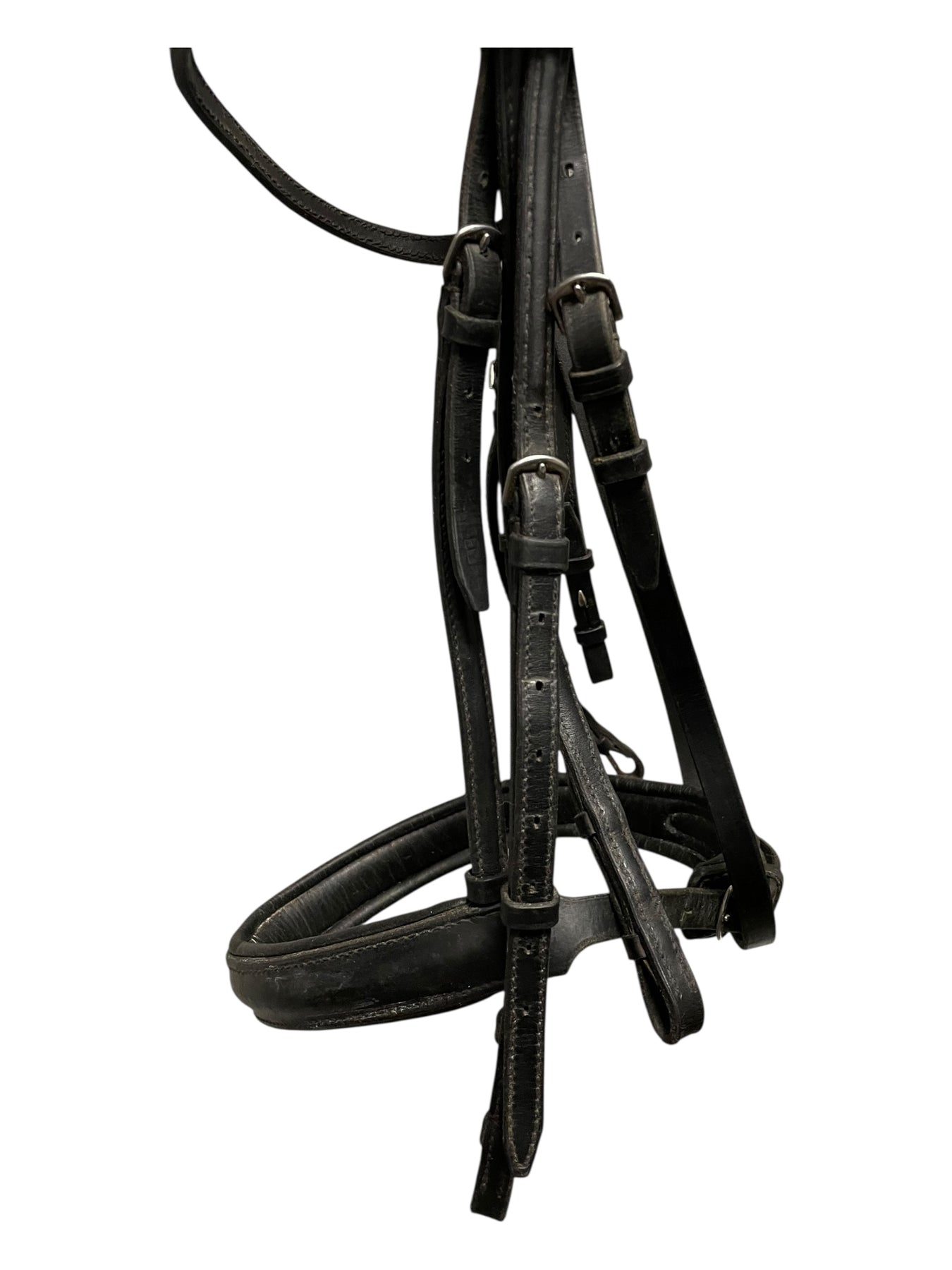 Condition: In fair condition, shows much regular wear and some age. Leather feels somewhat dry, and can be stiff in areas. Cracking here and there. Particularly worn on brow band. One of the two sets of reins has come undone on the edge, and the inner plastic is showing.