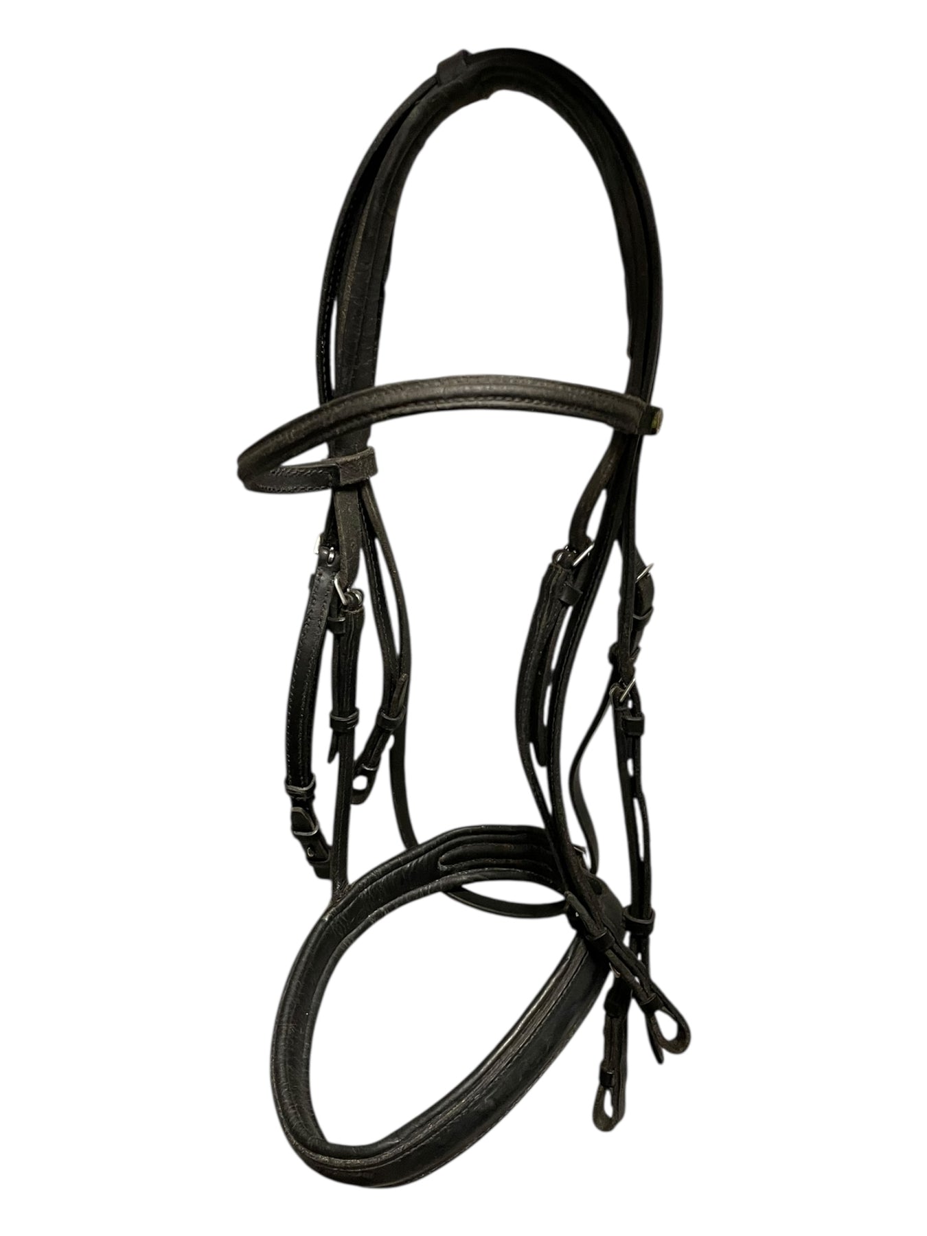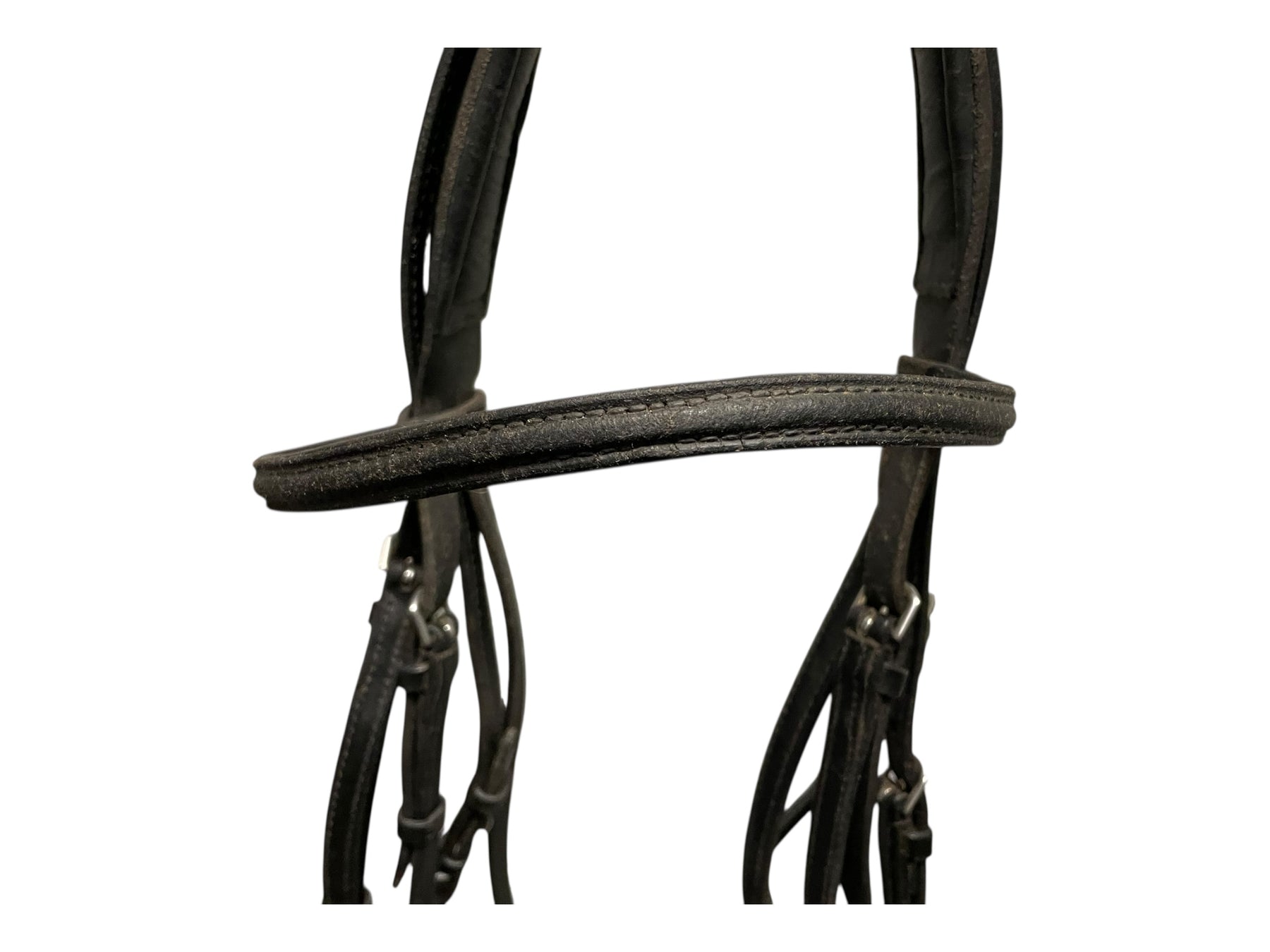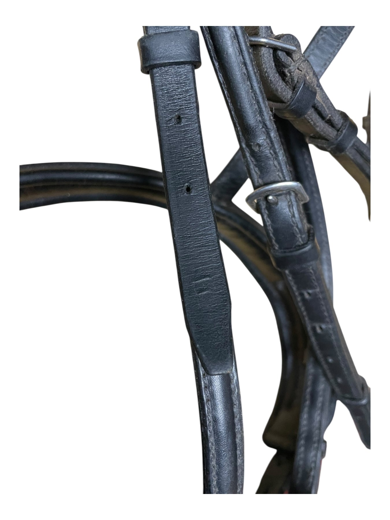 Condition: In fair condition, shows much regular wear and some age. Leather feels somewhat dry, and can be stiff in areas. Cracking here and there. Particularly worn on brow band. One of the two sets of reins has come undone on the edge, and the inner plastic is showing.