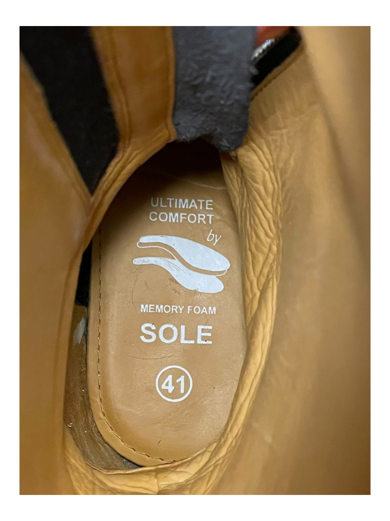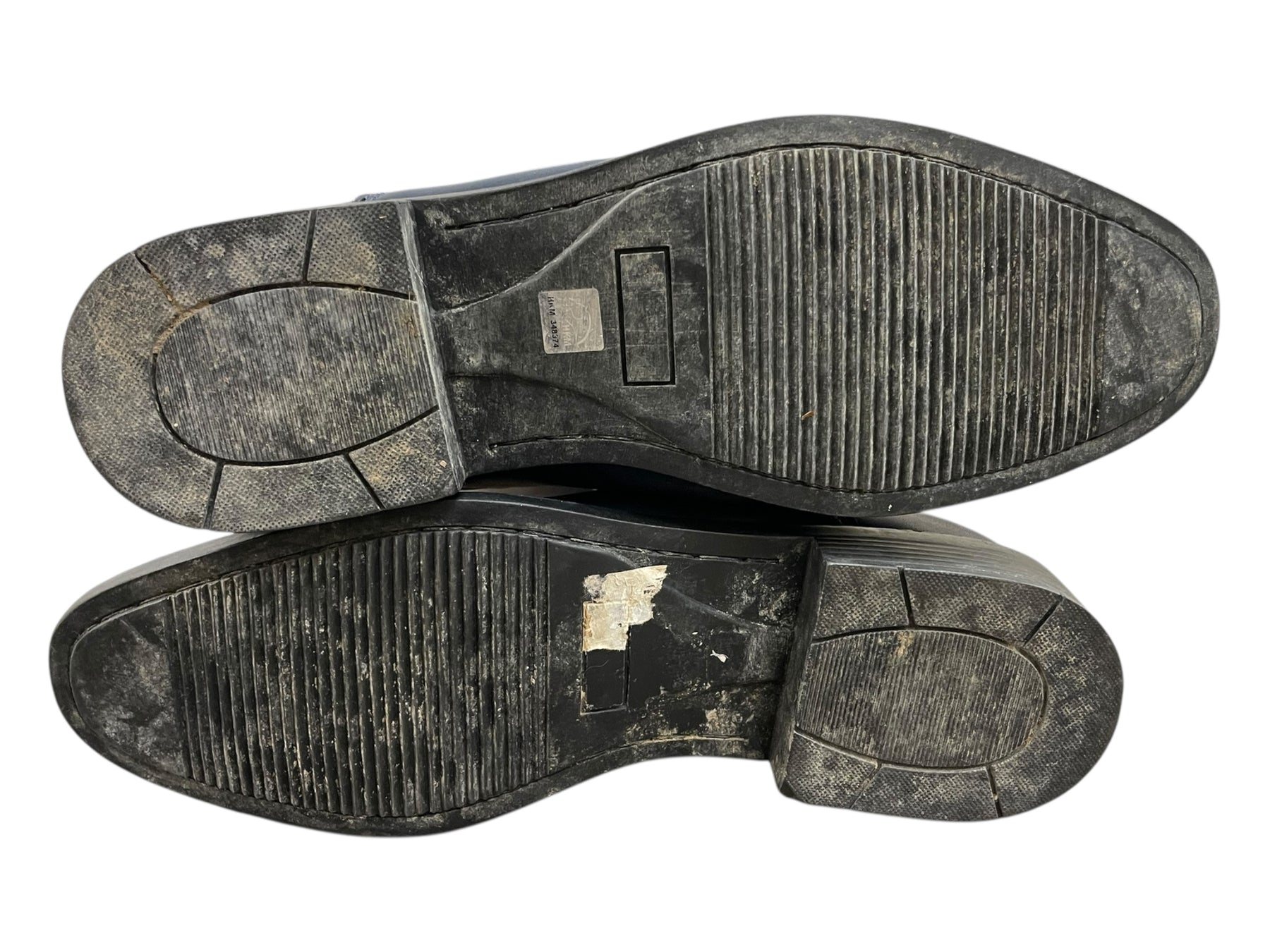 Condition: In overall good used condition. Some faint scuffs can be seen on outer and inner legs and toe caps - while they will likely buff out a bit with some cream and polish, it cannot be guaranteed. Zippers function well, and feel and look to be in good condition. There's some light wear on inner calves, which is normal and expected of used tall boots. Some light dirt on outer soles.