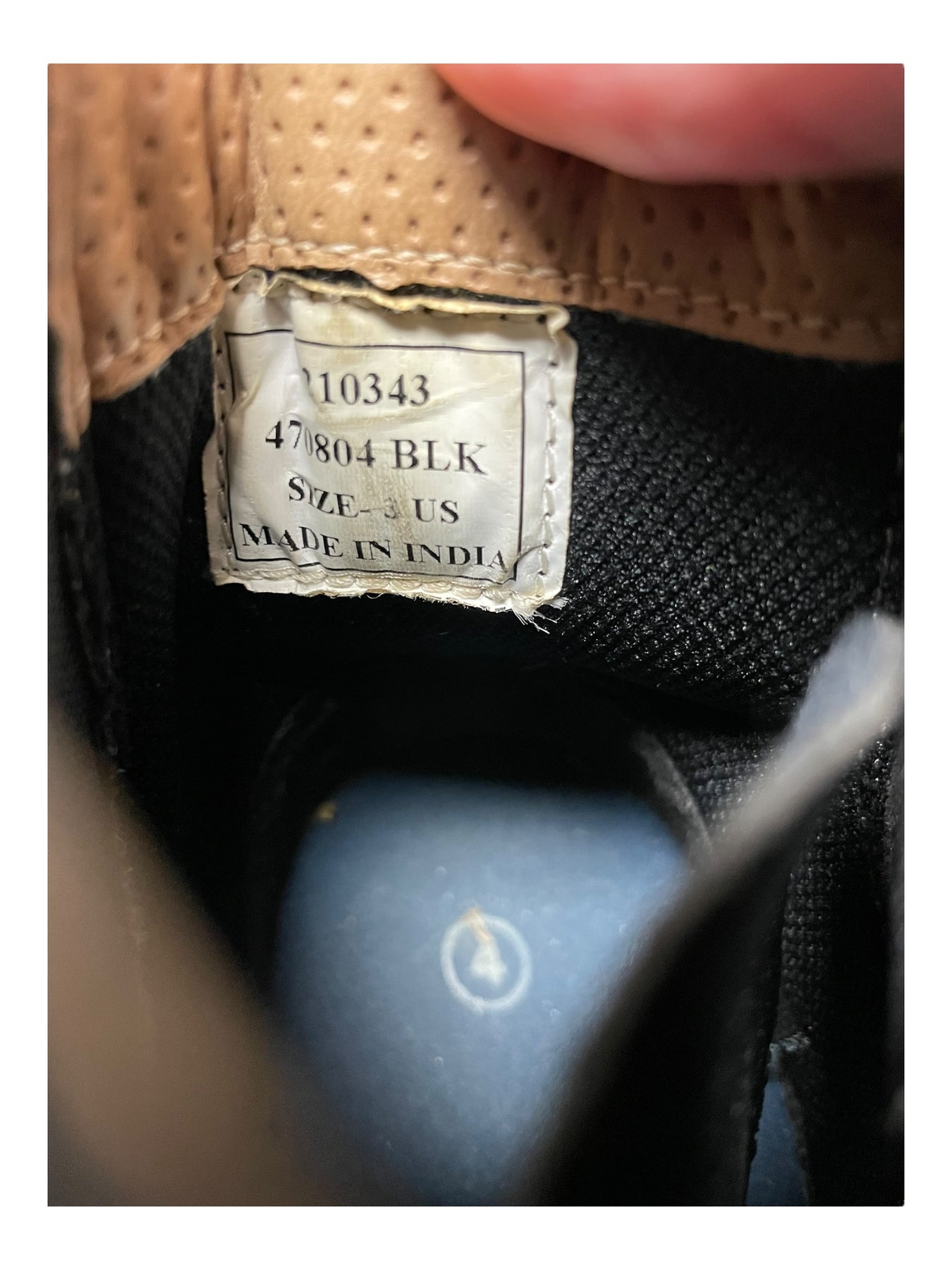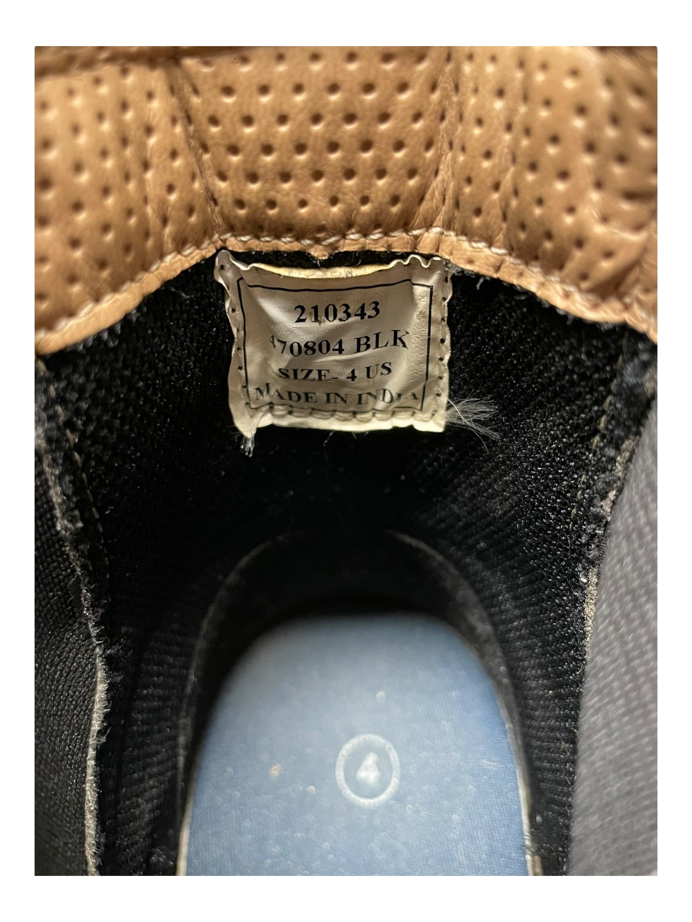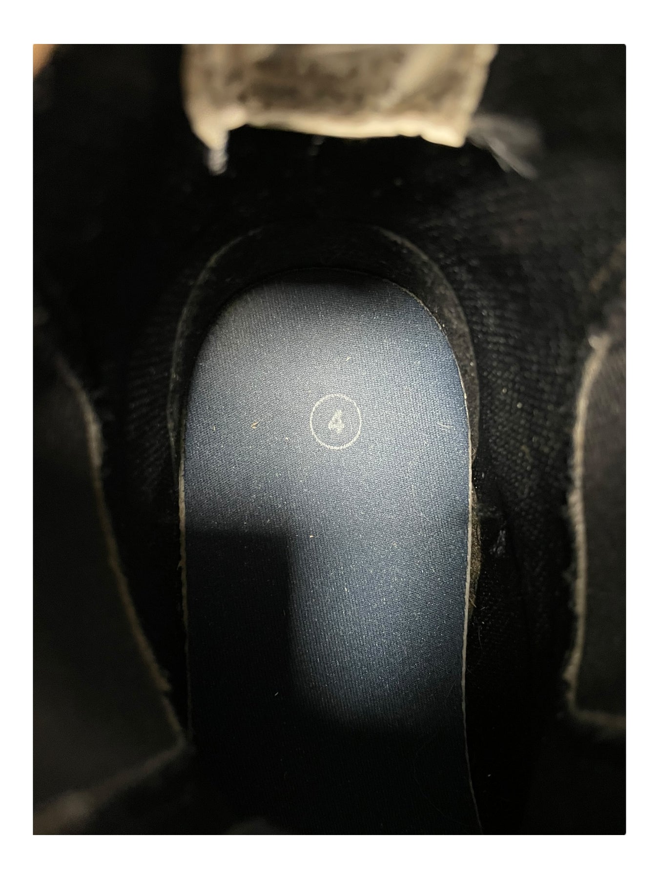 Please be aware that one boot has an incorrect tag on the inside, labeling it as a 3 - this was likely a mistake made during manufacturing. Both boots are stamped "4" on the foot bed, and both measure the exact same length.