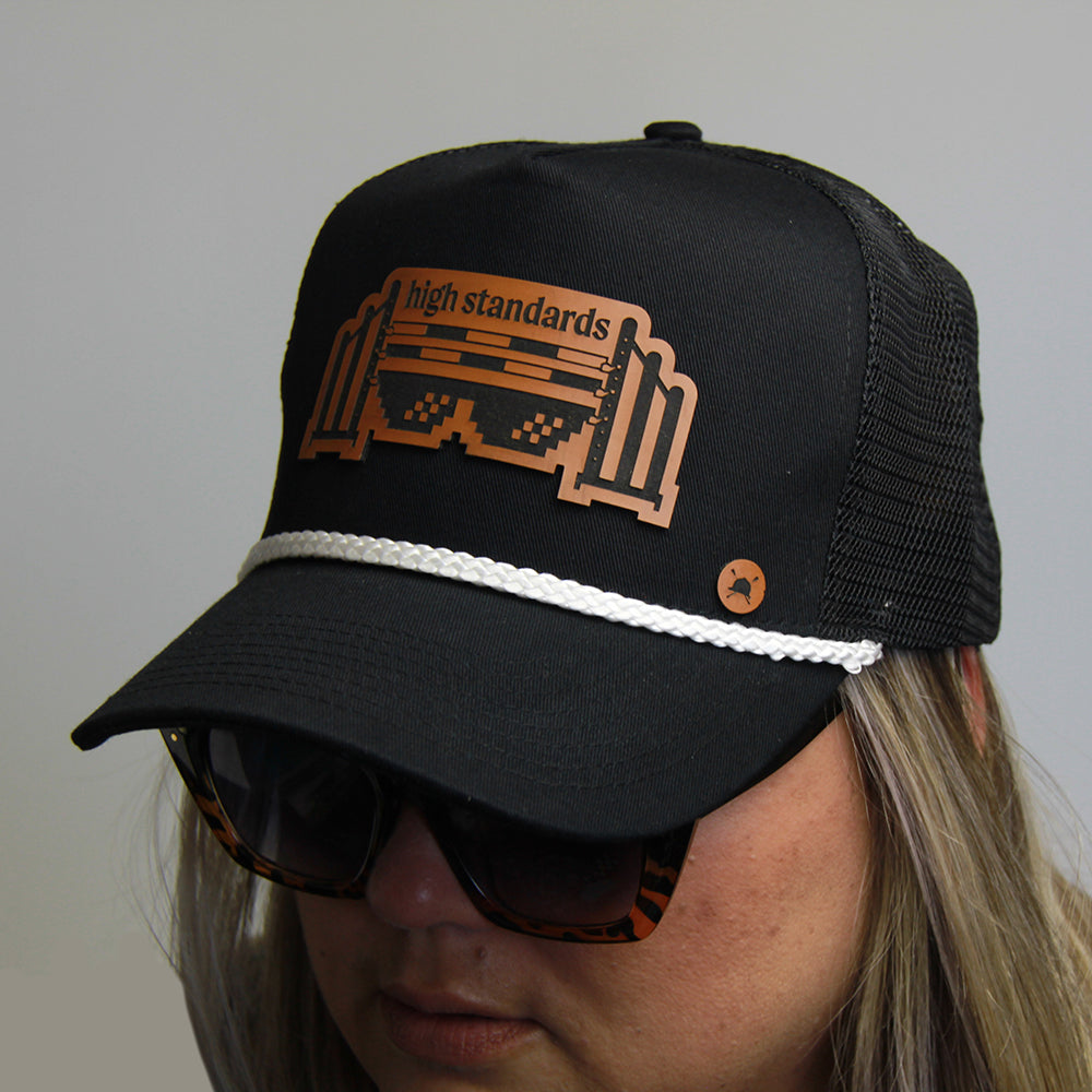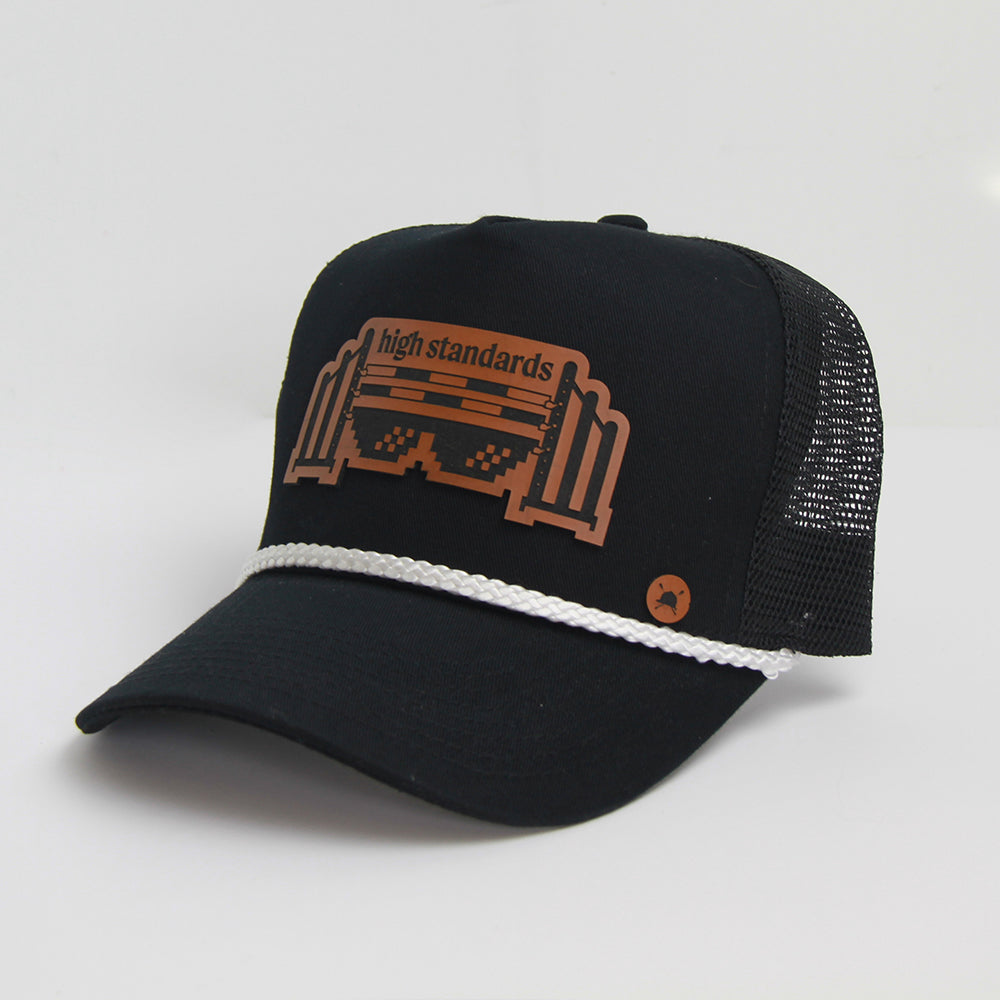 Keep those standards high, both in life and the ring. Trucker hat with chestnut leatherette patch and adjustable back closure. Patches designed, made and hand-pressed in Los Angeles.