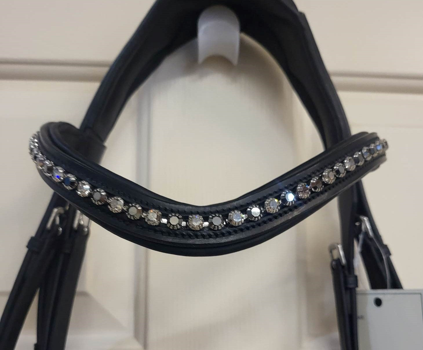 Featuring an ergonomic flash crank noseband, soft padded anatomic uni-crown headstall, and a curved graphite and silver crystal browband; ½” cheeks, pin end. Sold without reins. The crown on this new bridle features our new “softer”, less dense padding.