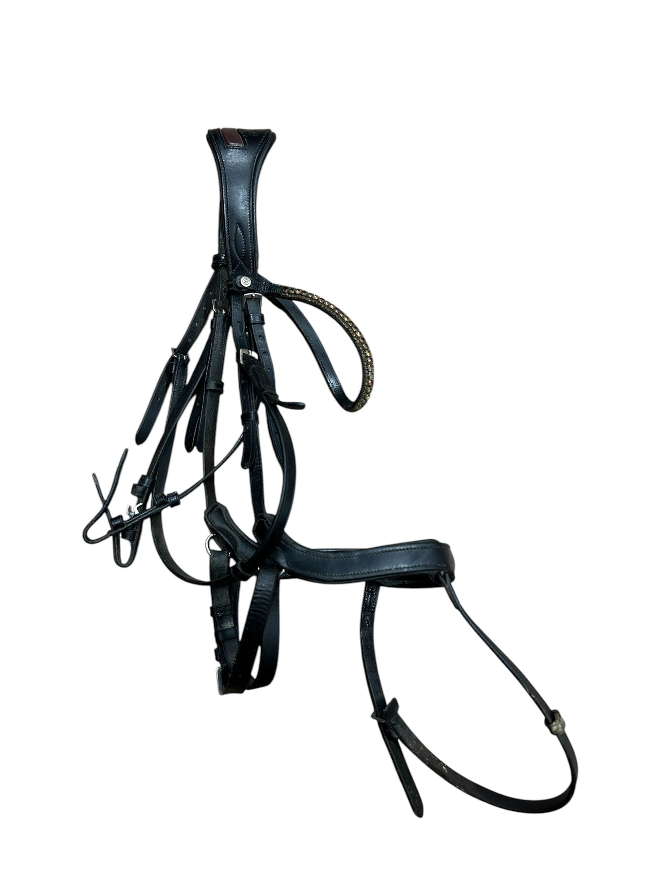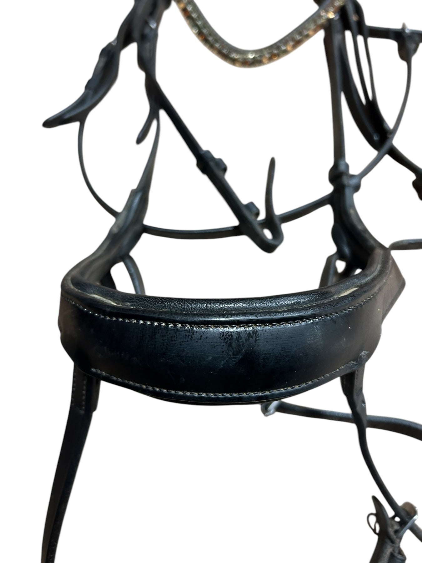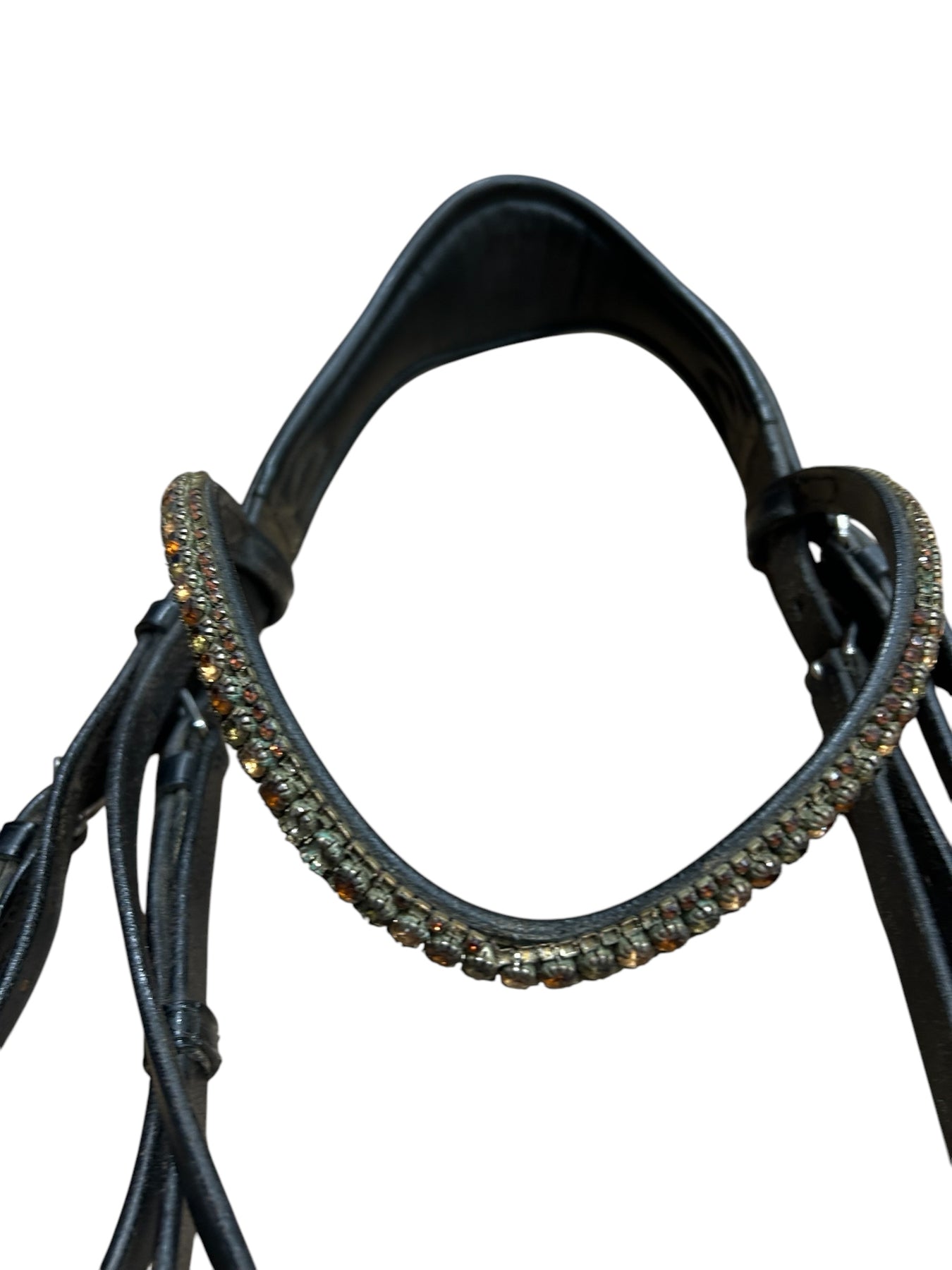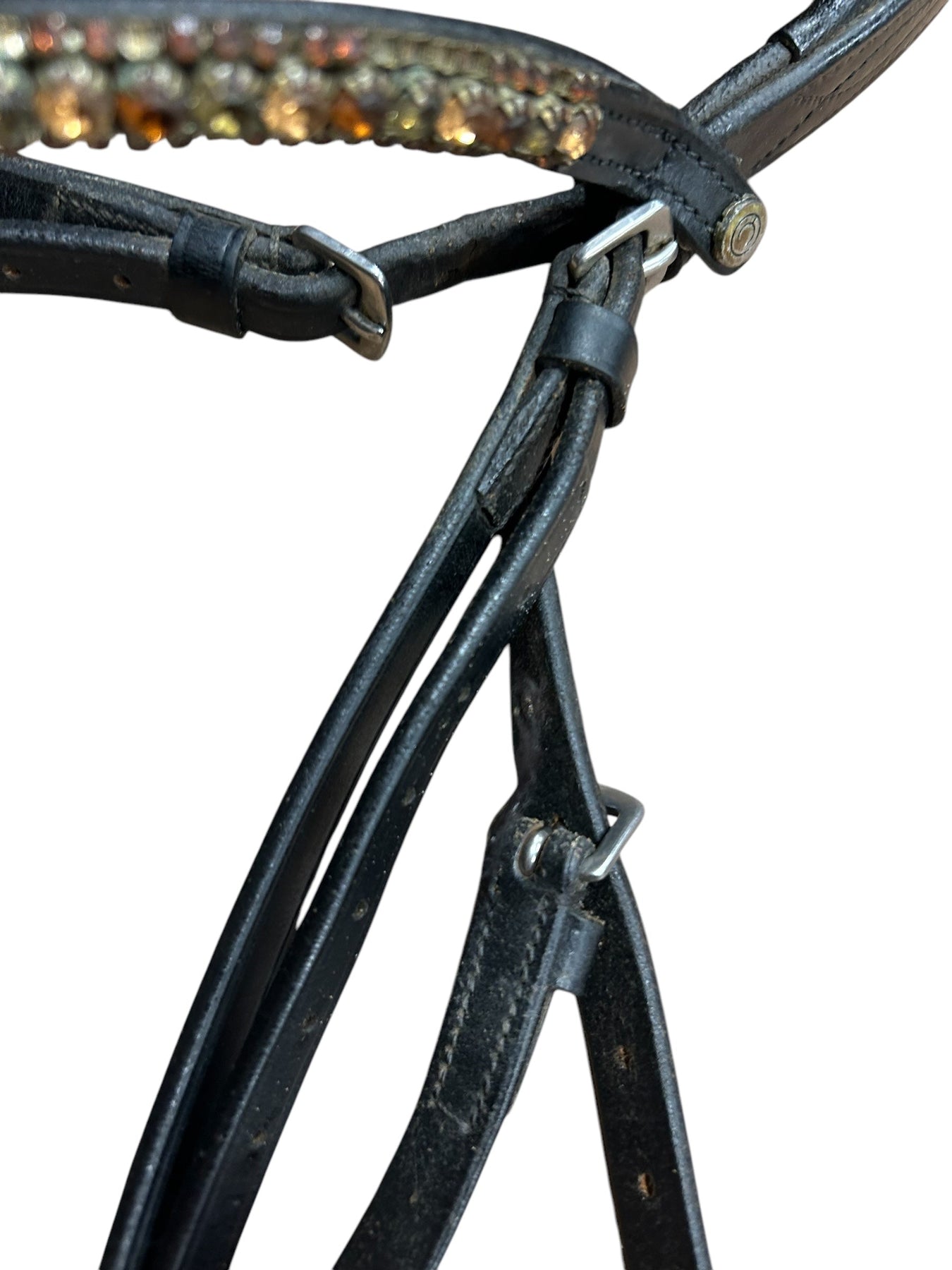 Condition: In fair condition. Well used. Shows MUCH regular wear. Missing crank pad. Leather is discolored and cracked in places. Some loose threads. Browband is a Montar browband, it is missing crystals.
