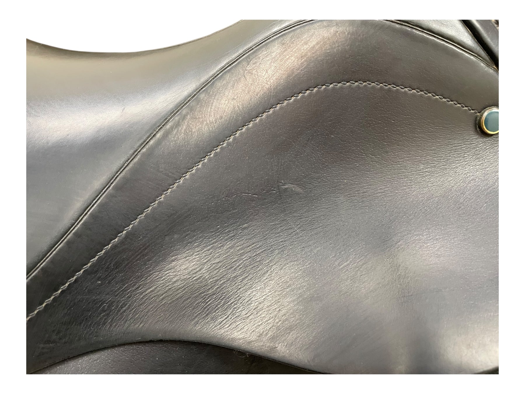 Condition: In good used condition with several purely cosmetic blemishes. Shows a normal amount of wear expected for a used saddle. There are several indentations along the edge of the cantle, on the seat itself, and on the skirt. There are some fainter scuffs/scrapes here and there on the saddle. The panels are faded and have more of a brown tone.