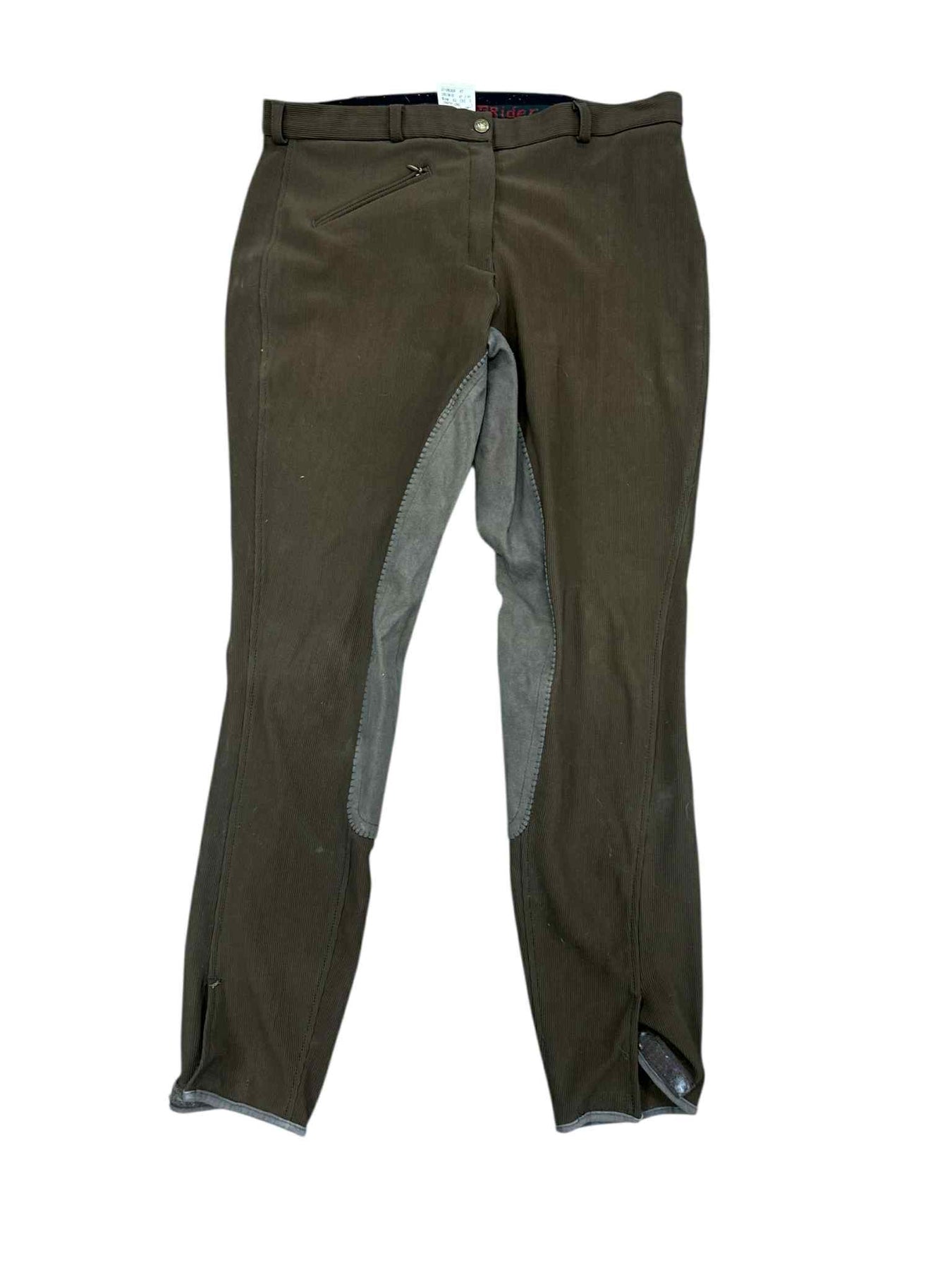 Condition: In fair condition. Shows normal wear for a breech of it's age. Older style micro cord full seat breeches with clarino style full seat and velcro bottoms. Loose and popped threads.